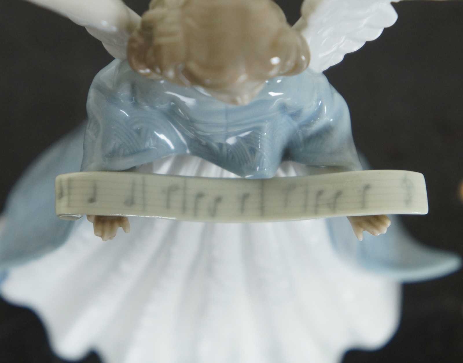 Lladro Spain porcelain figurine #5831, Christmas angel tree topper holding a scroll of music and wearing a blue mantle.