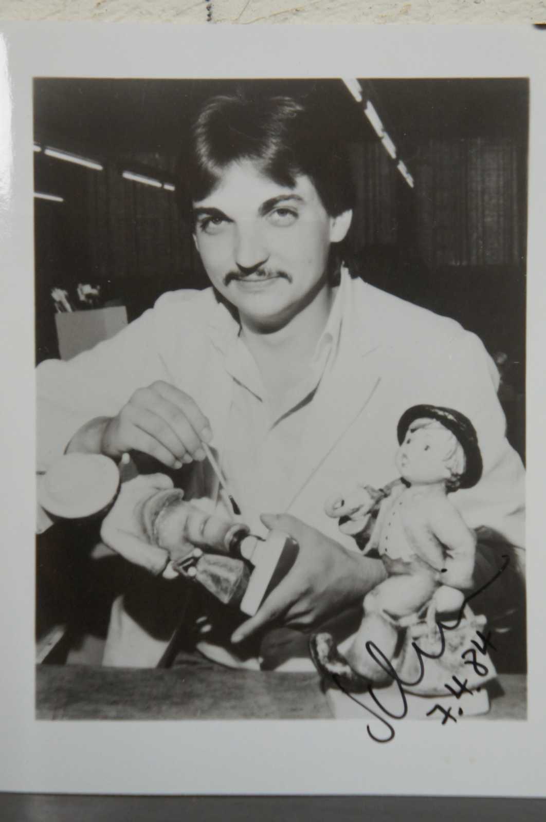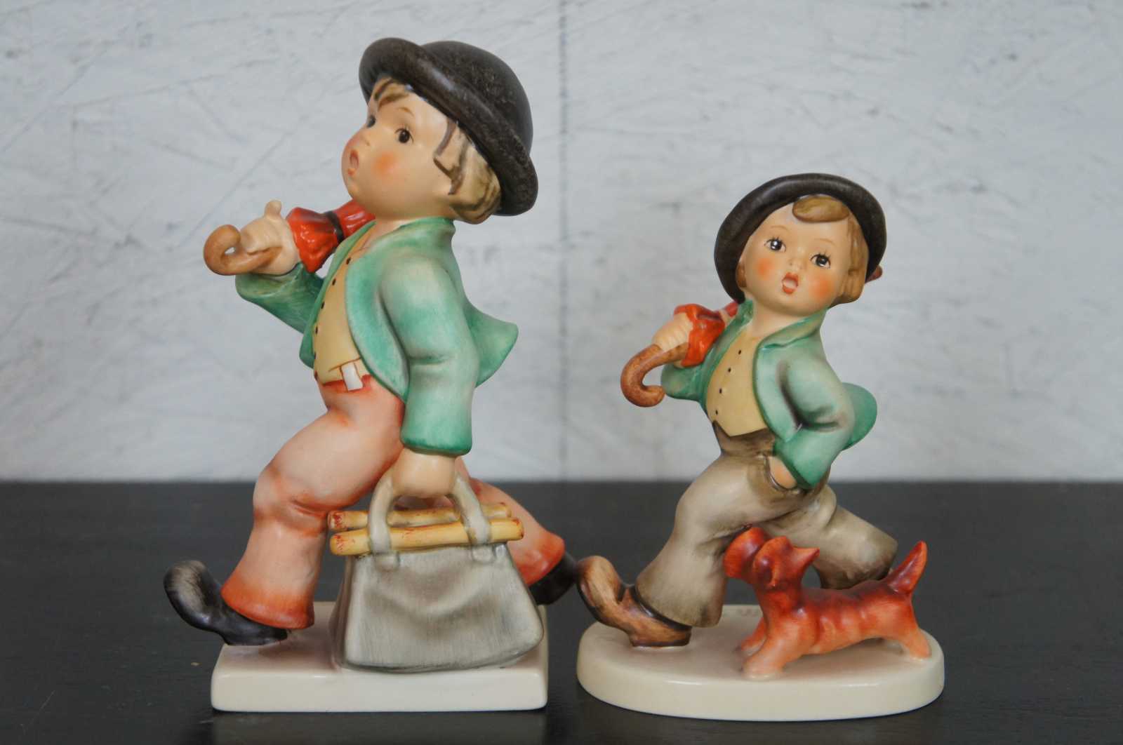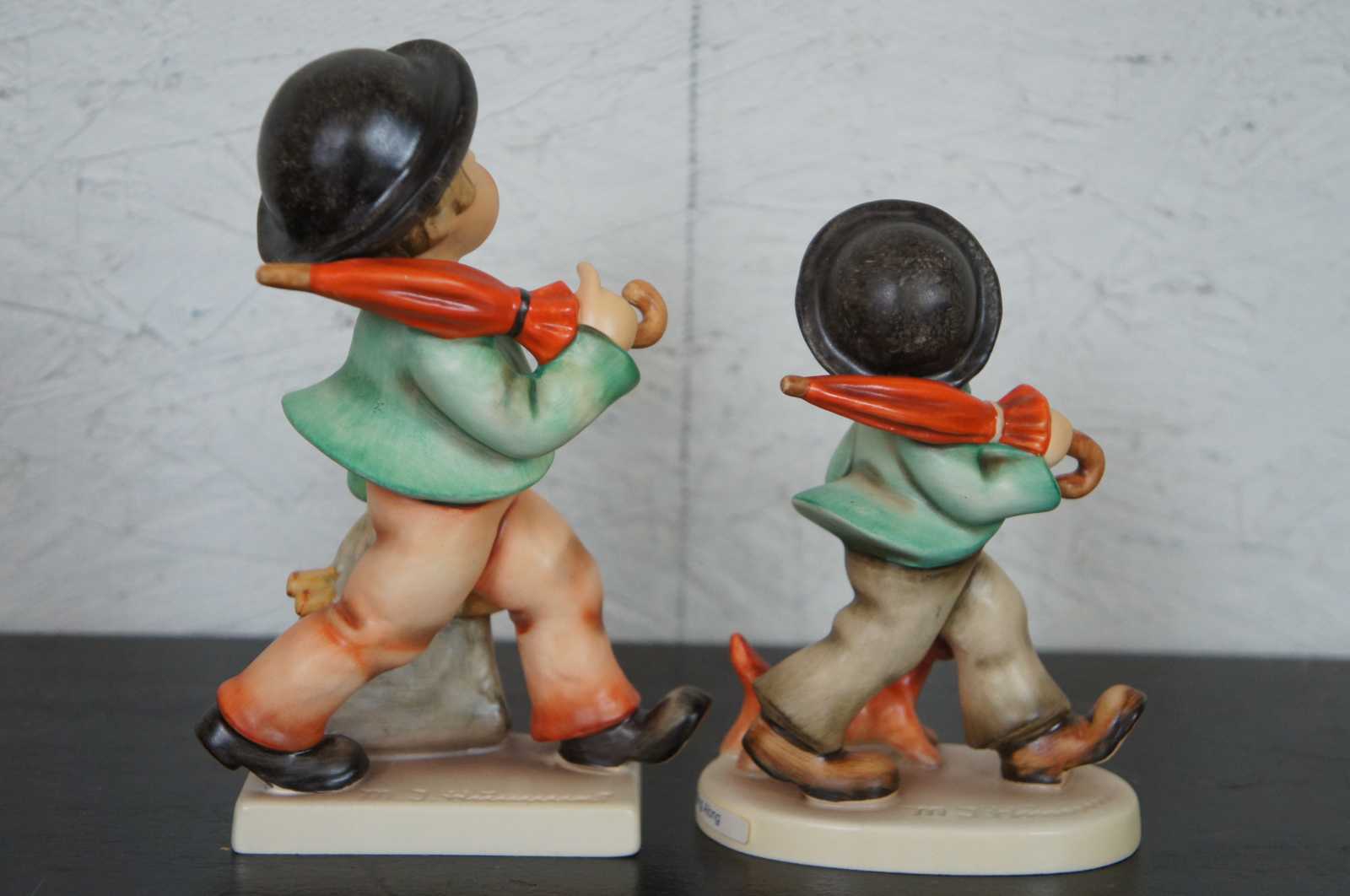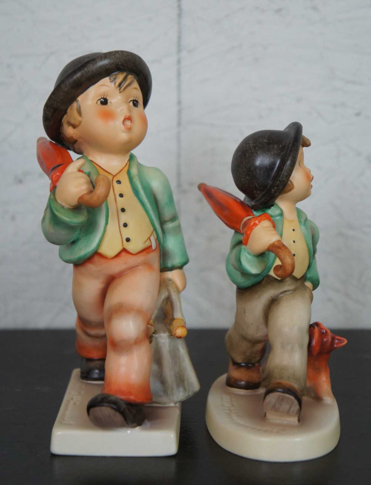 Goebel West Germany 1984 ceramic figurine pair, Merry Wanderer and strolling Along, both signed and dated by the artist, photographed while painting another figure with his signed Merry Wanderer in the foreground (photo included).