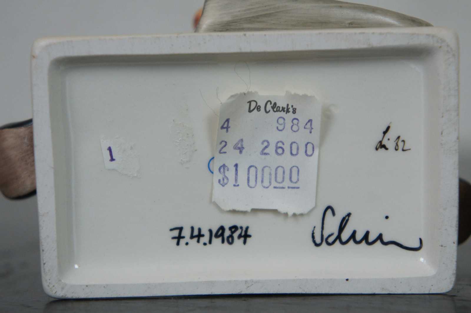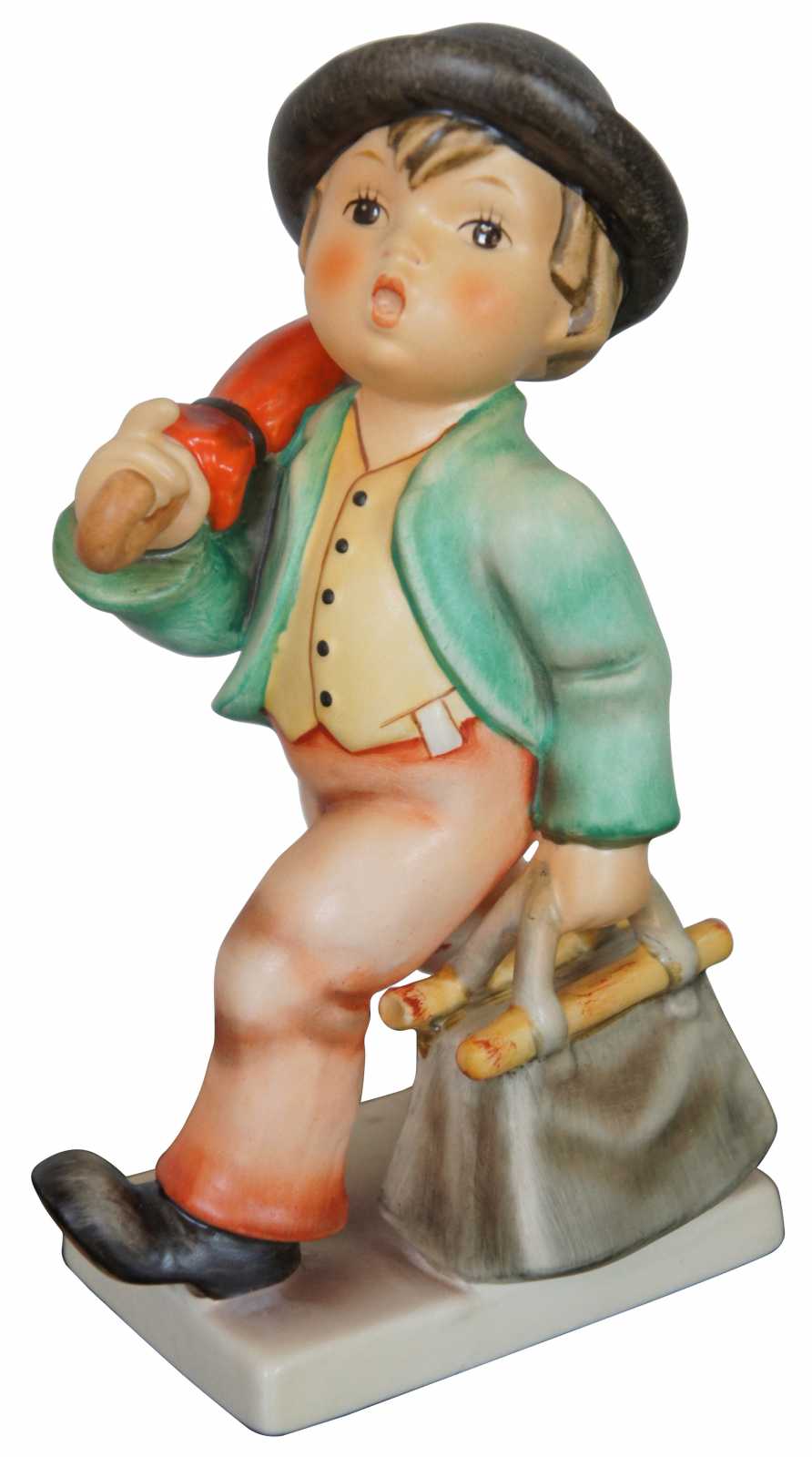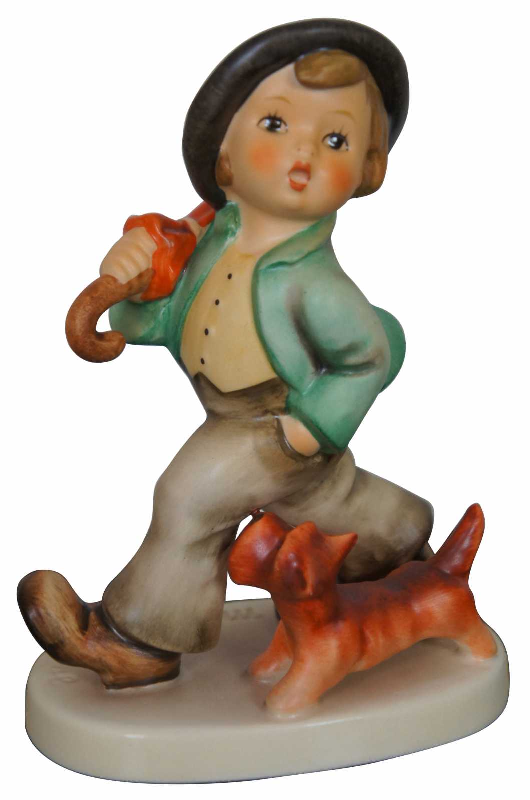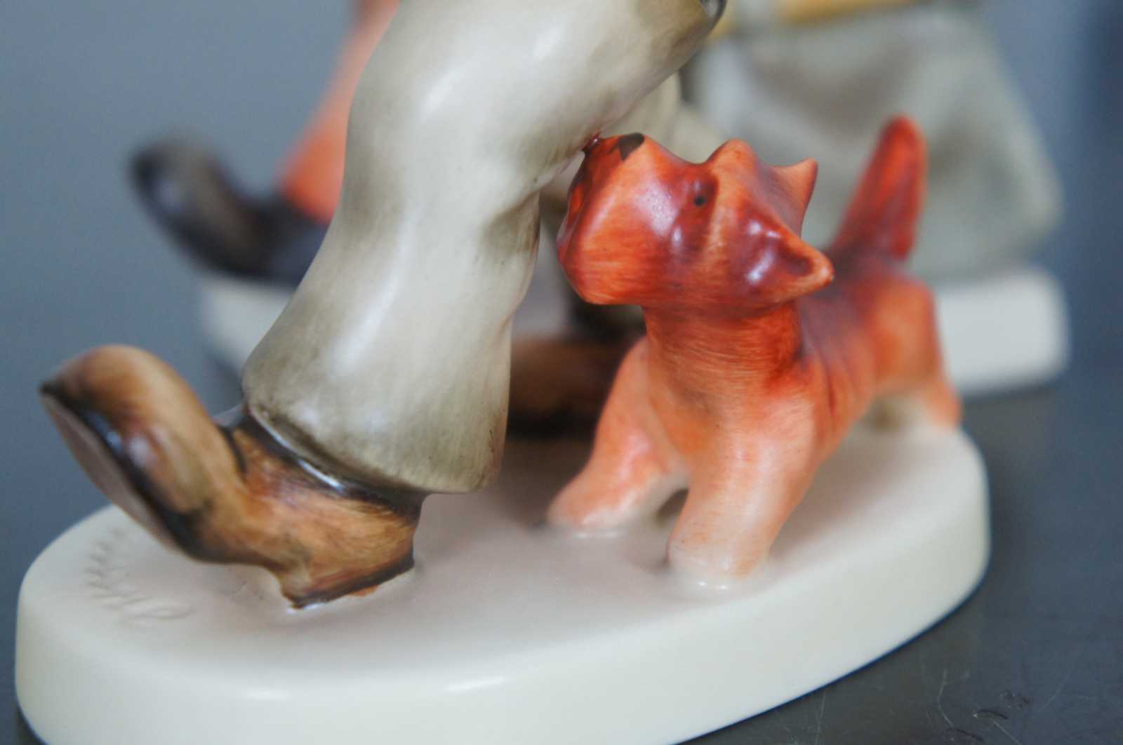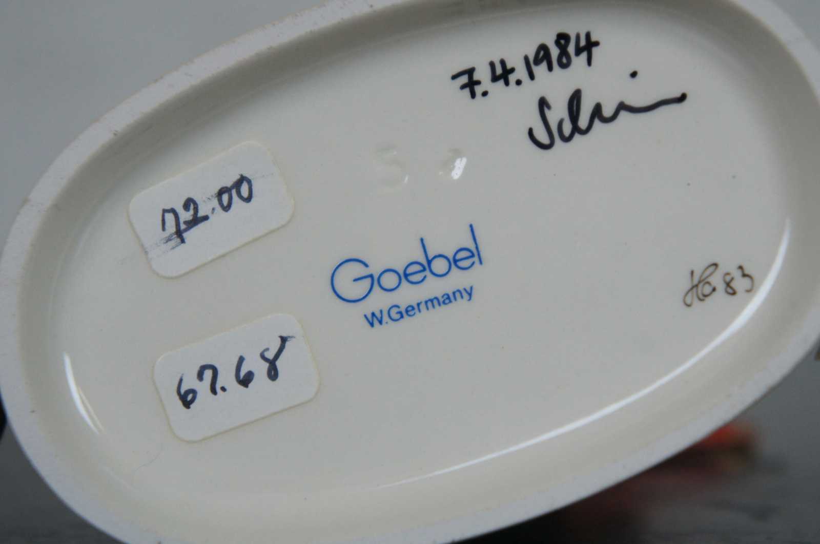 Goebel West Germany 1984 ceramic figurine pair, Merry Wanderer and strolling Along, both signed and dated by the artist, photographed while painting another figure with his signed Merry Wanderer in the foreground (photo included).