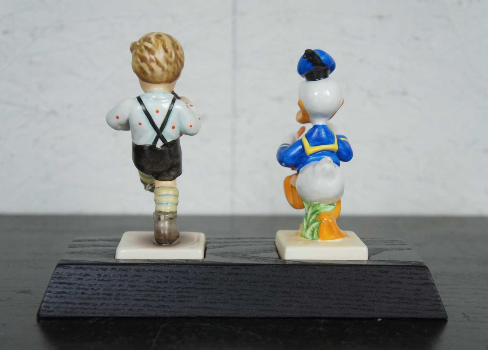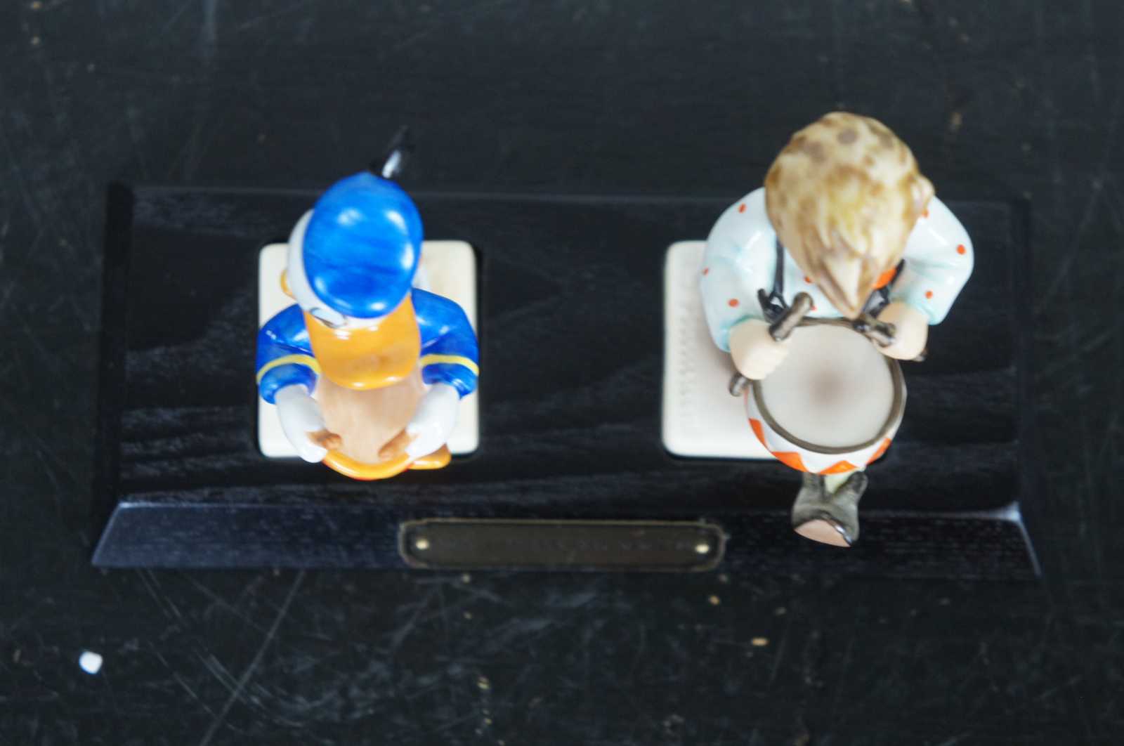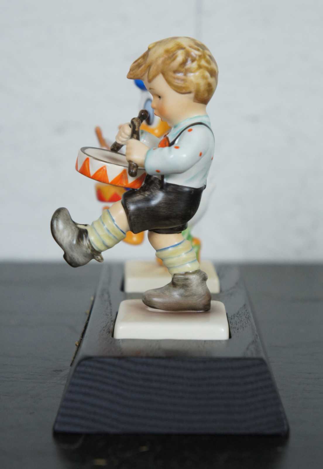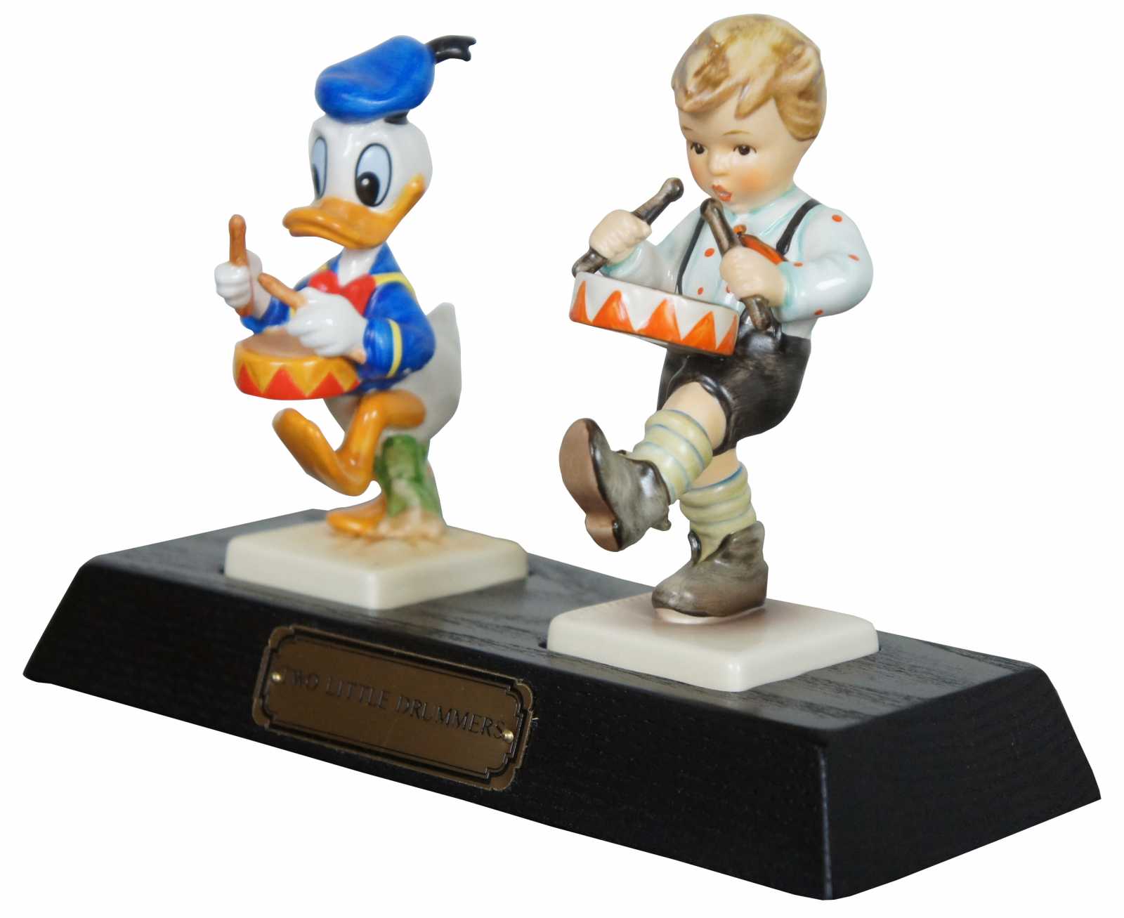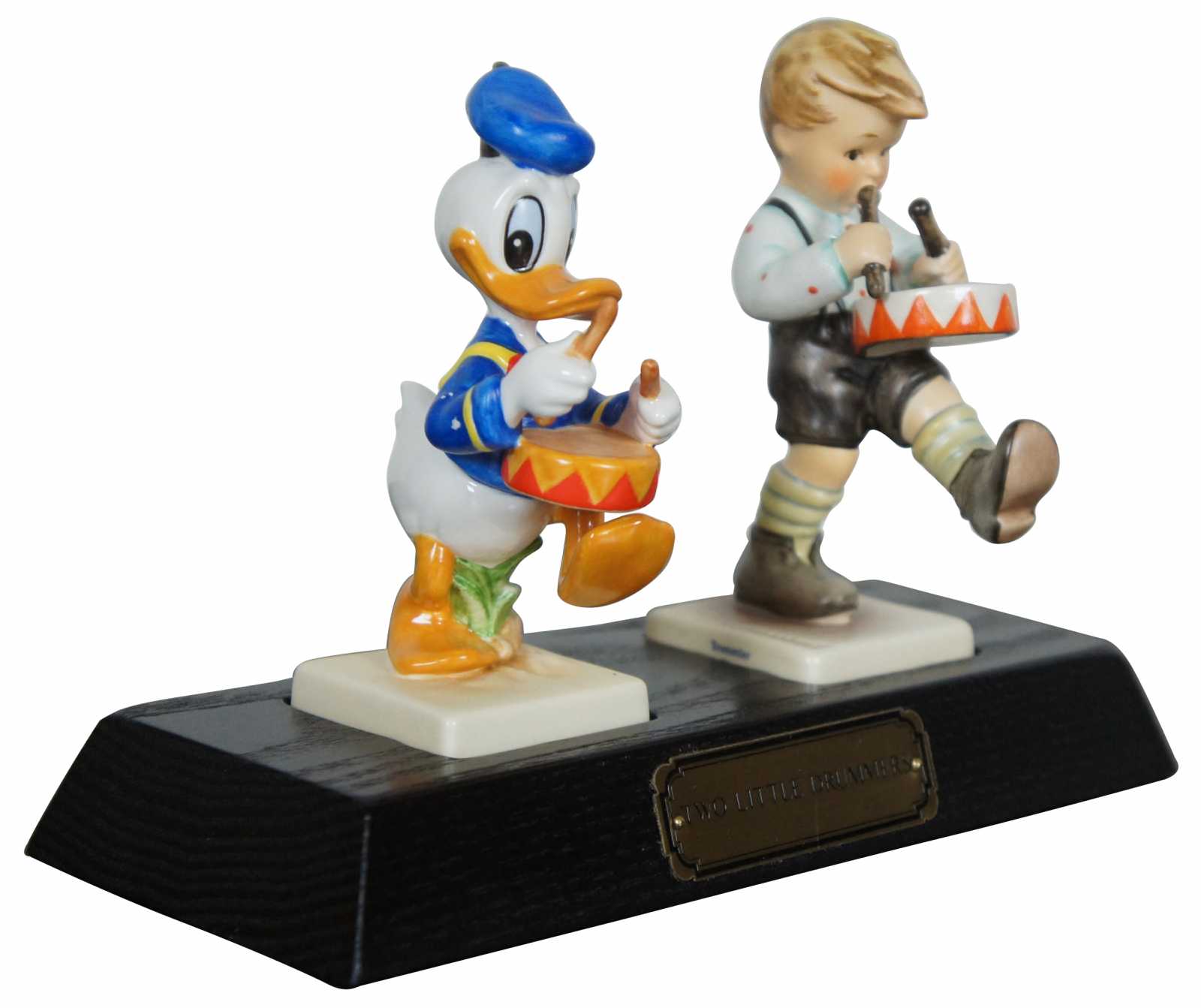 Goebel Germany limited edition ceramic figurine set – Two Little Drummers – featuring a black wood base holding the original Little Drummer aka Trommler and Donald Duck as the Little Drummer, numbered 0996/1500.