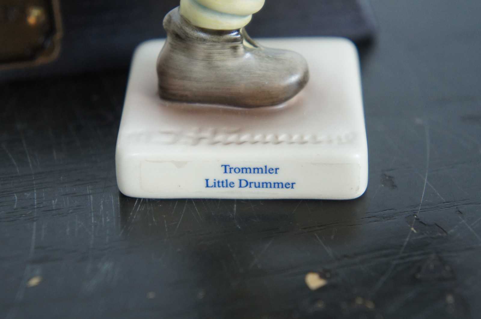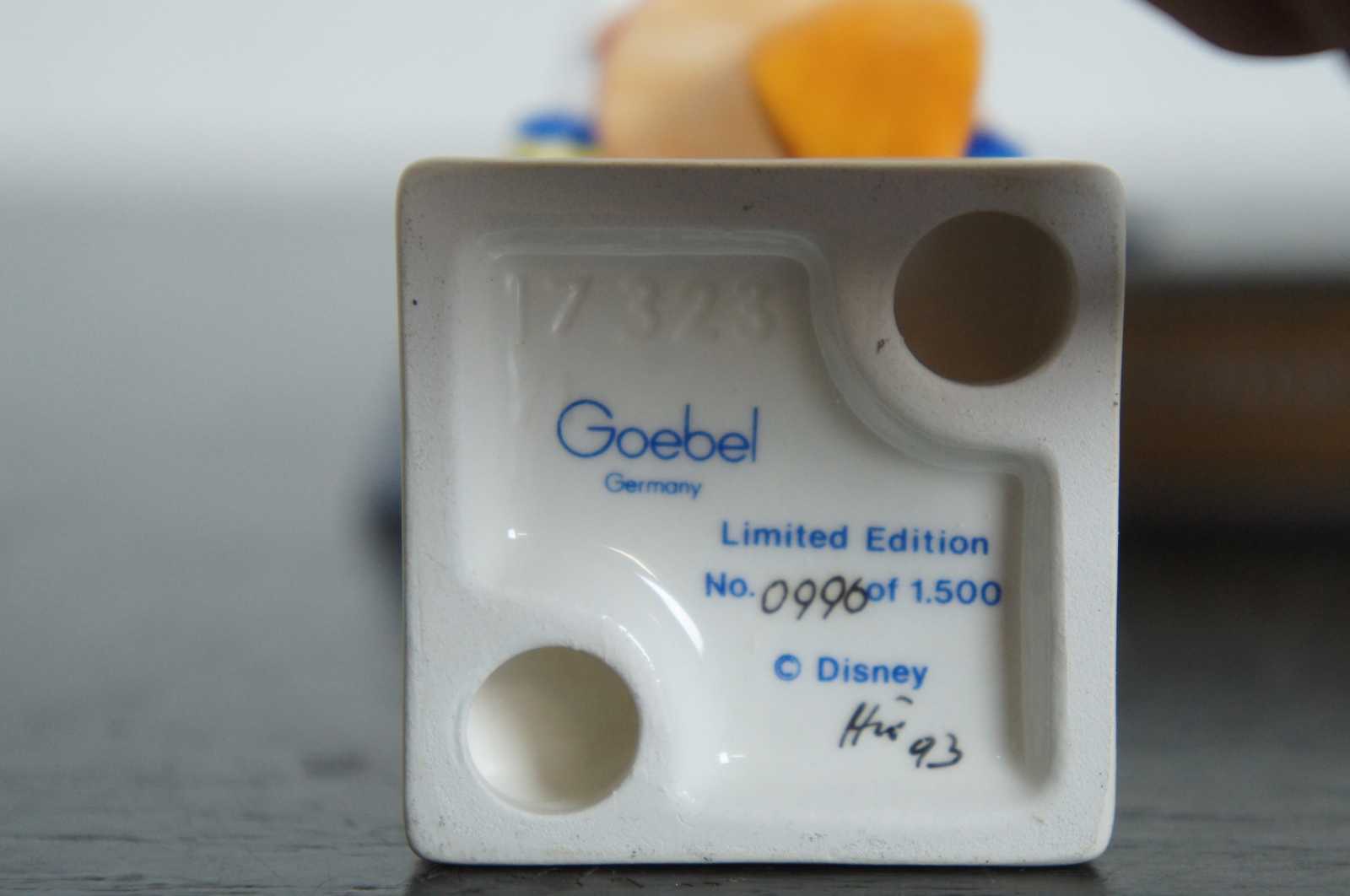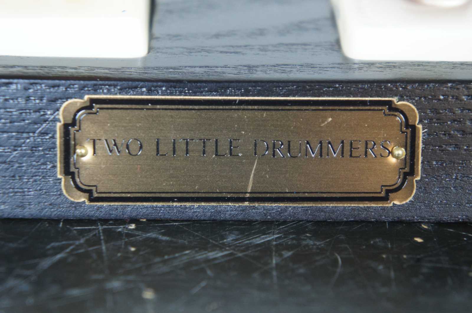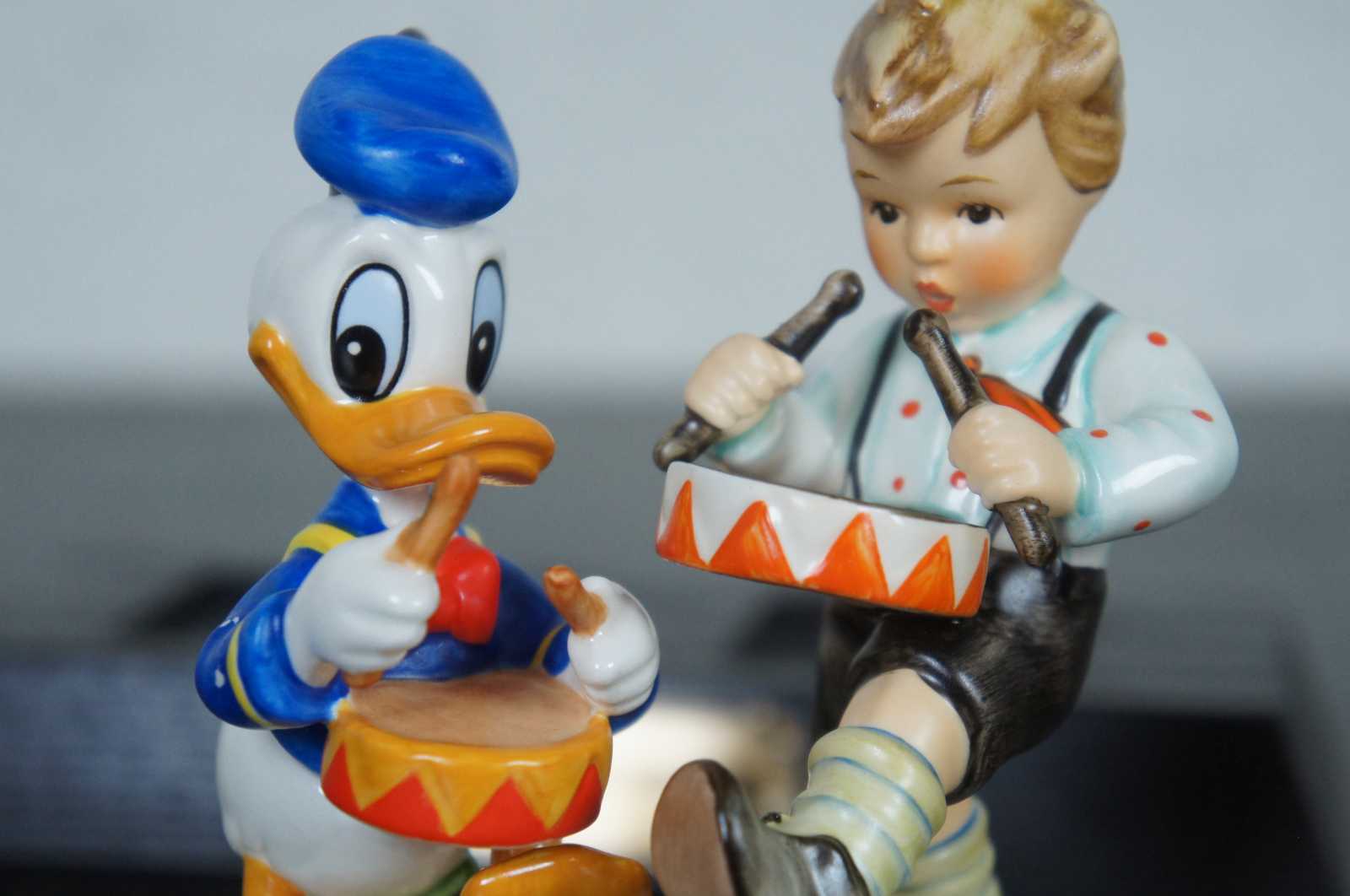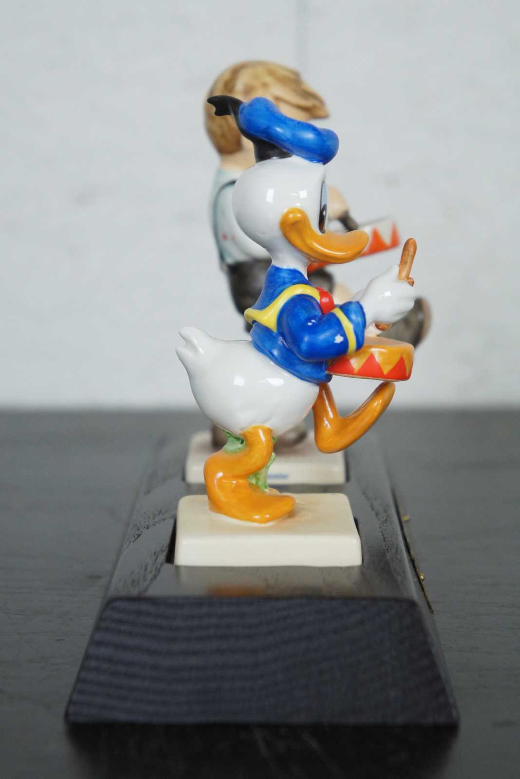 Goebel Germany limited edition ceramic figurine set – Two Little Drummers – featuring a black wood base holding the original Little Drummer aka Trommler and Donald Duck as the Little Drummer, numbered 0996/1500.