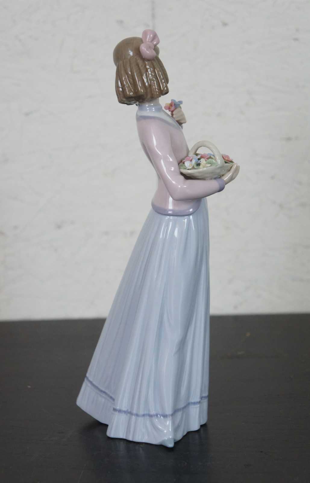 Lladro Spain 1996 Collector’s Society porcelain figurine #7644 – Innocence in Bloom, portraying a young woman with sausage curls, a pink hair bow and cardigan holding a small basket of flowers.