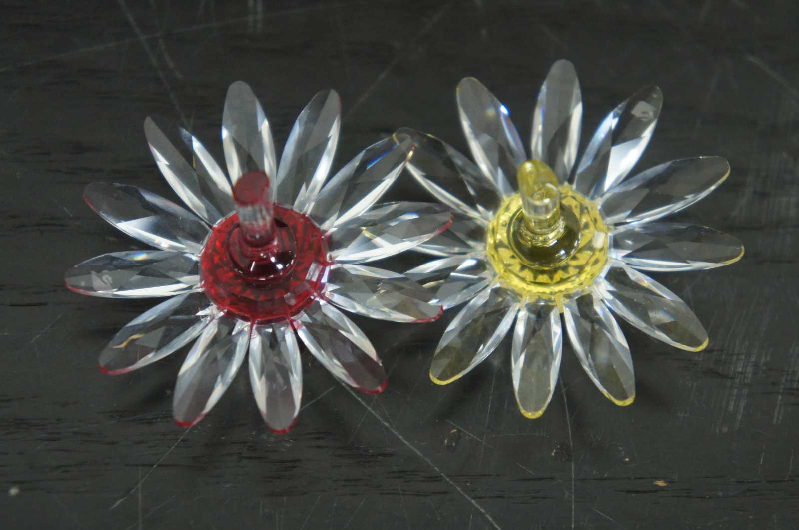 Two Swarovski crystal renewal gift Marguerite Daisy figurine cake toppers with red and yellow centers.