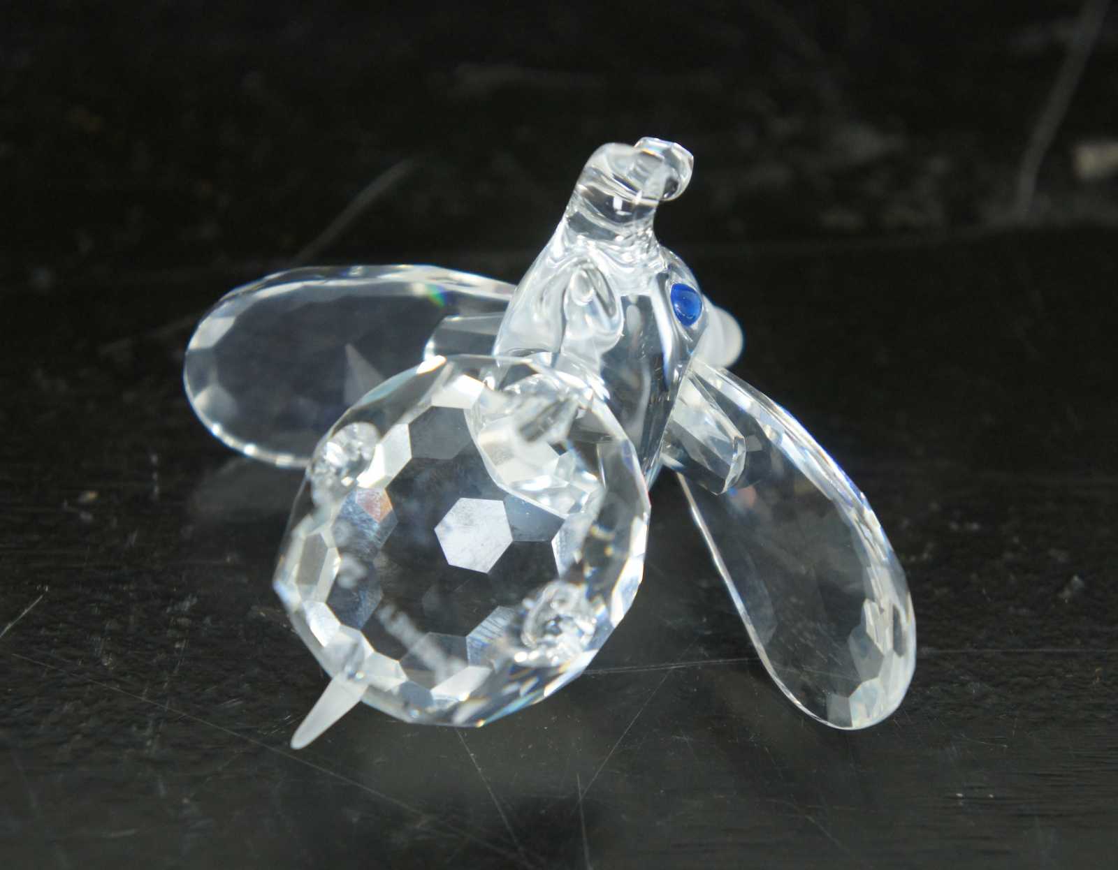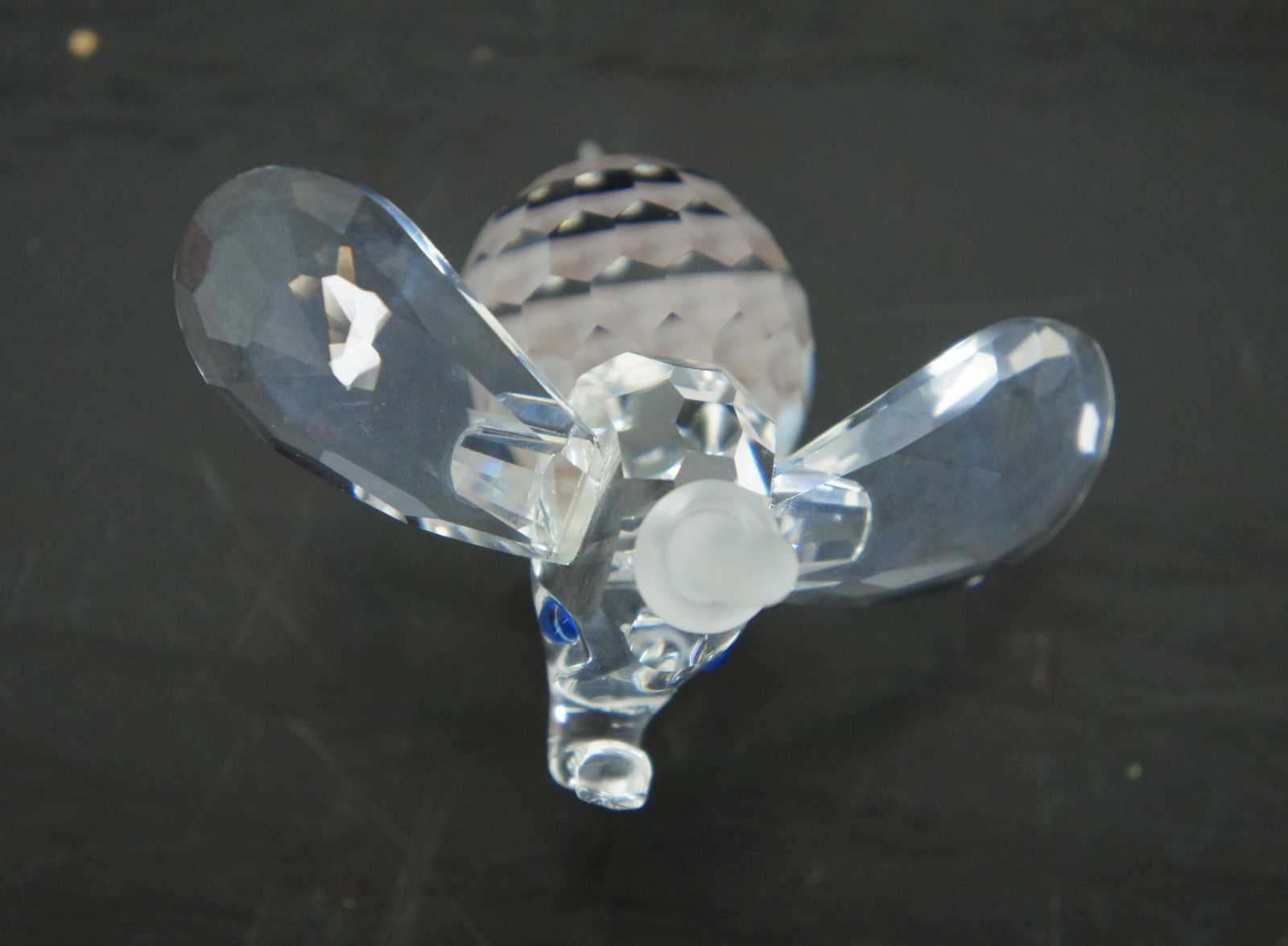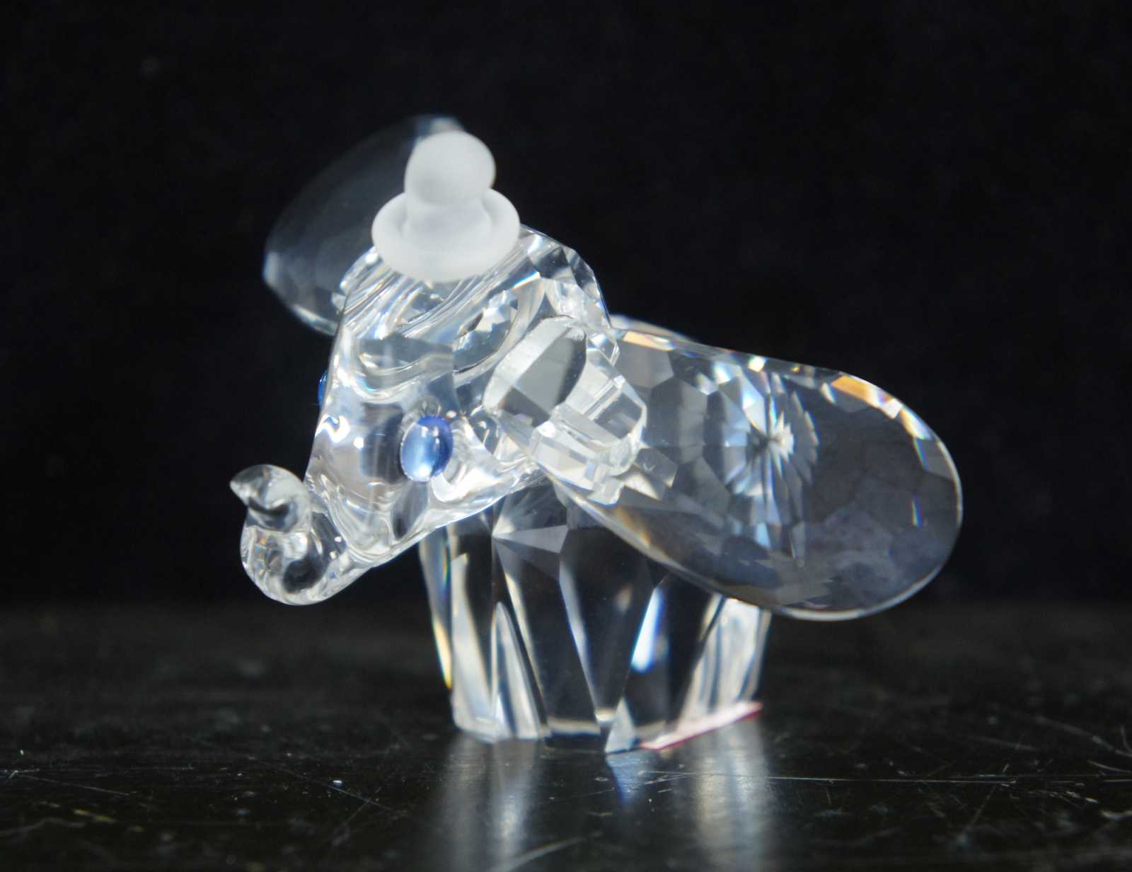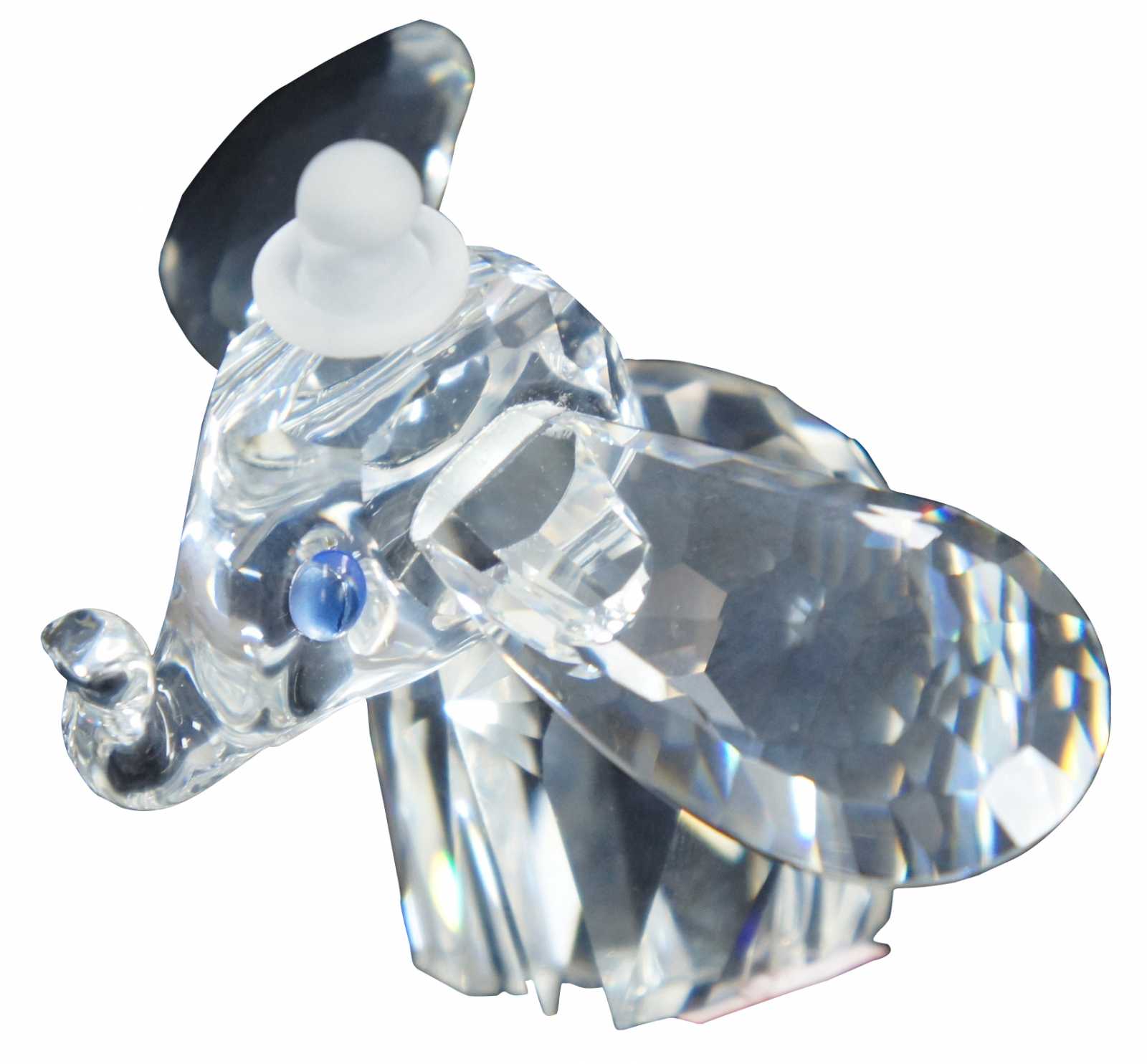 Swarovski crystal figurine of Disney’s Dumbo the Elephant, with ear outstretched, blue eyes and frosted hat.