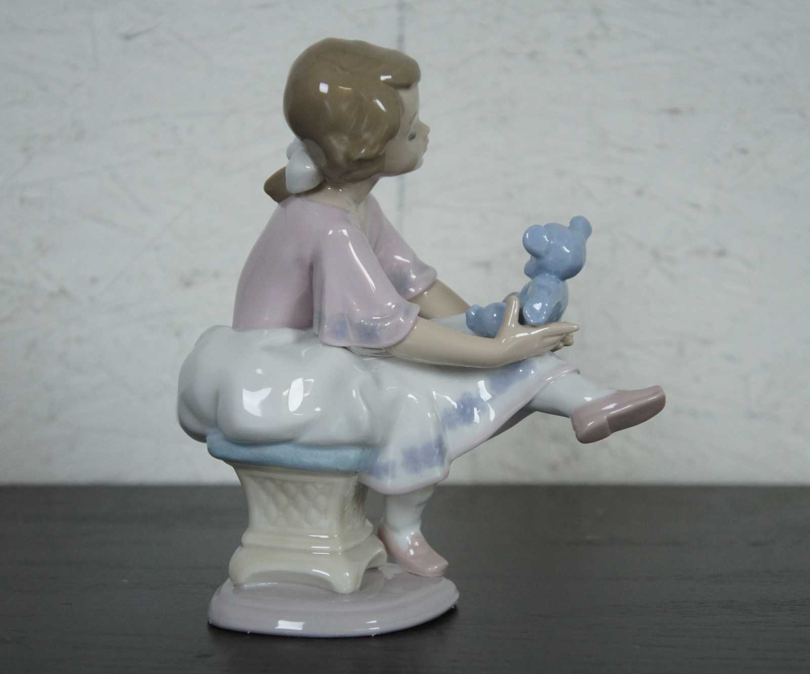 Lladro Spain 1993 porcelain figurine #7620 – Best Friend – portraying a girl in a pink top and floral skirt holding out a blue teddy bear.