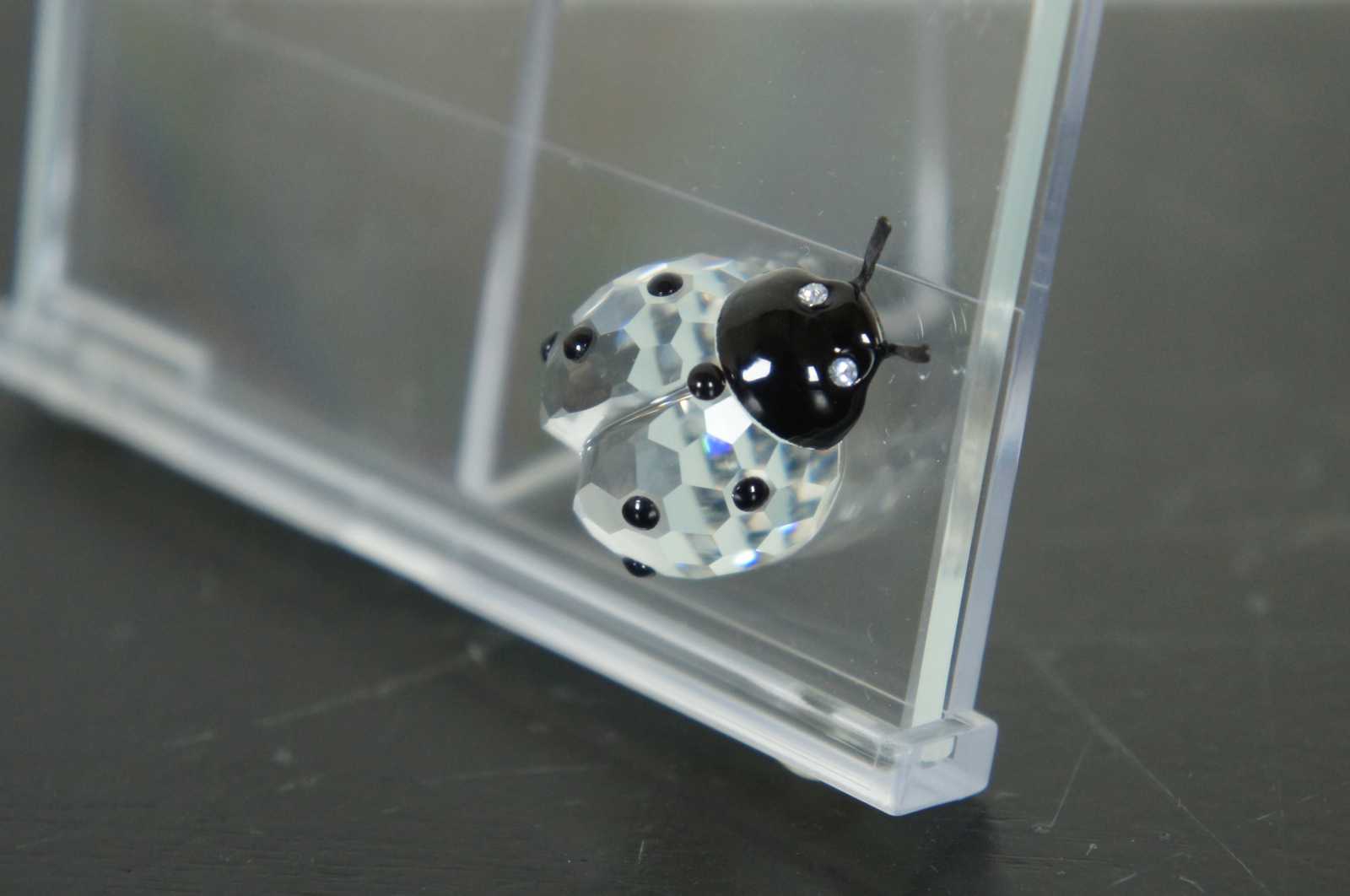 Folding lucite photo frame with Swarovski crystal ladybug accent with black head and spots. Fits 3.5” x 5” picture. Includes original box.