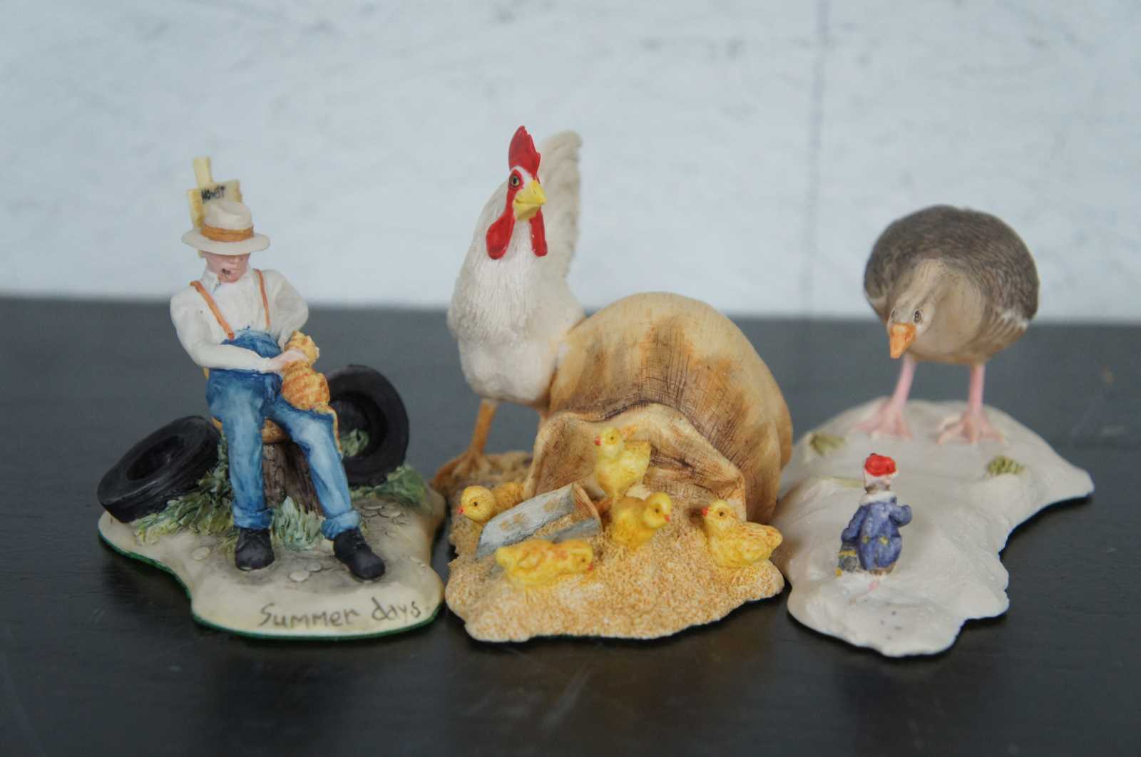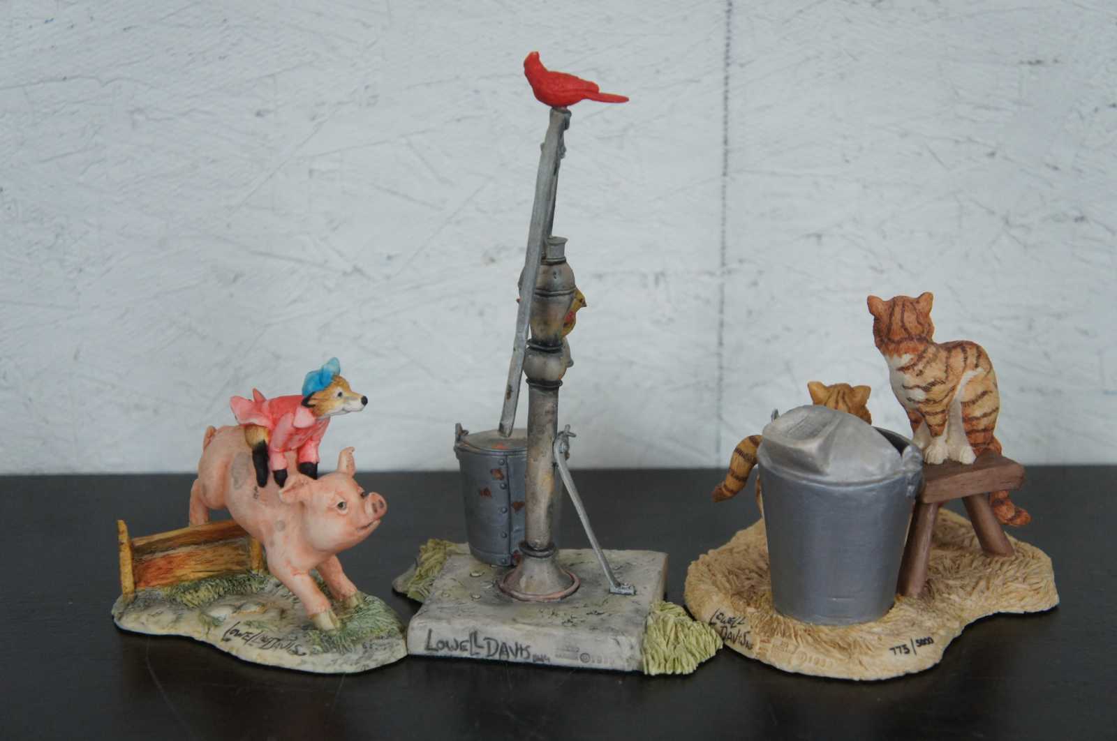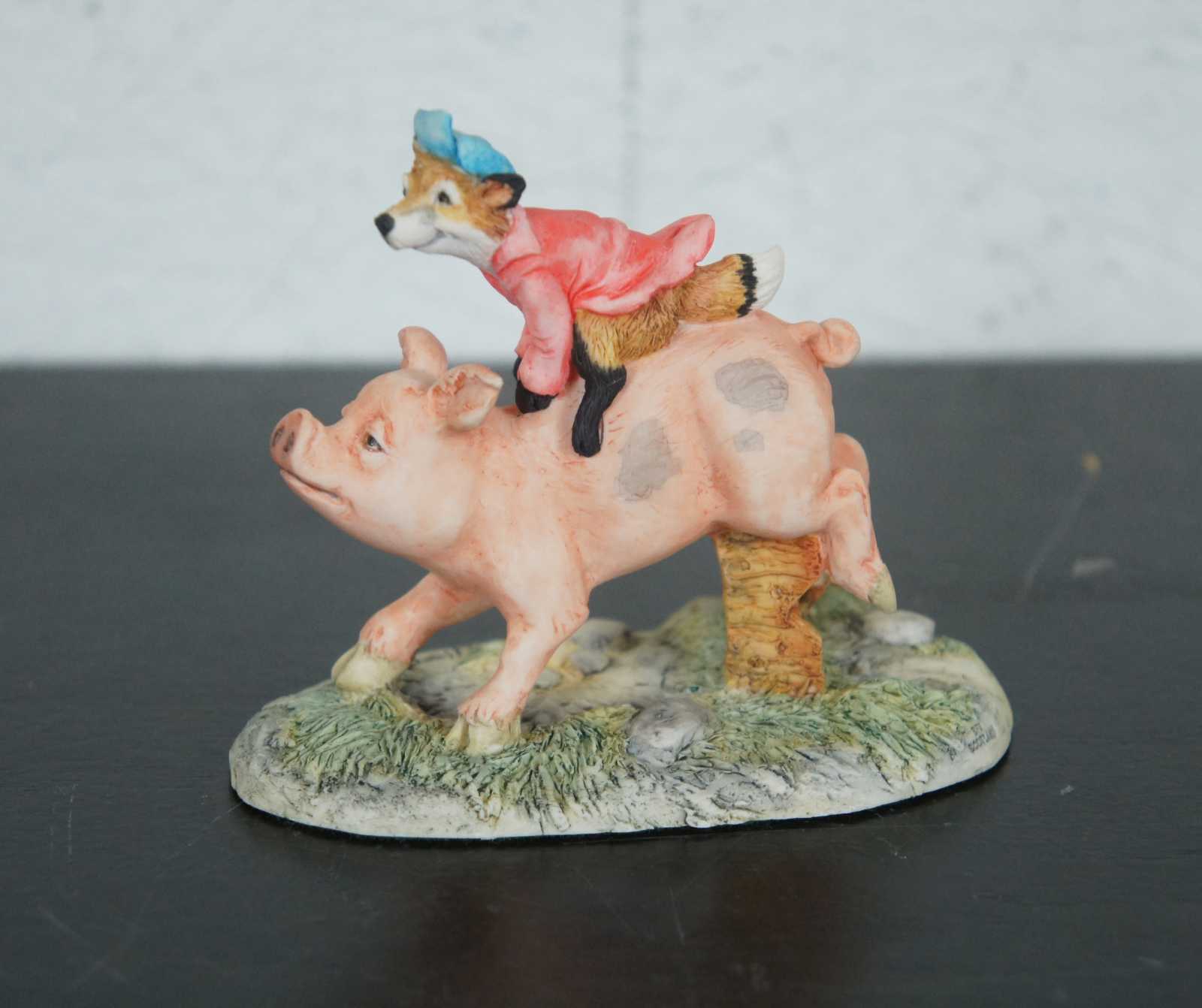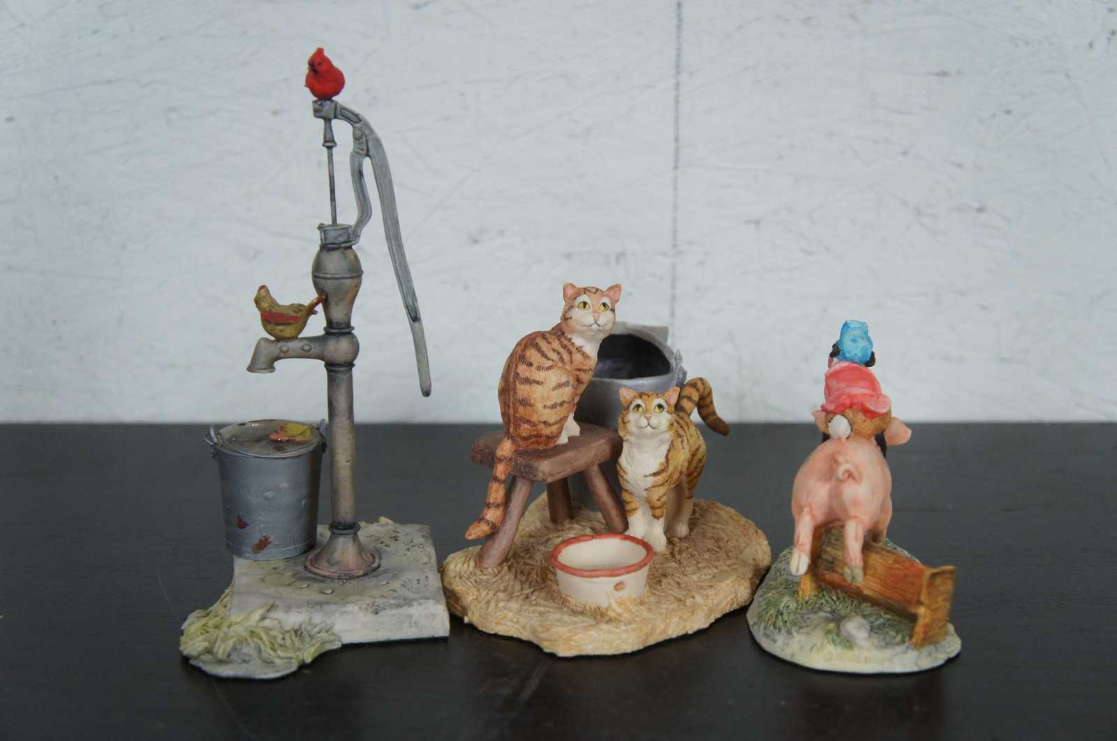 Lot of six Schmid figurines from Border Fine arts, designed by Lowell Davis. 1991 Warm Milk 775/5000 (two cats with milk bucket), 1989 Pit Stop (water pump with two birds), 1991 Hog Wild (fox in clothing riding a pig), 1988 Chow Time (hen and chicks with bag of grain), 1993 Route 66 Collection Summer Days (man selling used tires), 1990 Arrival of Stanley (mouse in clothes looking at a goose).
