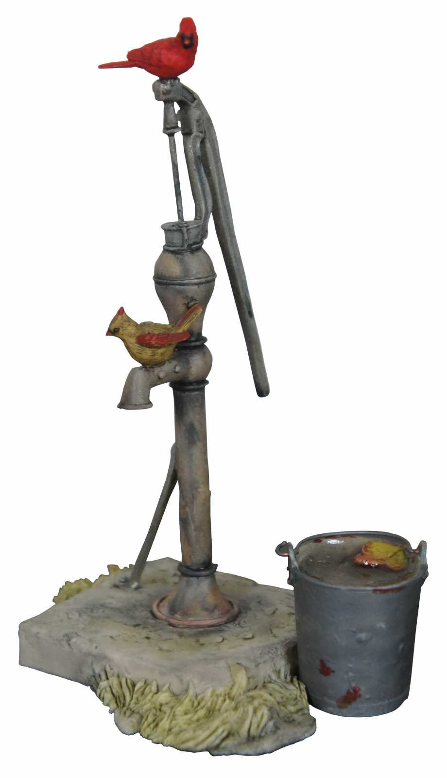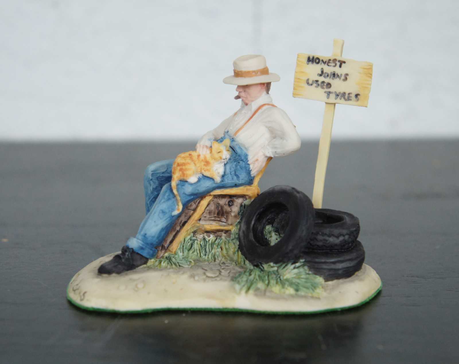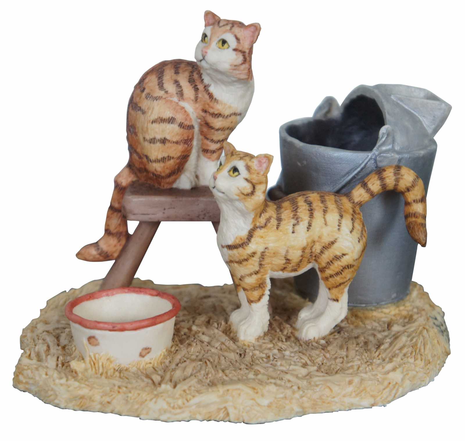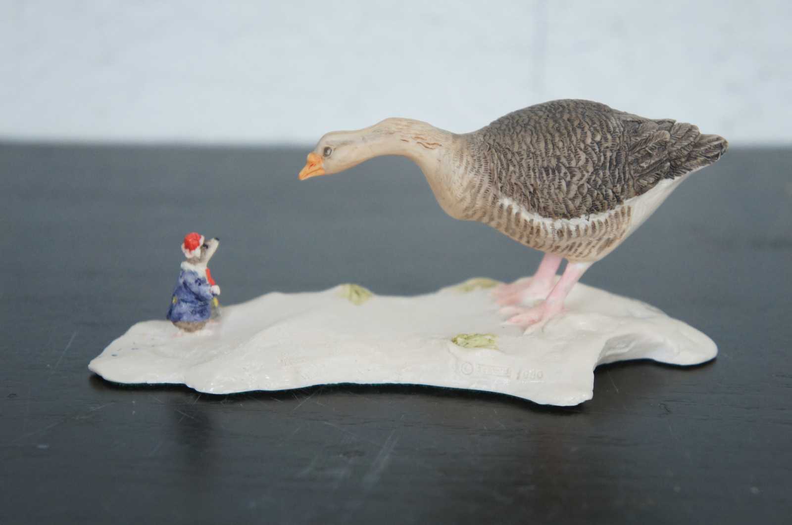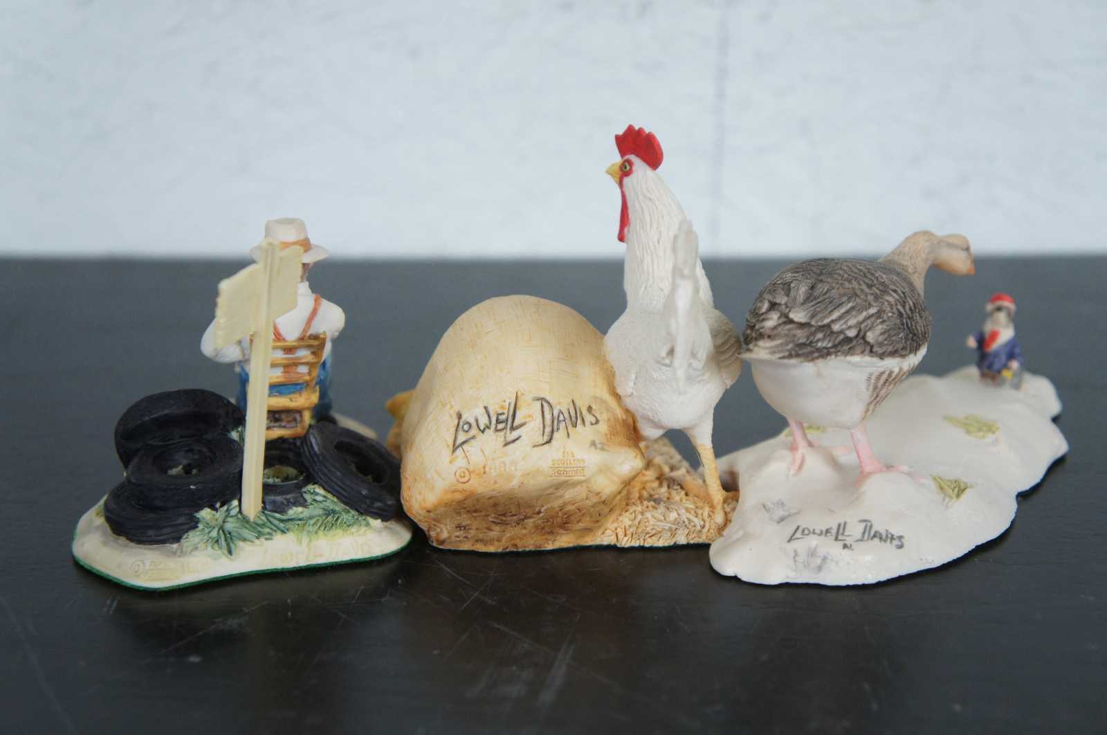 Lot of six Schmid figurines from Border Fine arts, designed by Lowell Davis. 1991 Warm Milk 775/5000 (two cats with milk bucket), 1989 Pit Stop (water pump with two birds), 1991 Hog Wild (fox in clothing riding a pig), 1988 Chow Time (hen and chicks with bag of grain), 1993 Route 66 Collection Summer Days (man selling used tires), 1990 Arrival of Stanley (mouse in clothes looking at a goose).