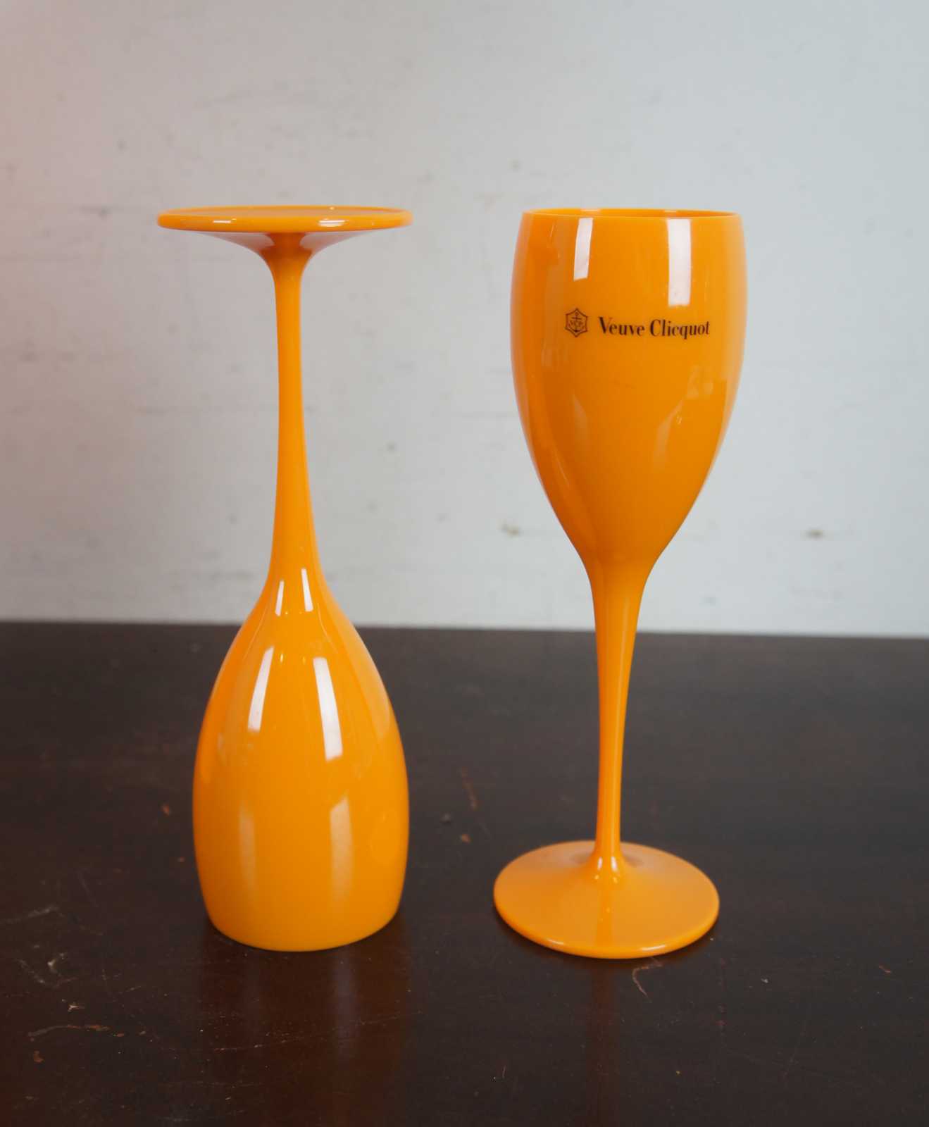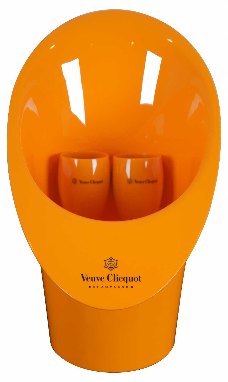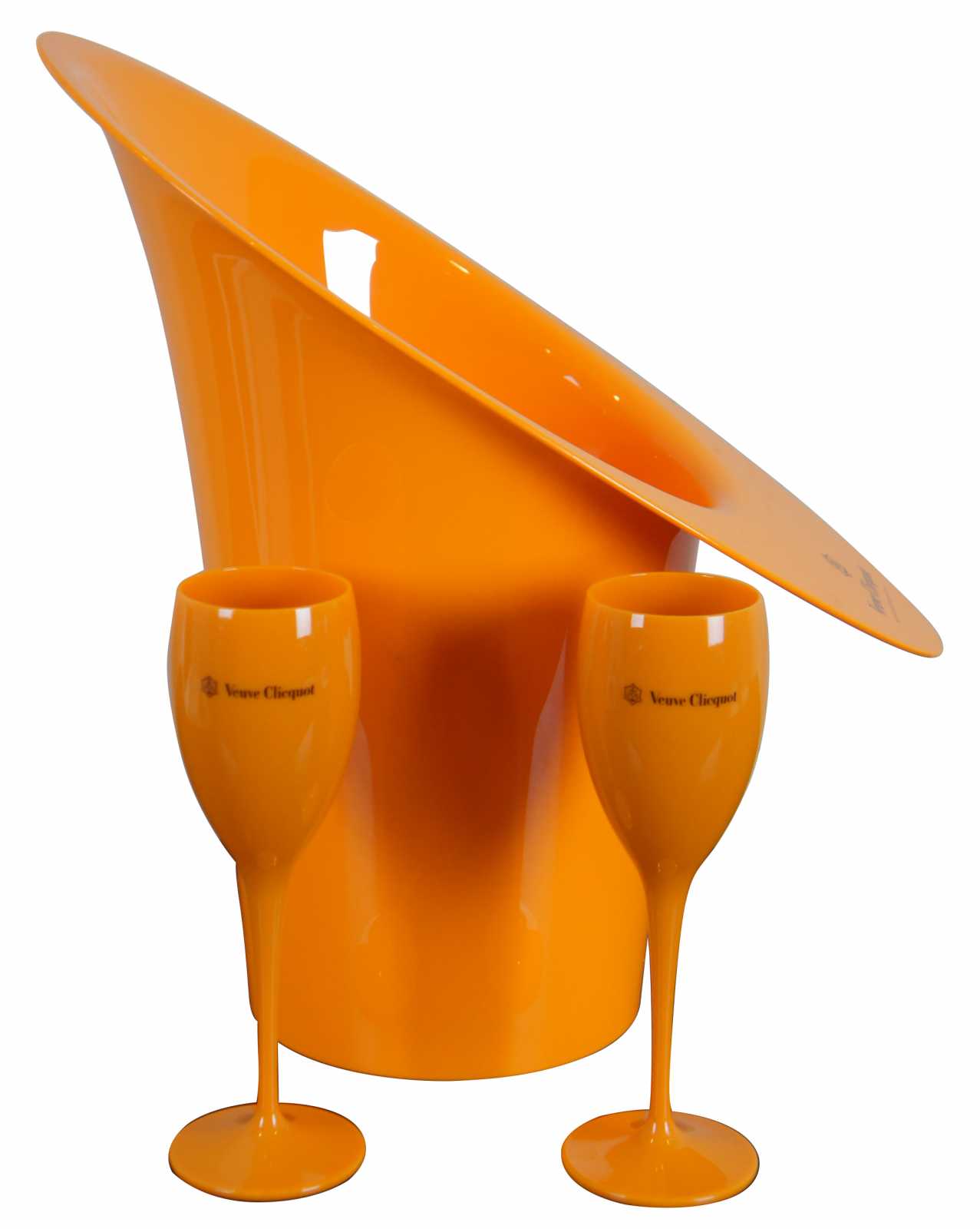 Orange acrylic Veuve Clicquot Champagne bottle chilling ice bucket and two wine glasses.