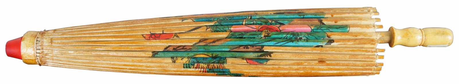 Vintage Asian rice paper parasol with bamboo handle, hand painted with a pair of birds on rocks and a branch of cherry blossoms.