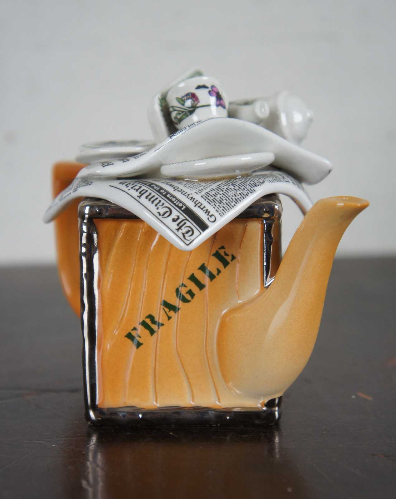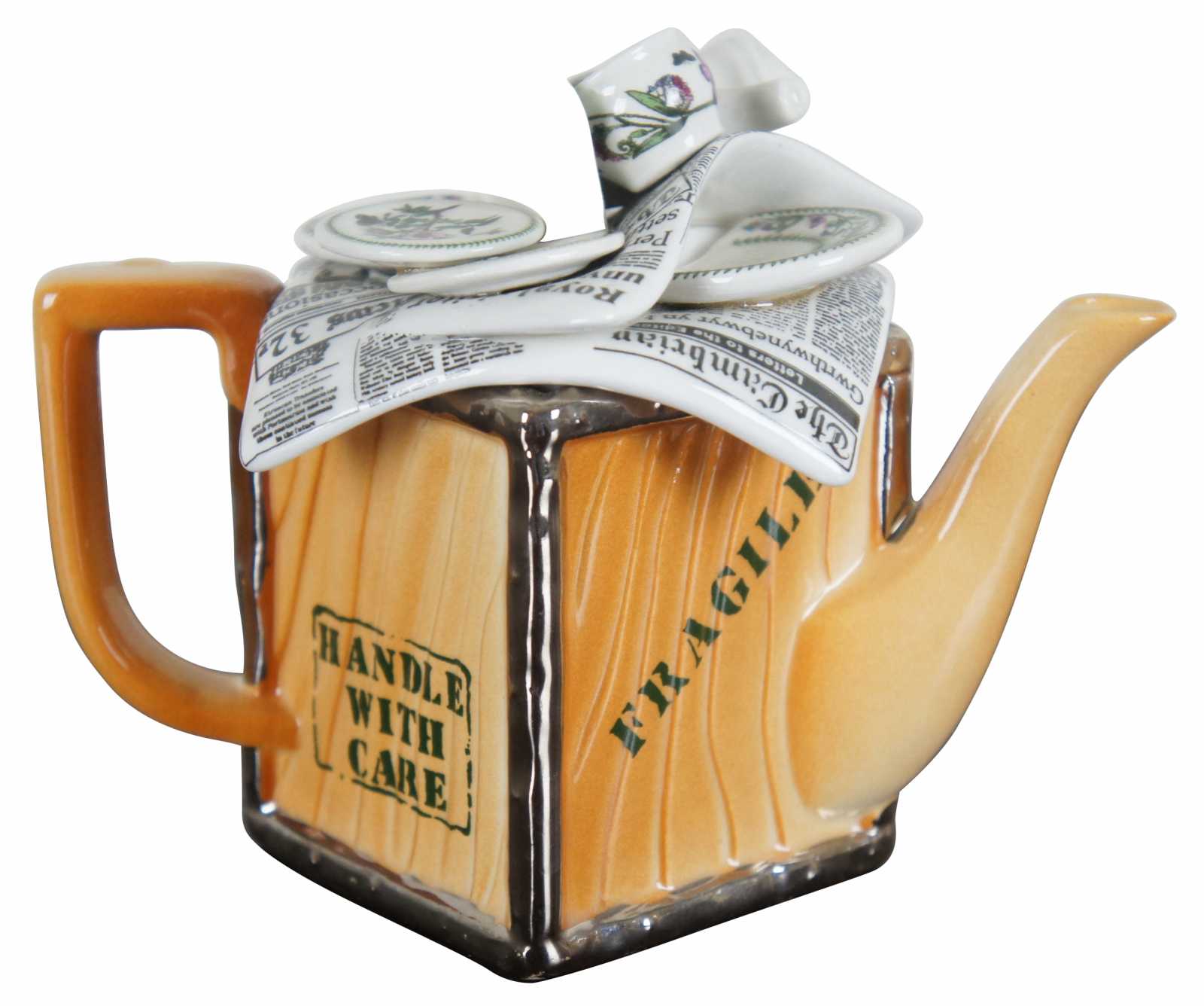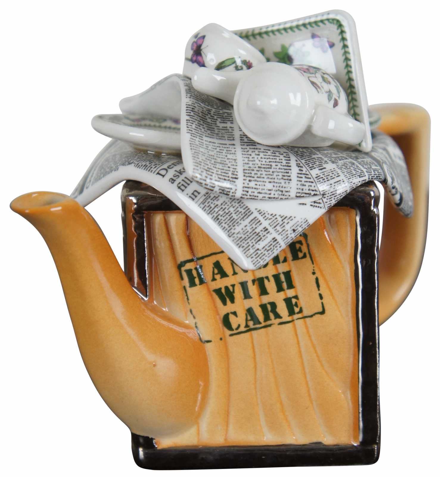 This is a charming mini teapot designed by Paul Cardew for Portmeirion's timeless Botanic Garden Collection. This teapot is titled "moving day" and is in the form of a moving crate with newspaper packing and tea set pieces on the top.