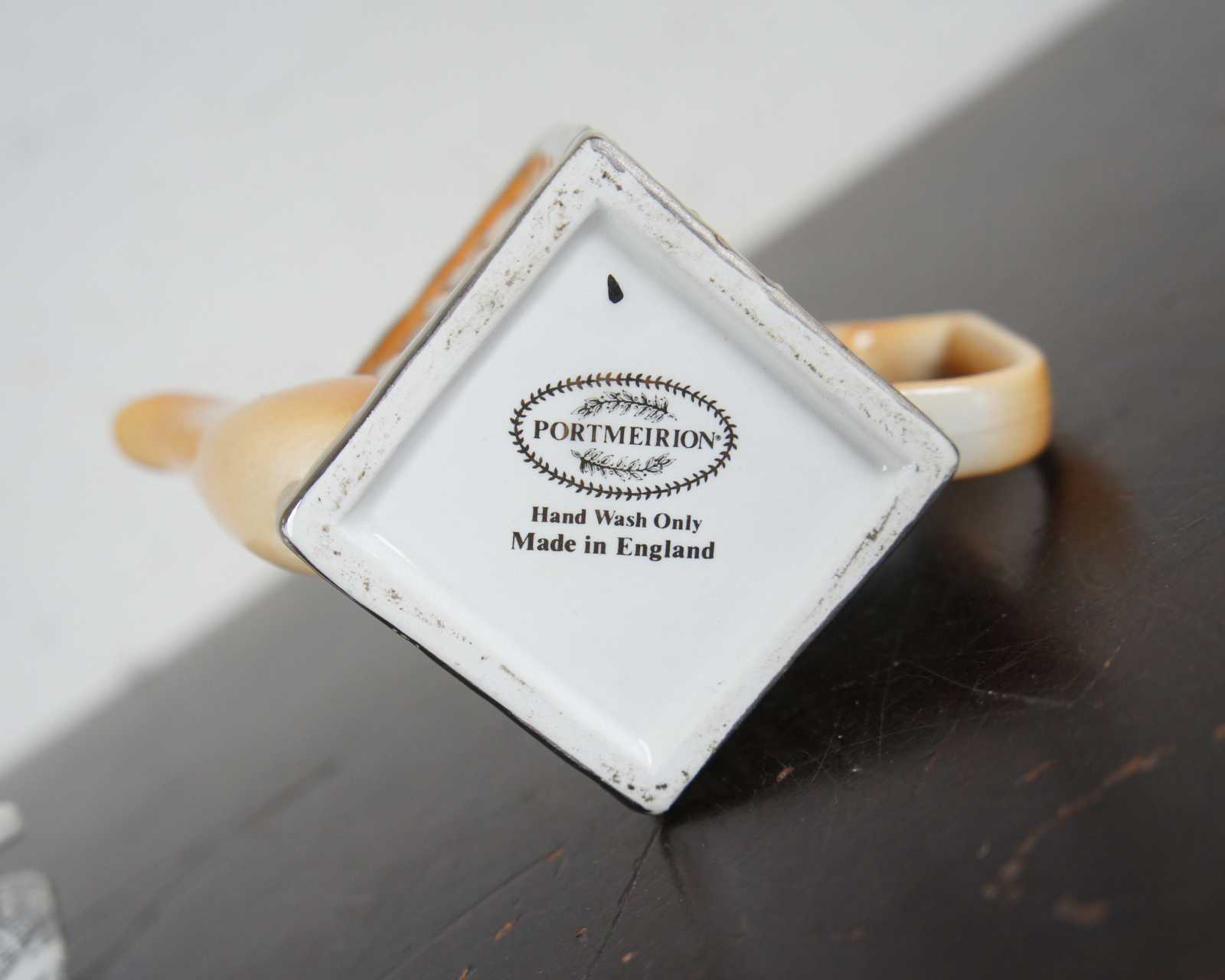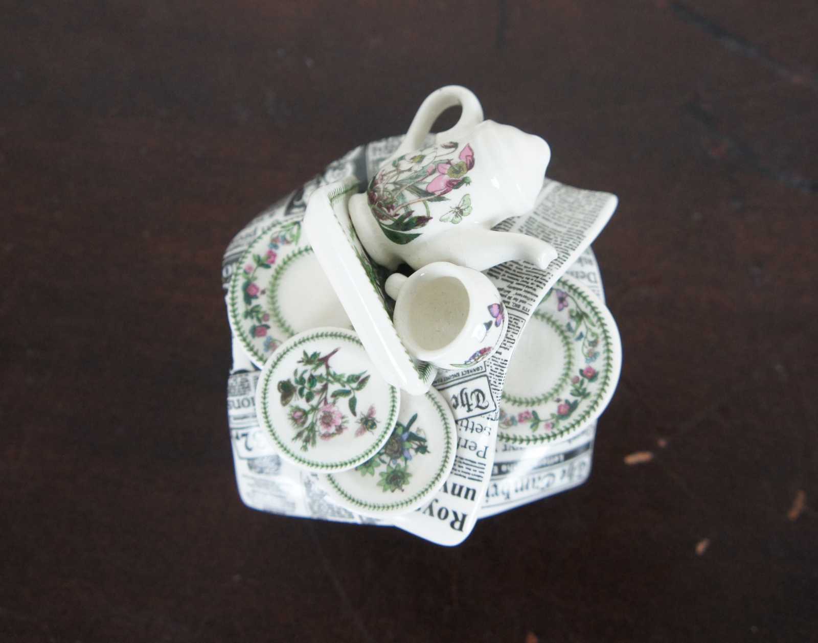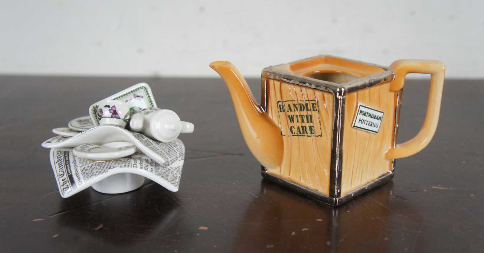 This is a charming mini teapot designed by Paul Cardew for Portmeirion's timeless Botanic Garden Collection. This teapot is titled "moving day" and is in the form of a moving crate with newspaper packing and tea set pieces on the top.
