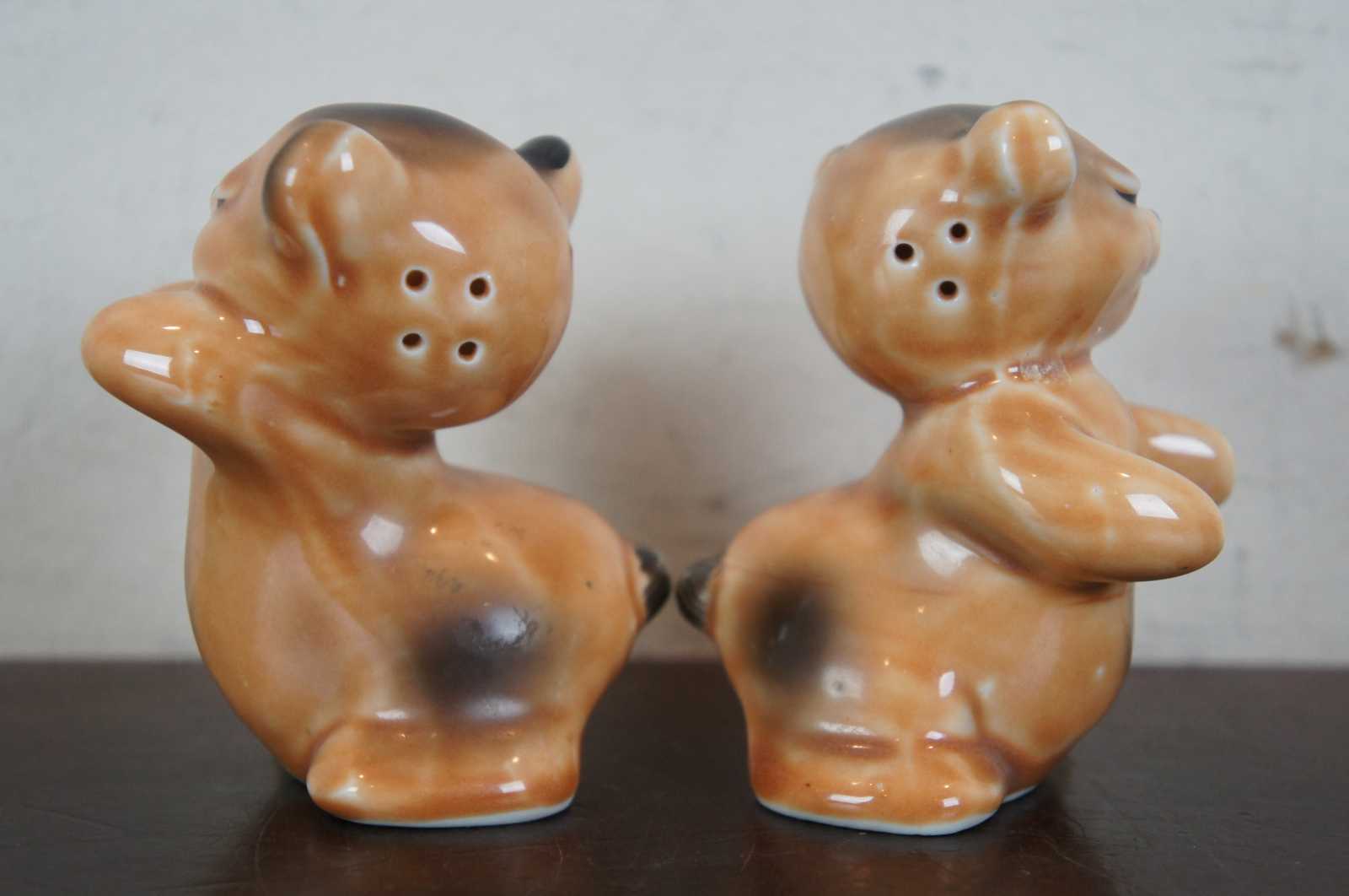 Vintage set of porcelain salt and pepper shakers by Van Tellingen featuring two brown and black bears hugging each other.