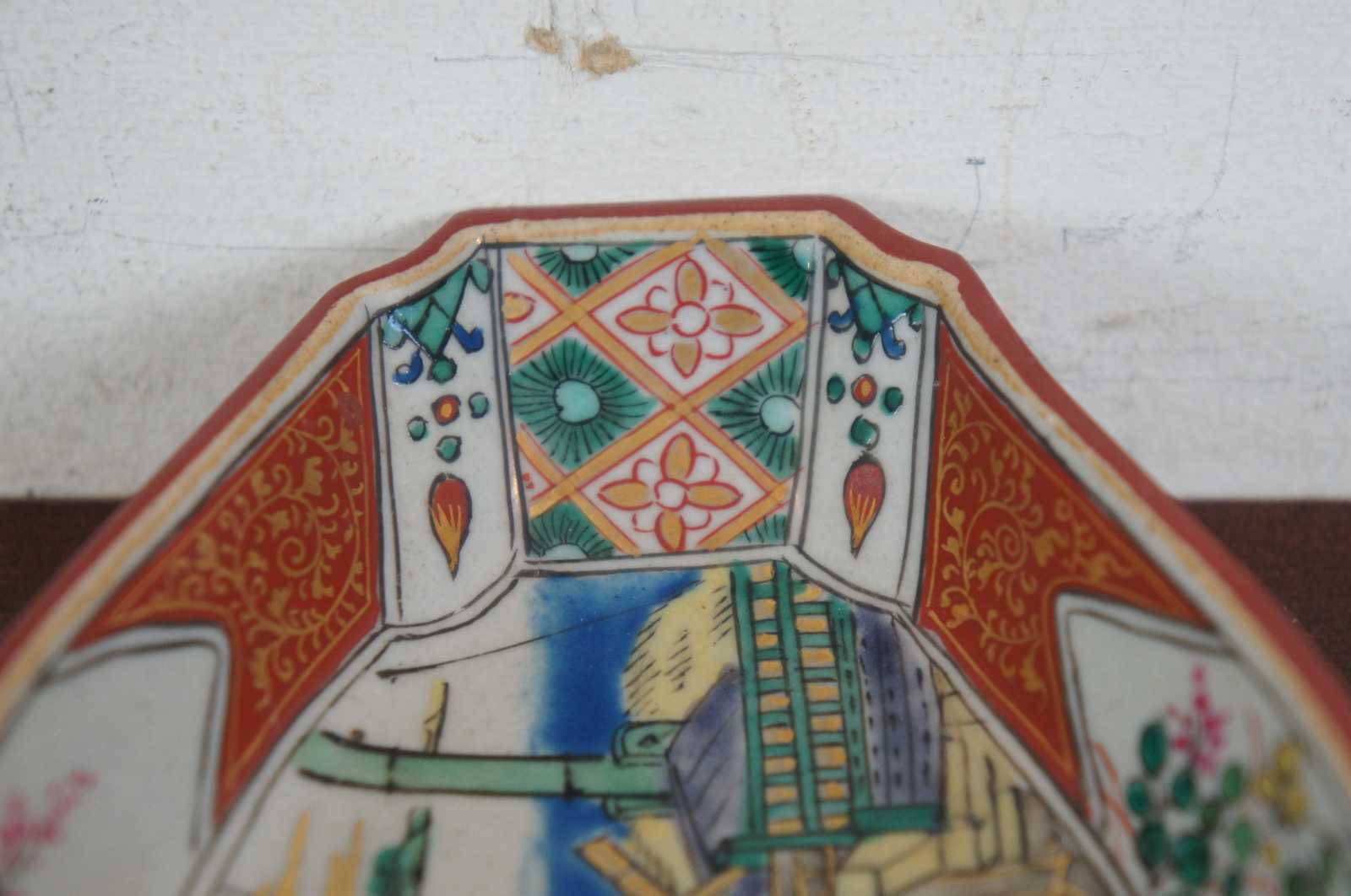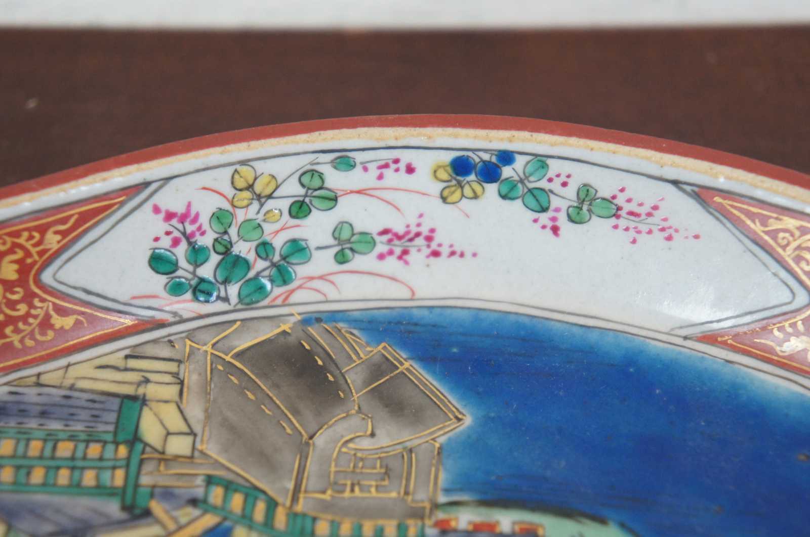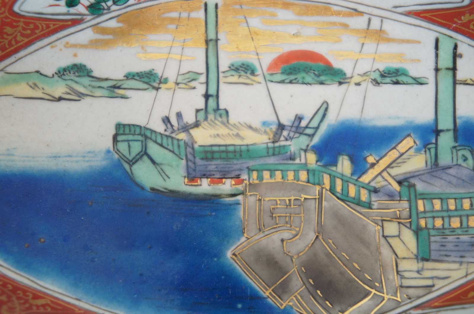 Vintage Japanese Satsuma style hand painted porcelain dish showing a sunset water scene of docked boats with thatched roofs.