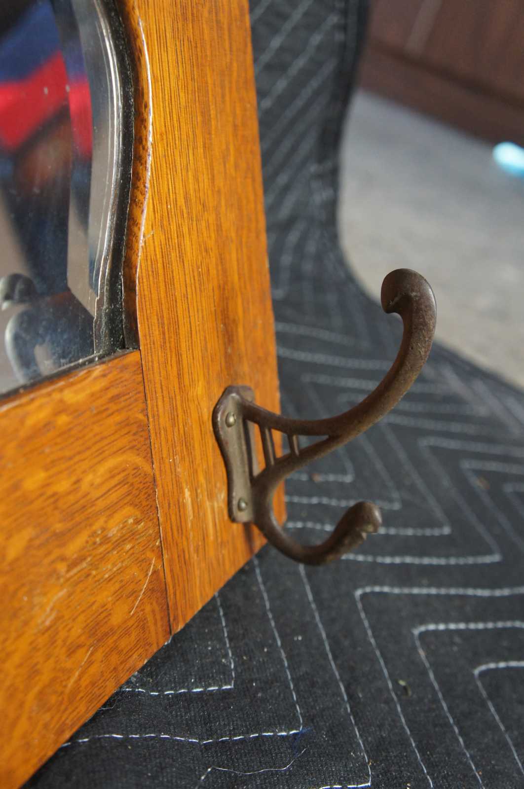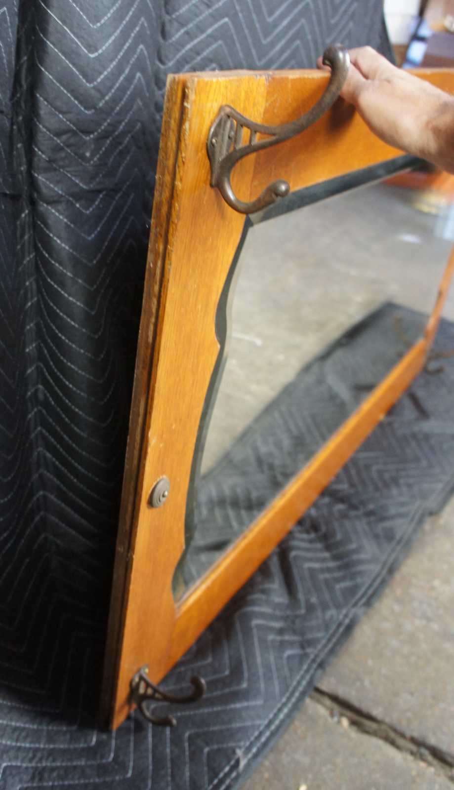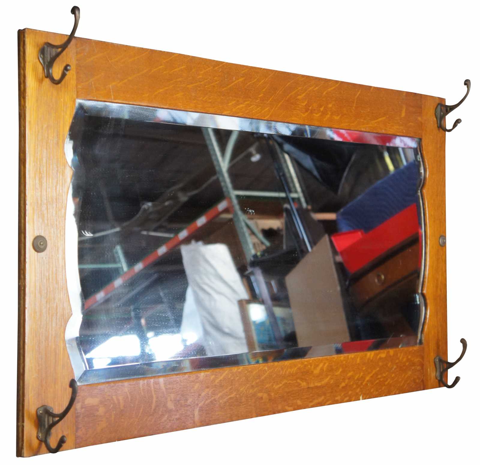 Antique quartersawn or tiger oak hall mirror or tree with hooks. This coat or hat rack features a beveled mirror with ornate scalloped design against oak paneling and four hooks.