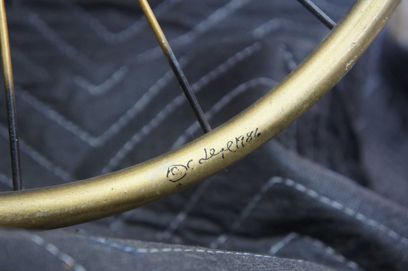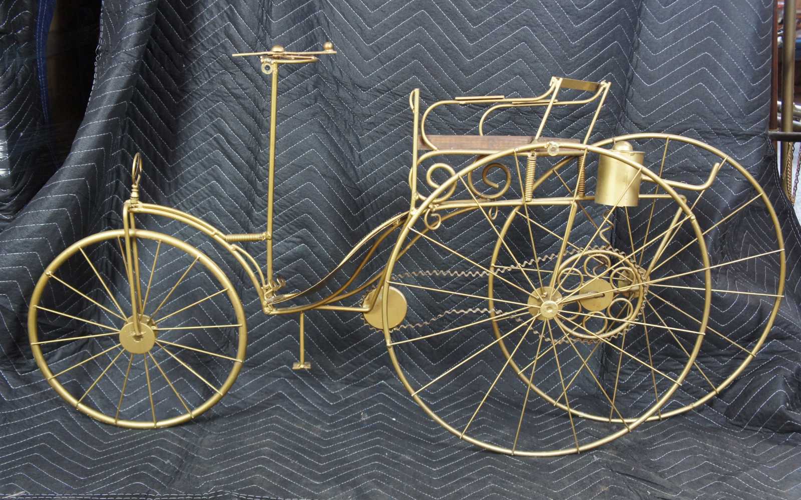 Curtis Jere wall sculpture portraying Karl Benz (Mercedes Benz) First Motorwagen that was built in 1886. Signed along the wheel, 1986. Made from brass with wood grain accents.