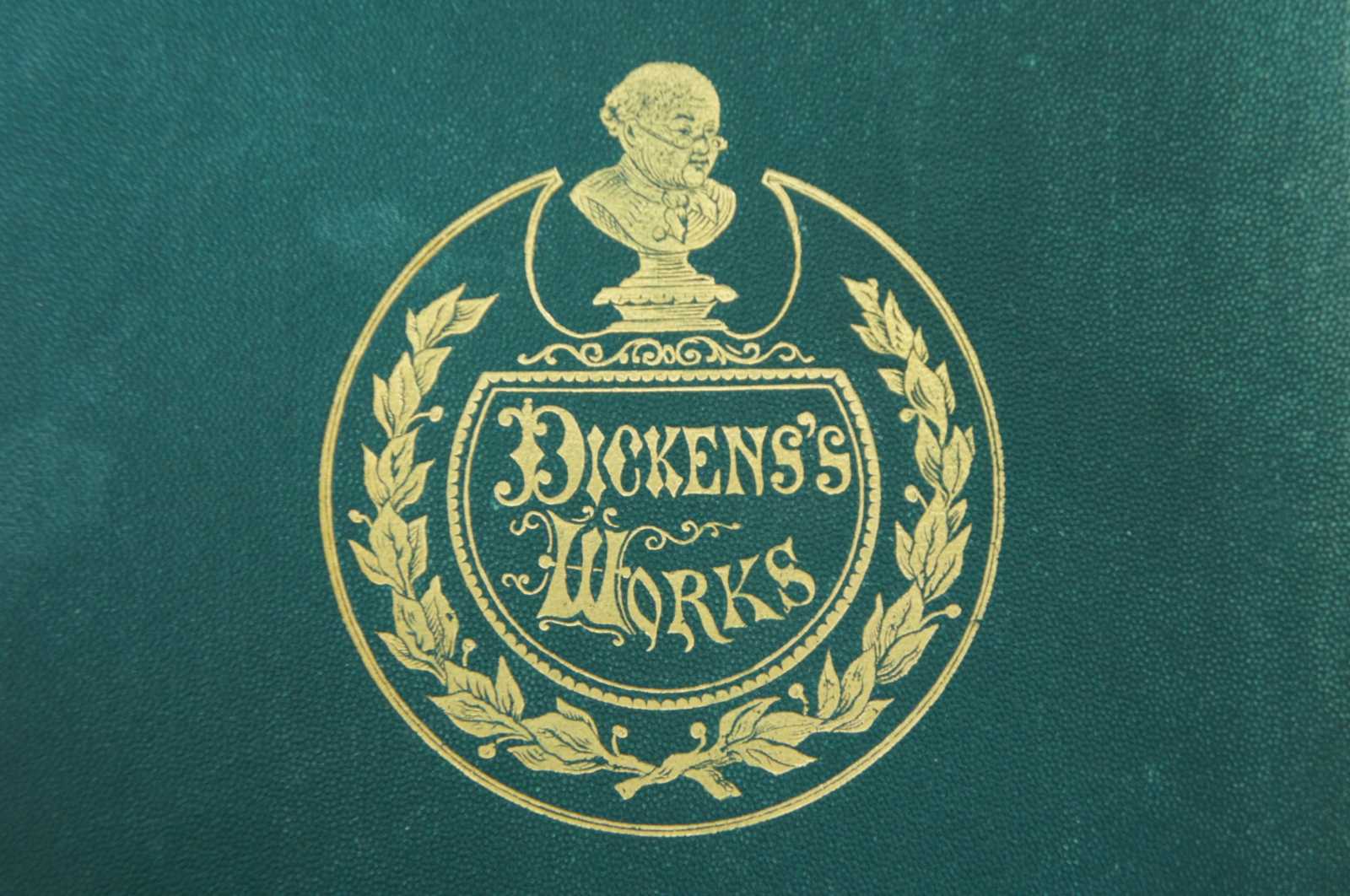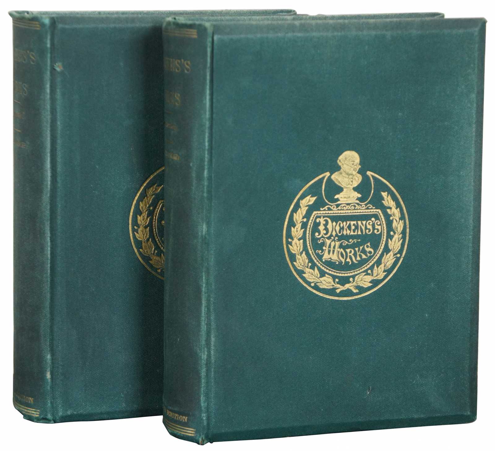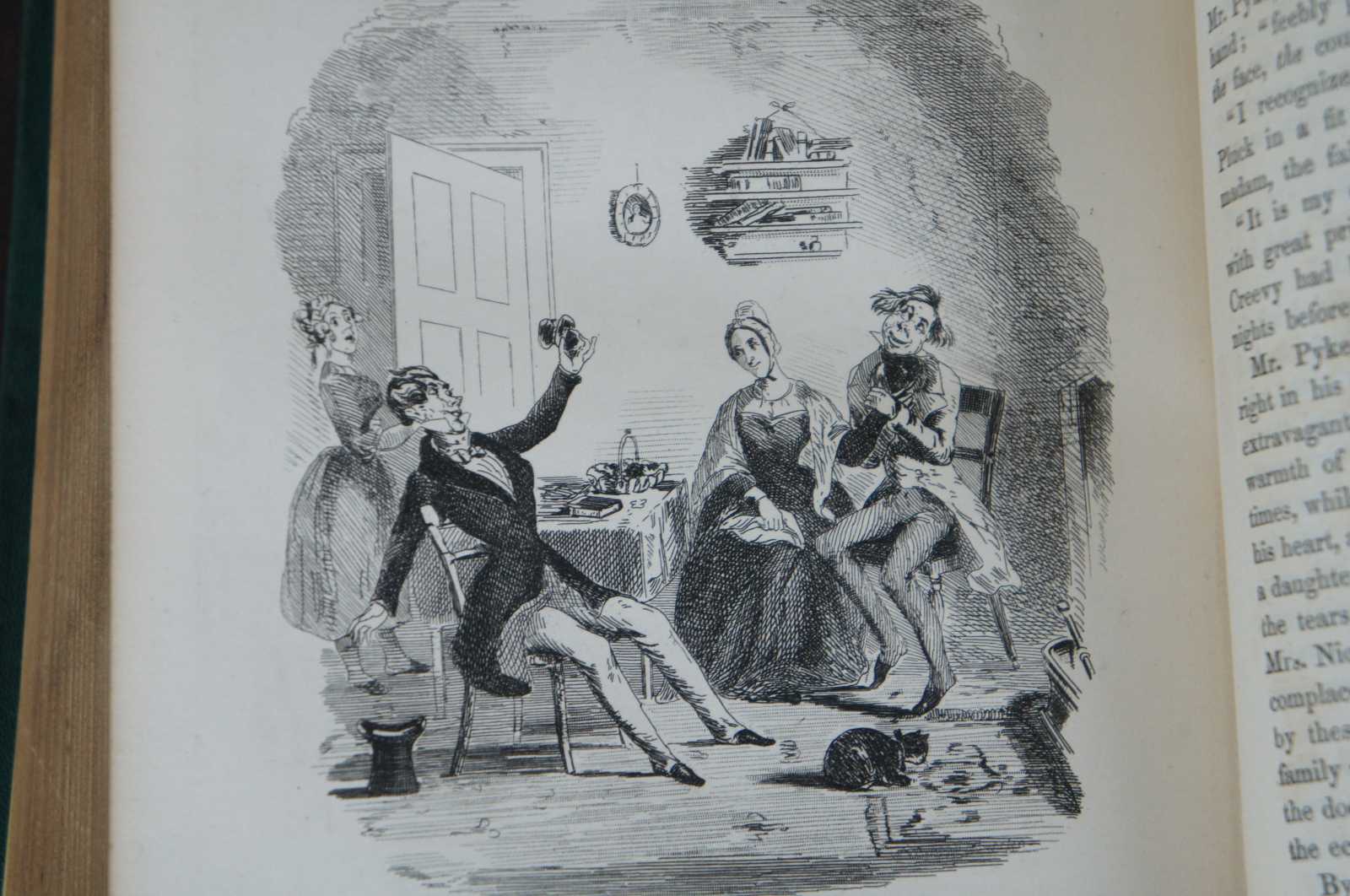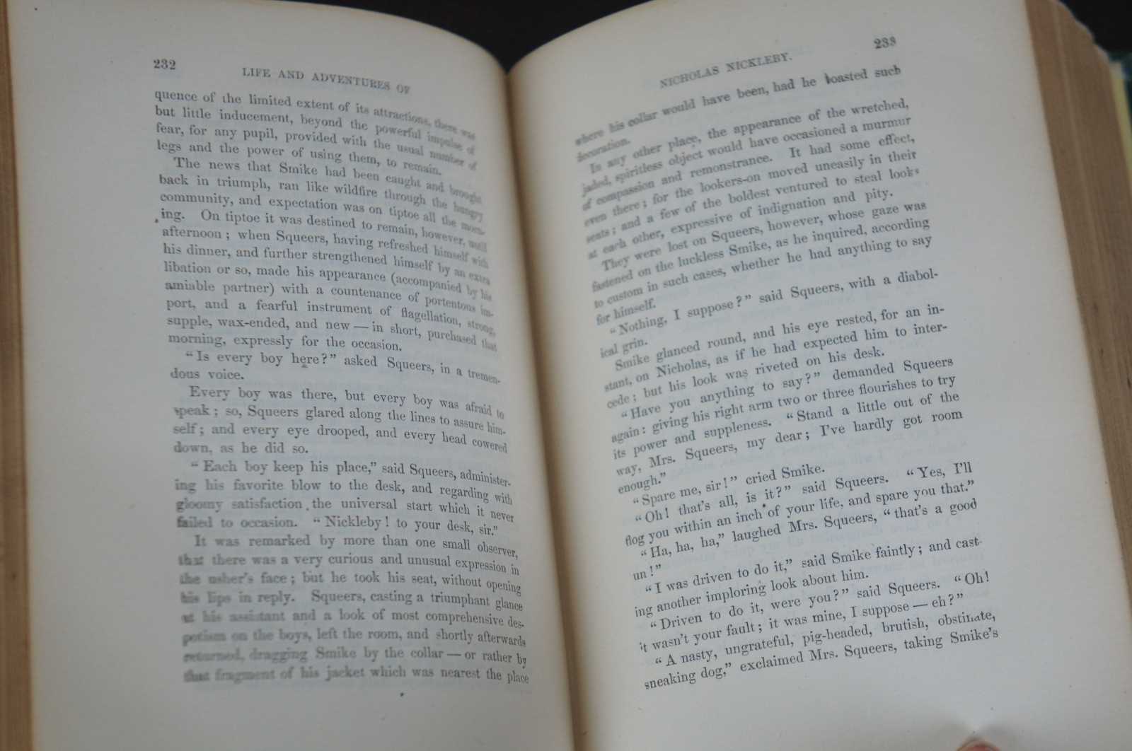 Two illustrated antique hardback books of Nicolas Nickleby in two volumes from the Riverside Edition of the Works of Charles Dickens, published by Hurd and Houghton, Cambridge: Riverside Press, 1871.
