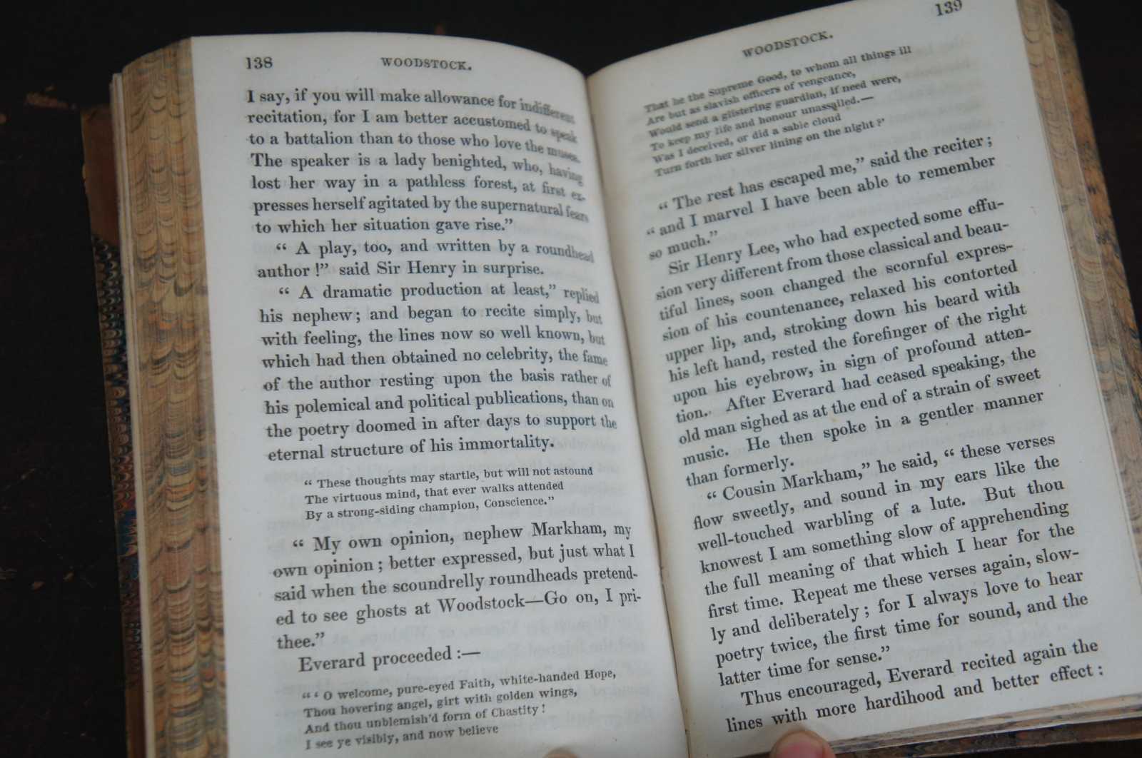 Two antique brown leather bound Sir Walter Scott Waverly Novels – Tales and Romances of the Author of Waverly, Volume VIII and IX – Woodstock: or The Cavalier, A Tale of the Year 1651. Printed in Edinburgh for Cadell and Company (Edinburgh) and Longman, Rees, Orme, Brown and Green (London) by Ballantyne and Company, 1827. Edinburgh, London.