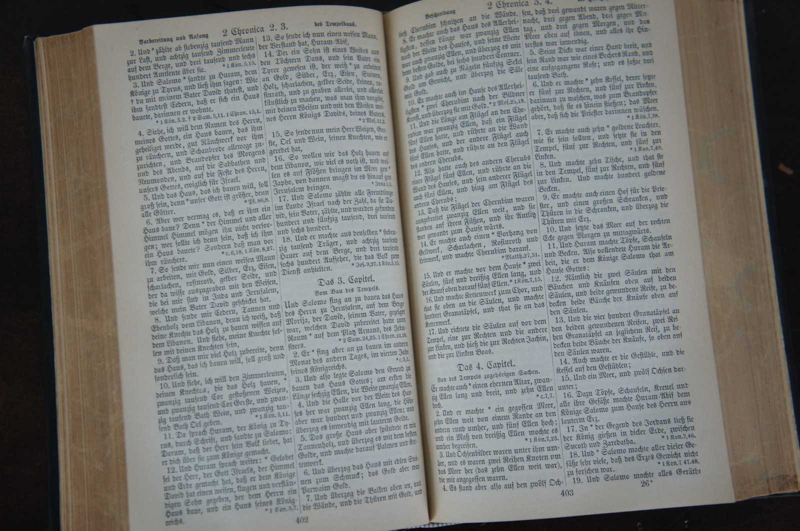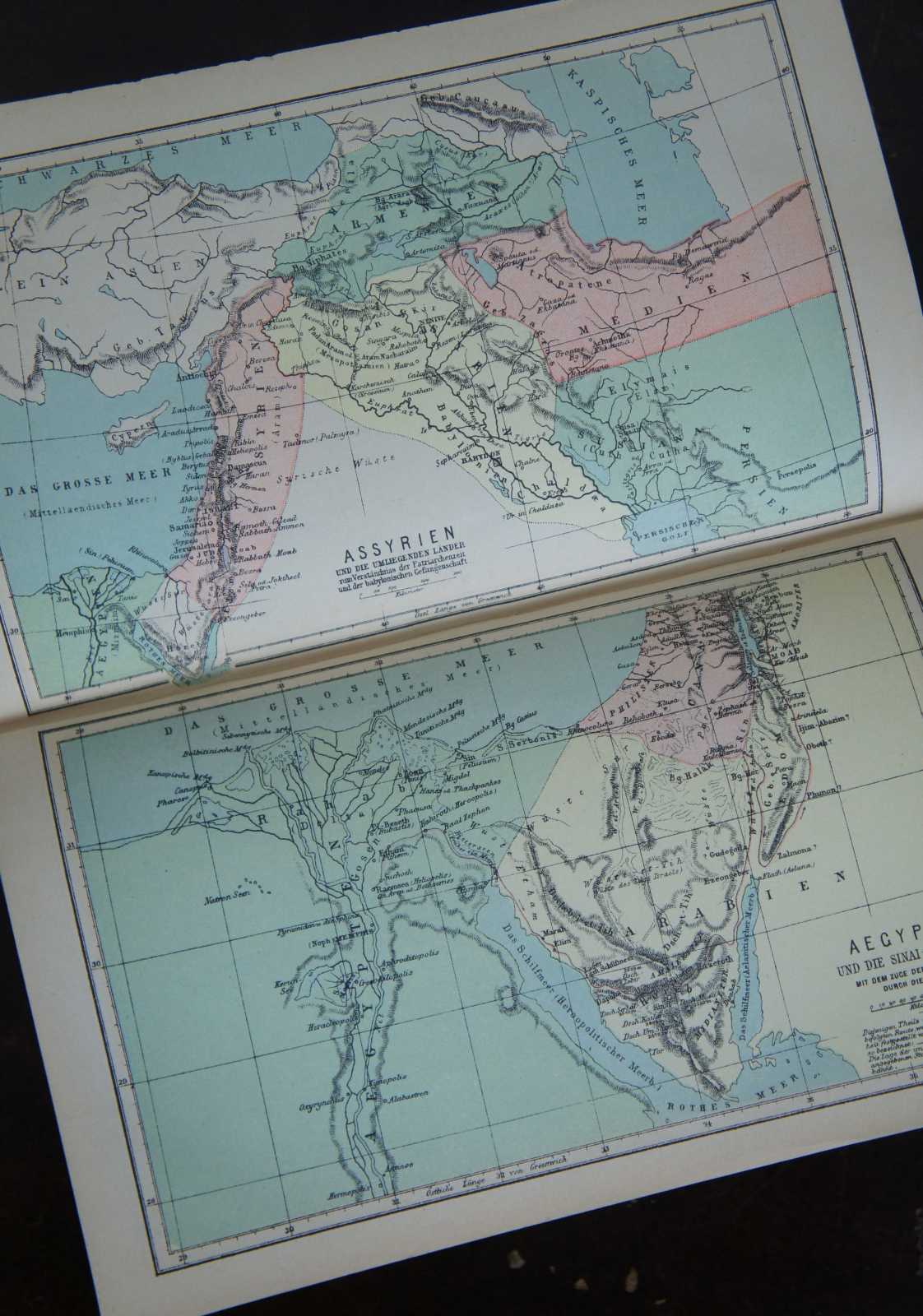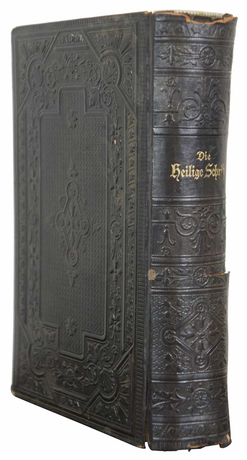 Antique embossed leather bound copy of “Die Heilige Schrift” (The Holy Scriptures), the Christian Lutheran Bible in German, complete with maps of the Holy Land, published in 1889.
