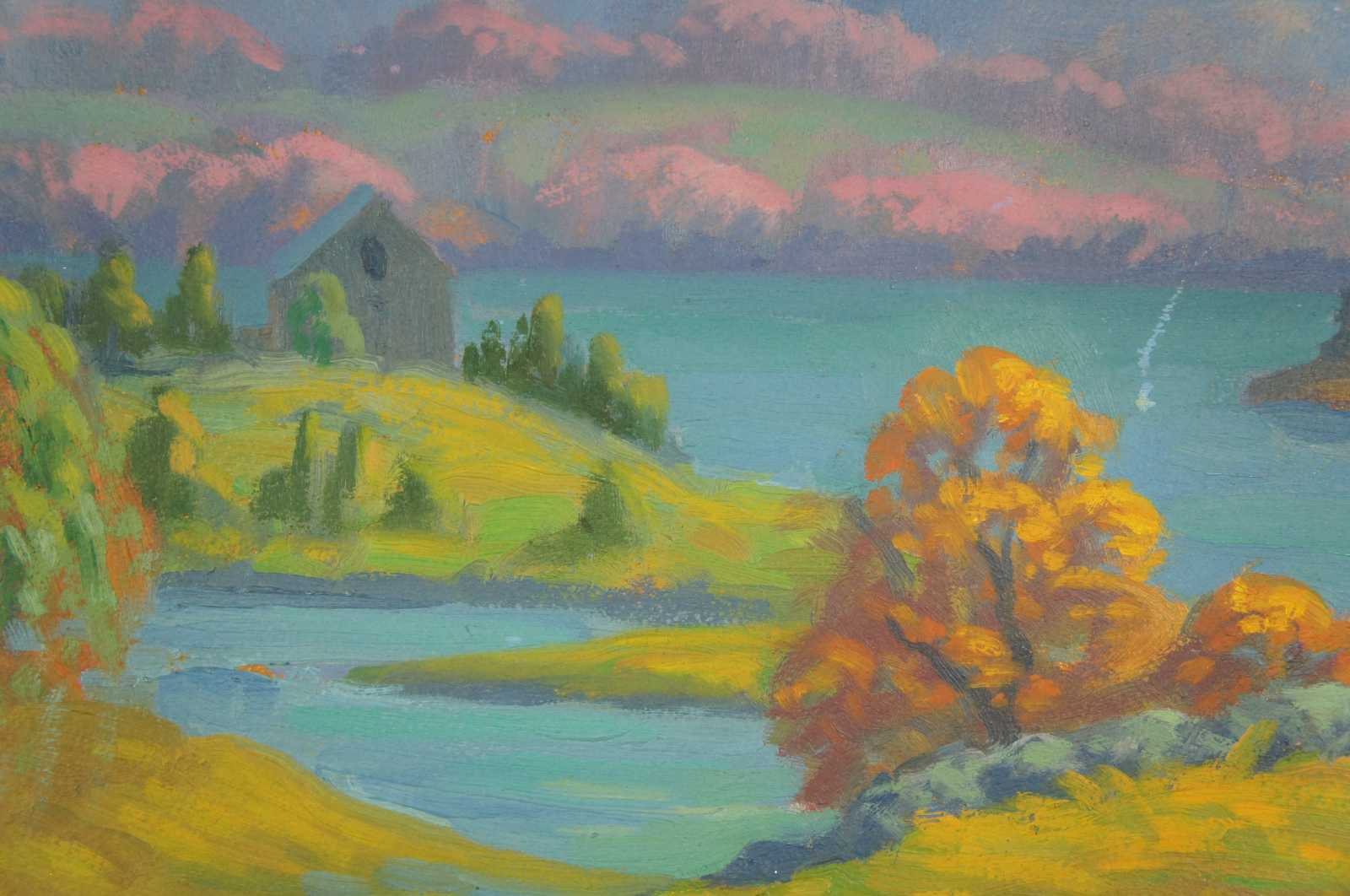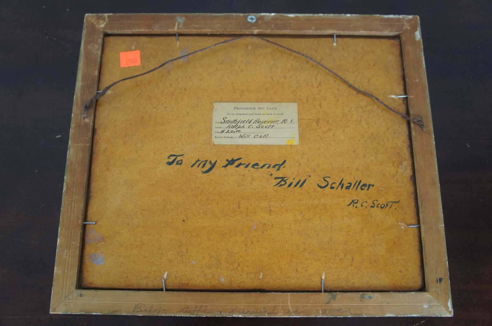 Antique 1934 impressionist oil on board landscape painting titled Smithfield Reservoir, R.I. by Ralph C. Scott. Personalized by the artist for his friend. Ralph C. Scott (Born 1896) was active/lived in Massachusetts. Ralph Scott is known for Town-landscape, coastal views.