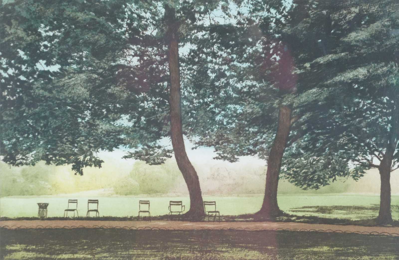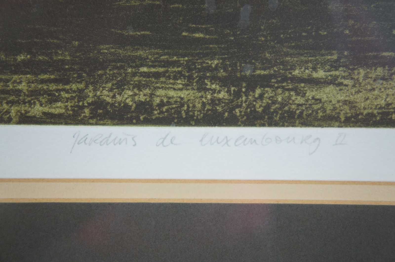 Limited edition, pencil signed aquatint etching / print number 79/175 titled Jardins de Luxembourg II by John McNulty. Features a tree lined path and a row of senat chairs. John McNulty was born in Dublin in 1949. He graduated from the National College of Art, Dublin and the Etching Center, Geneva. McNulty has had 15 exhibitions and 4 international fairs, Basel, Tokyo, New York, New York and Brisbane. His works have appeared in 2 major motion pictures, which are Wall Street with Michael Douglas and Regarding Henry with Harrison Ford and are in 19 collections including the Sears collection in Chicago, the Smith Barney, IBM, Amex, Bank of Scotland and Metropolitan Life collections and the Glaxo collection in London.