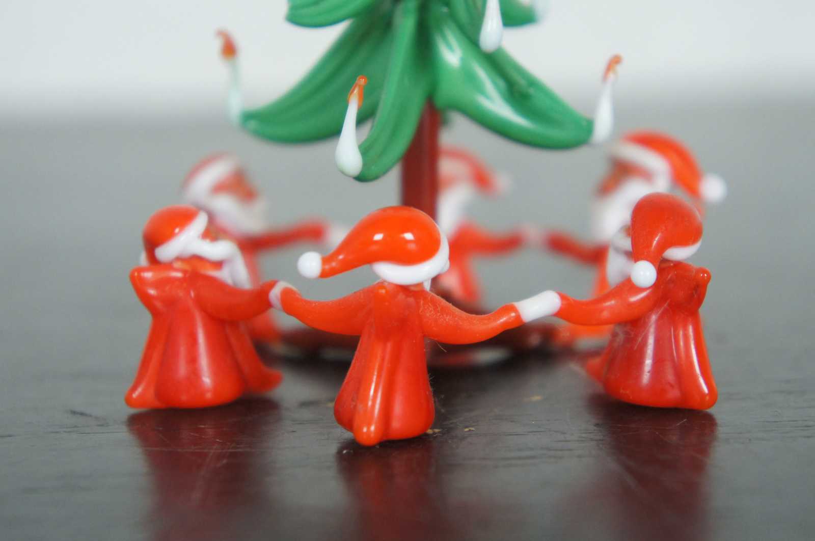 Miniature hand blown art glass figurine of six Santa Claus figures around a candle lit Christmas pine tree.