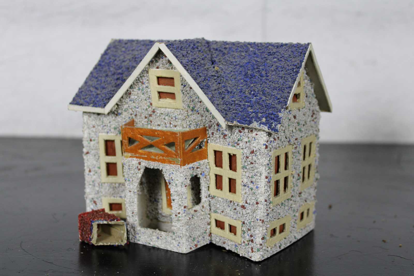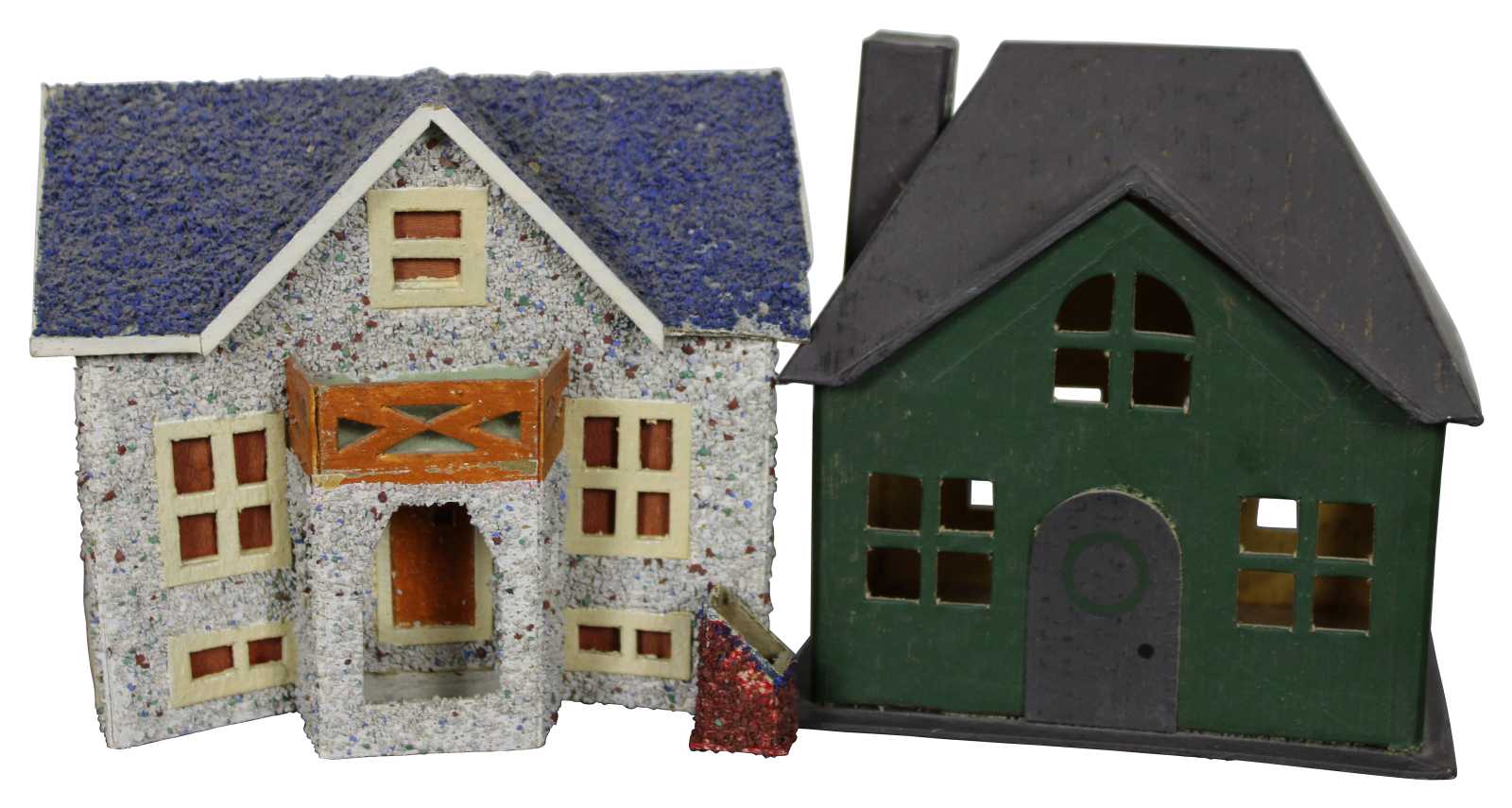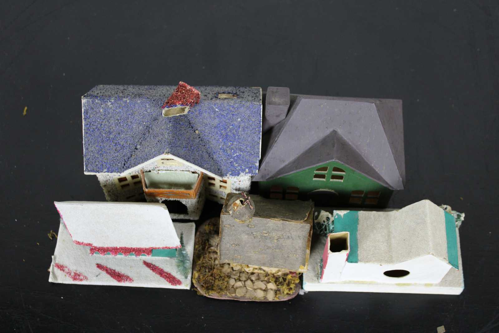 5 assorted vintage cardboard and paper mache Christmas village houses, Japan.