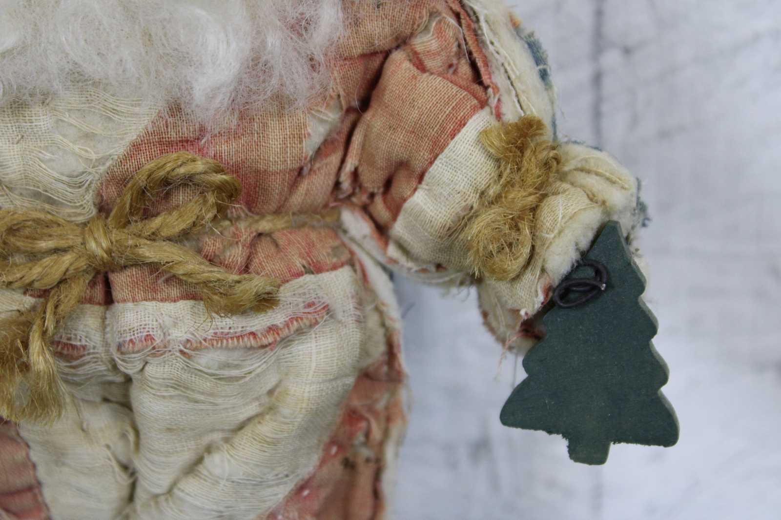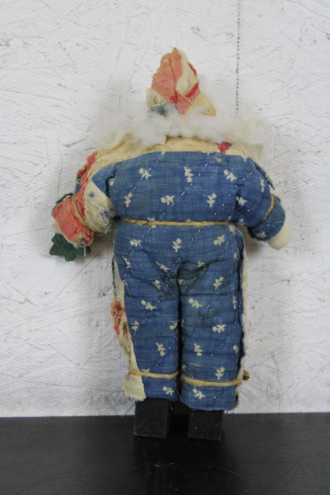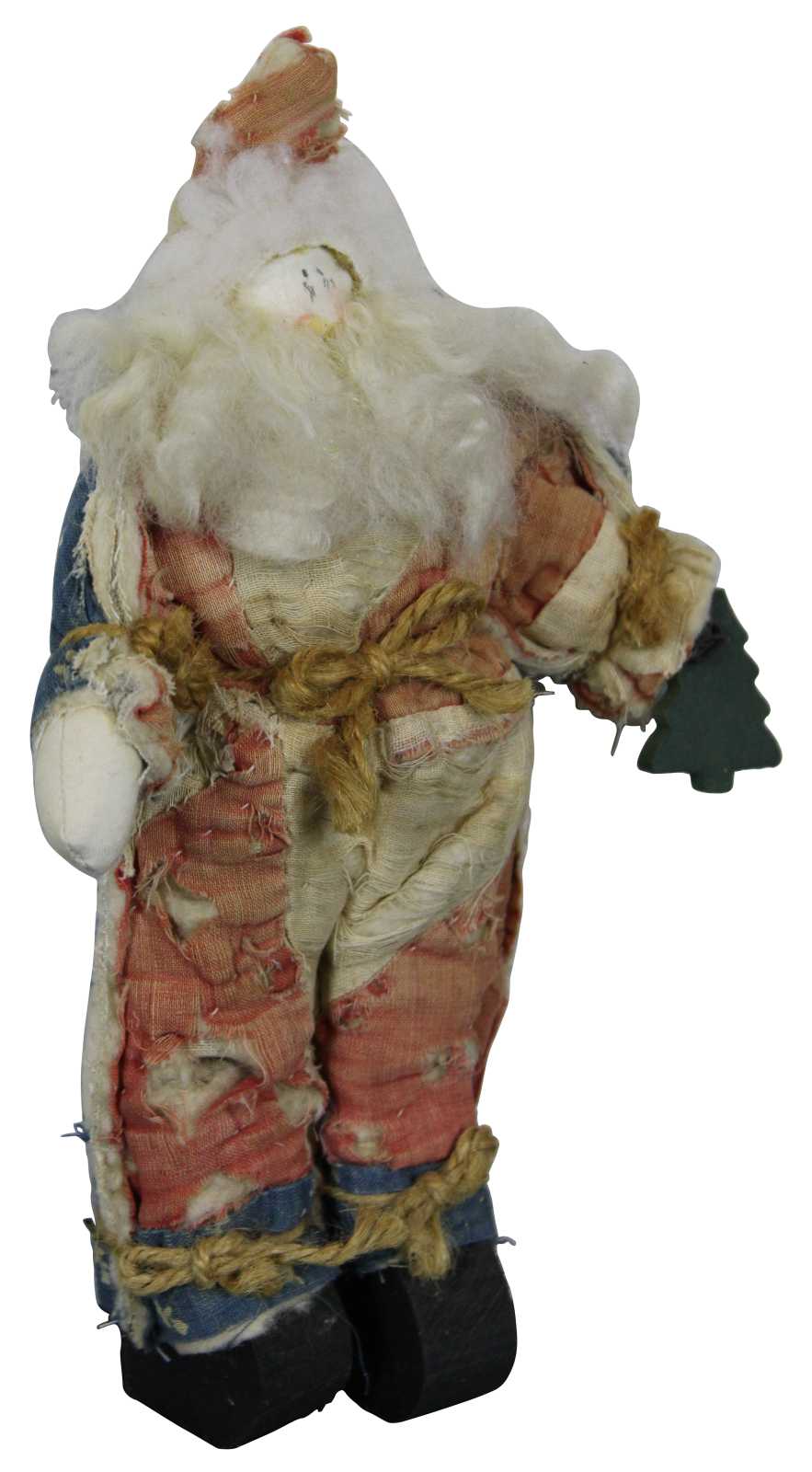 Antique handmade primitive folk art Santa Claus doll with hand drawn face, quilted suit, wooden shoes, and holding a mini air freshener style Christmas tree.