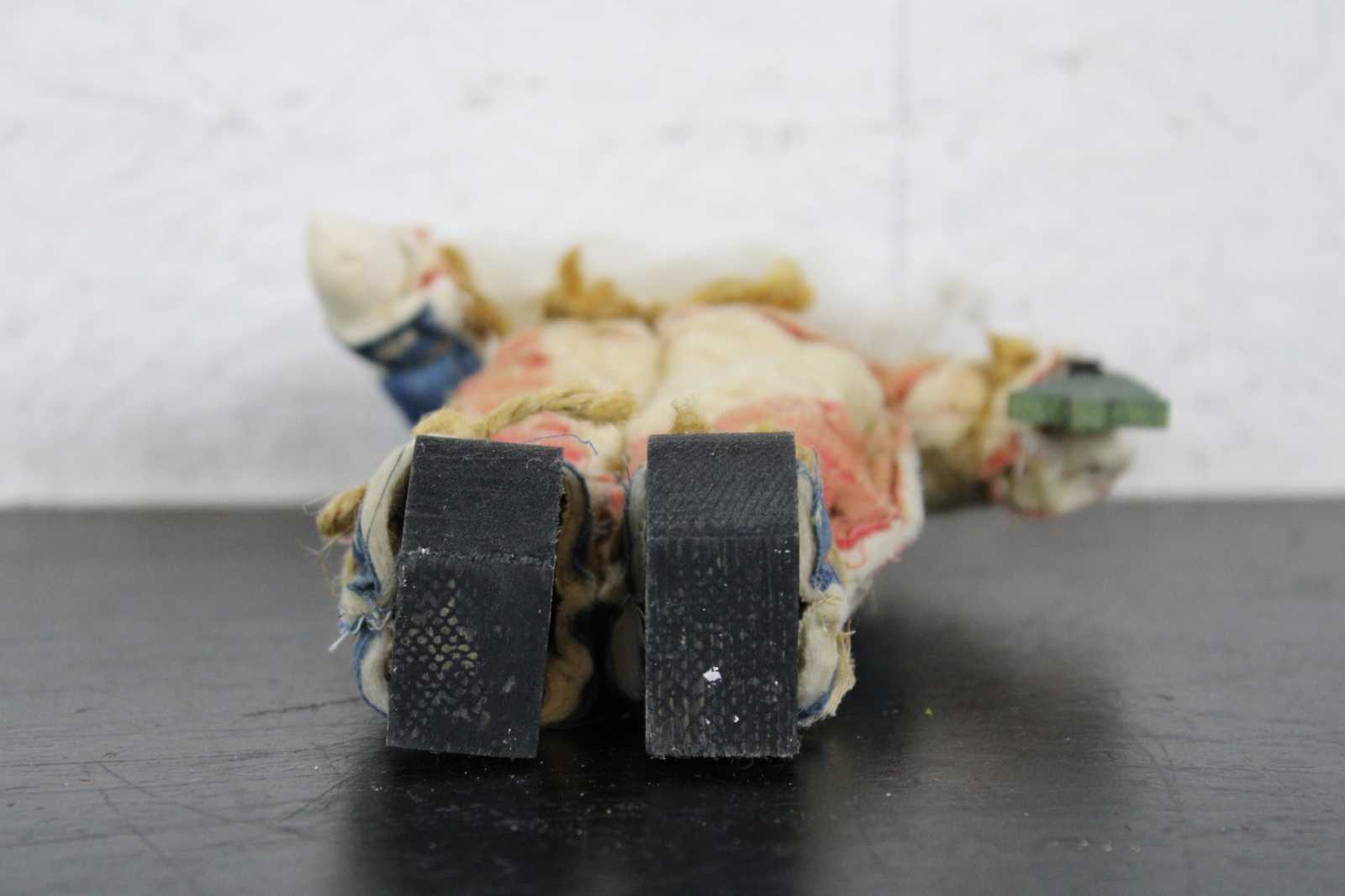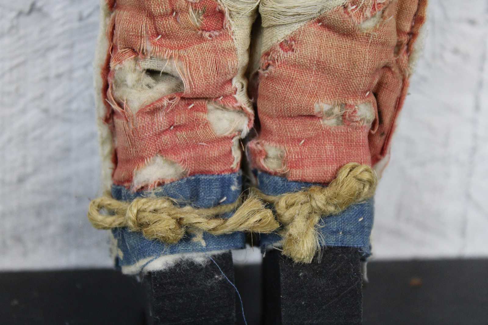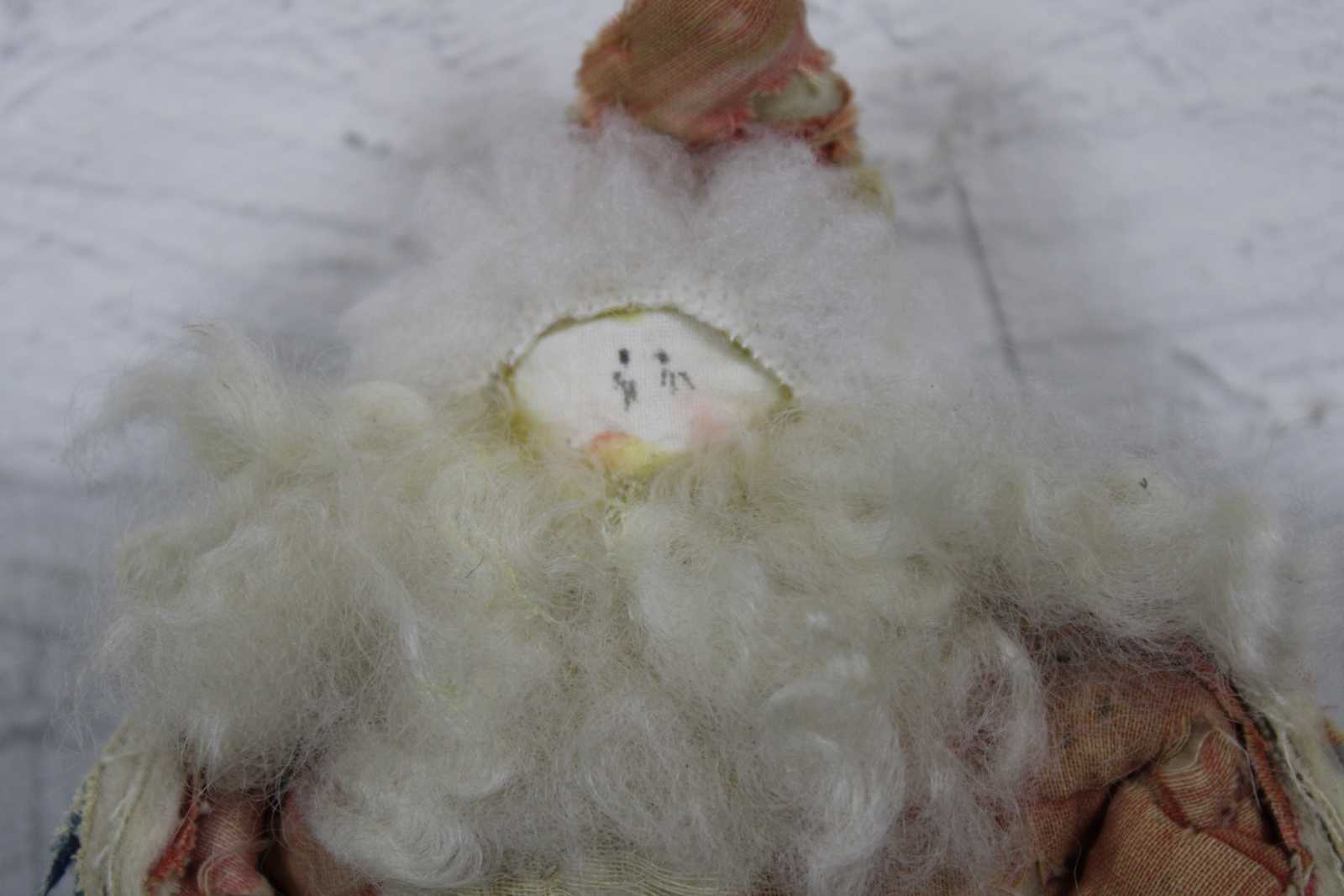 Antique handmade primitive folk art Santa Claus doll with hand drawn face, quilted suit, wooden shoes, and holding a mini air freshener style Christmas tree.