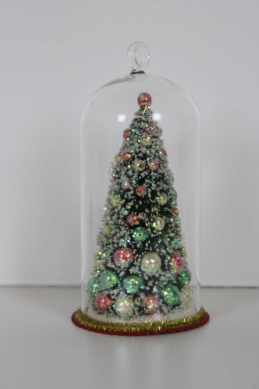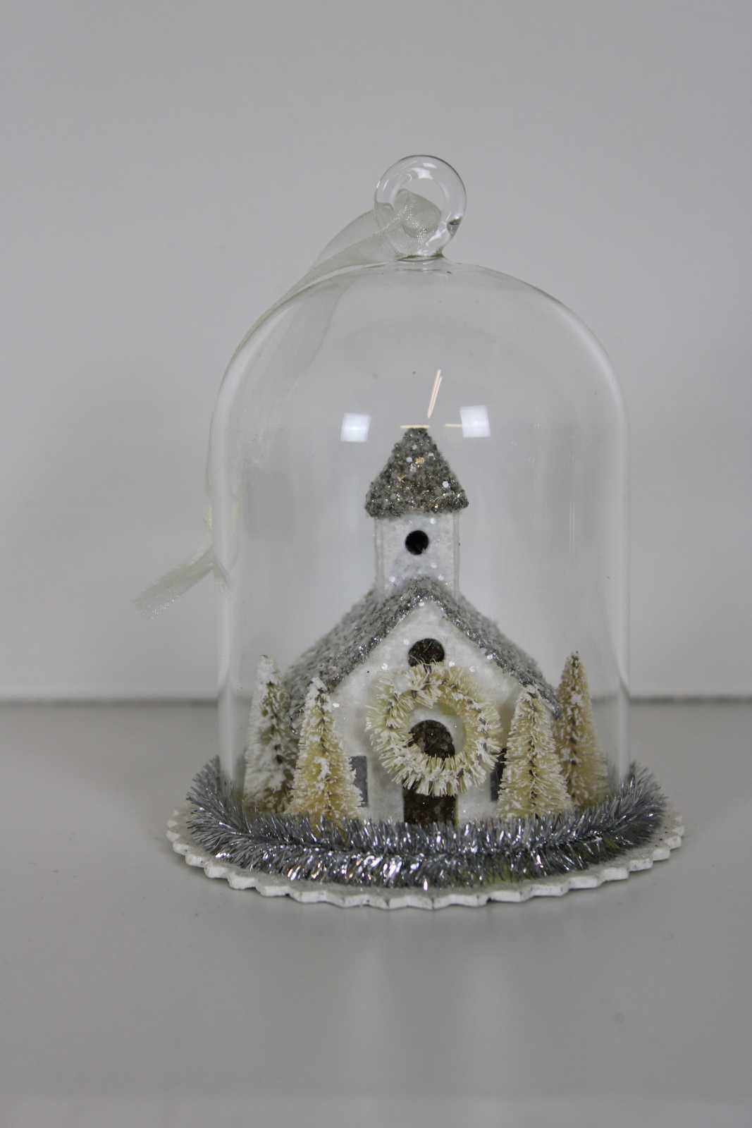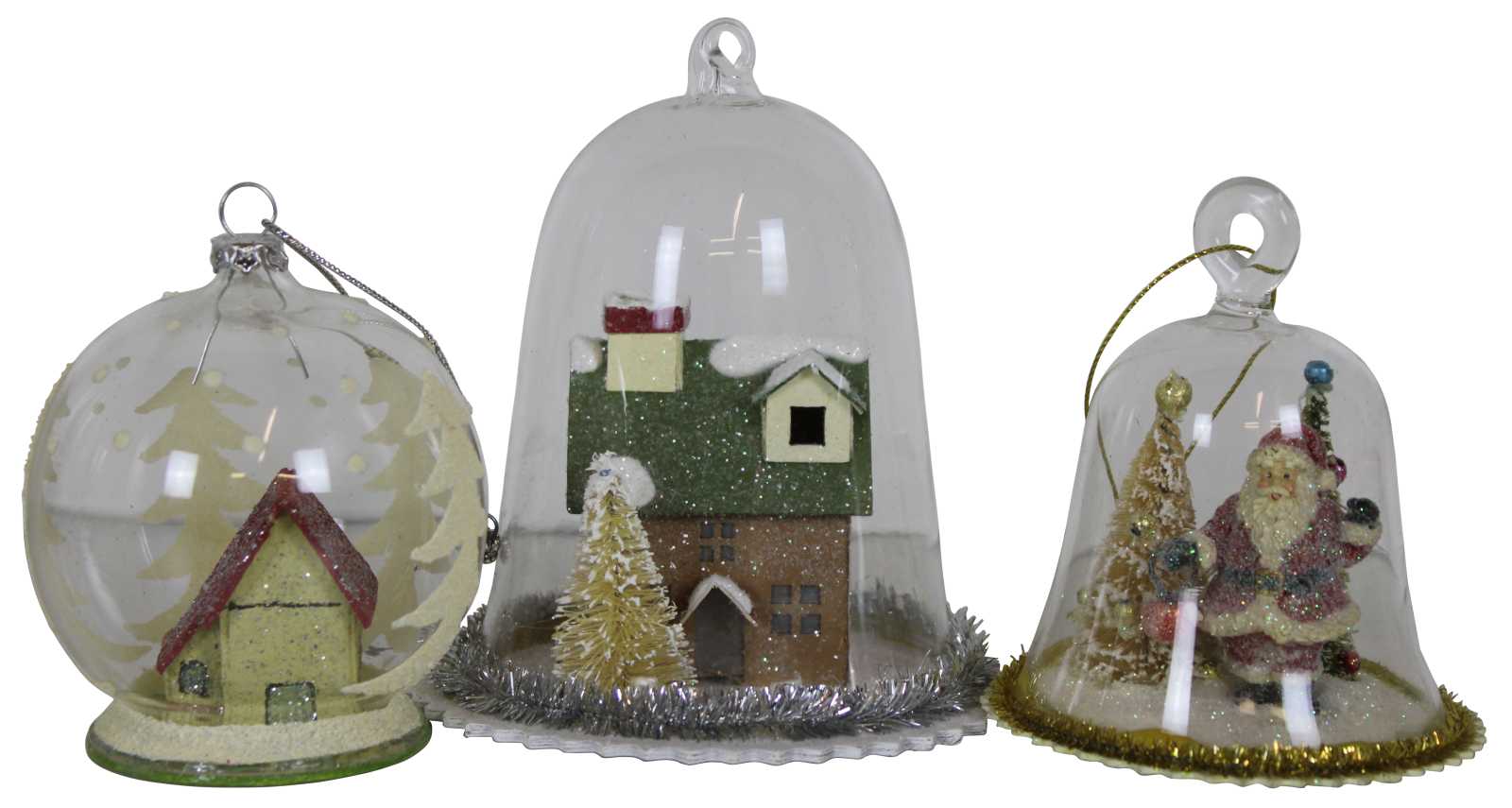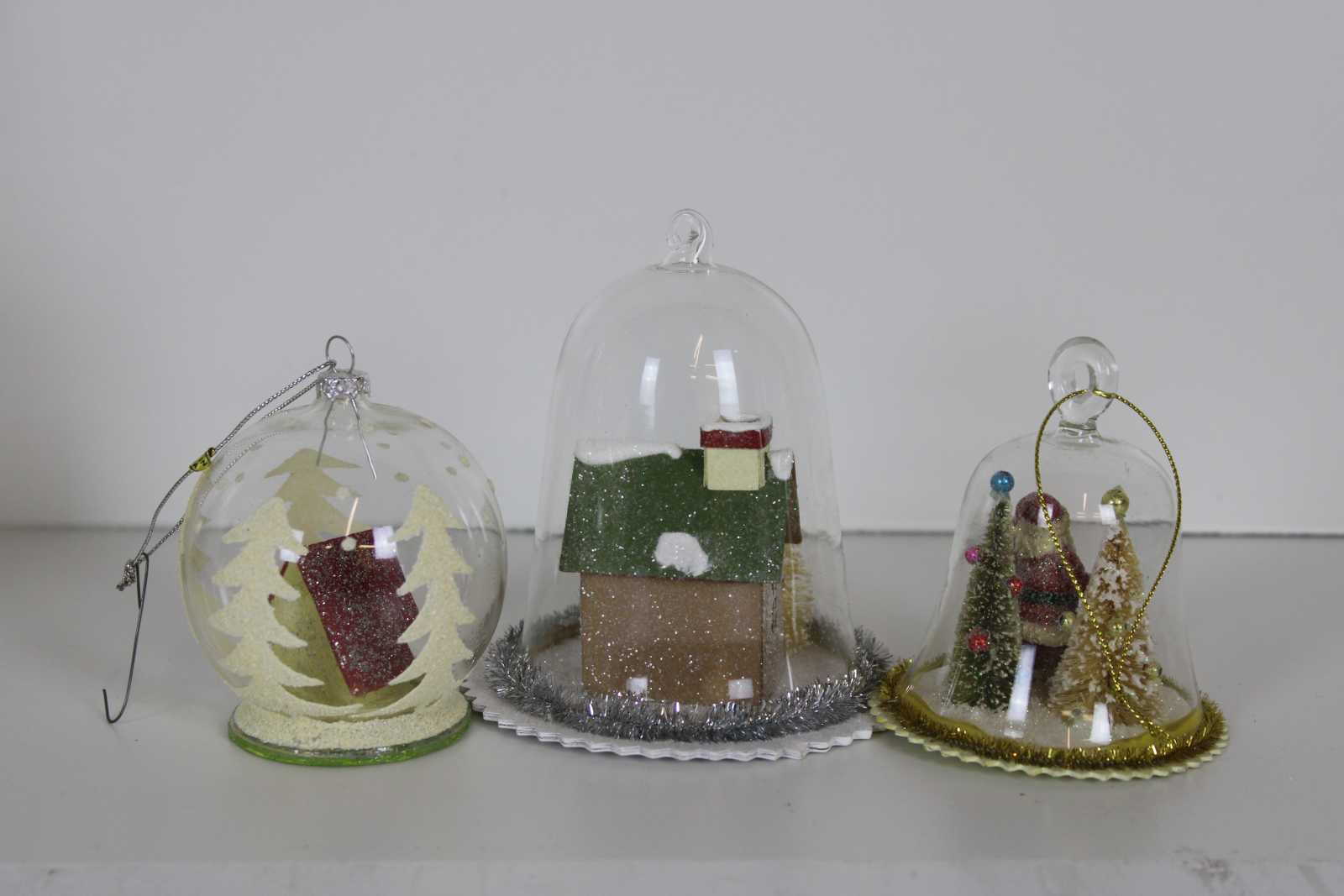 Set of six vintage inspired Christmas ornaments with small scenes and objects encased in glass tableau bell jars.