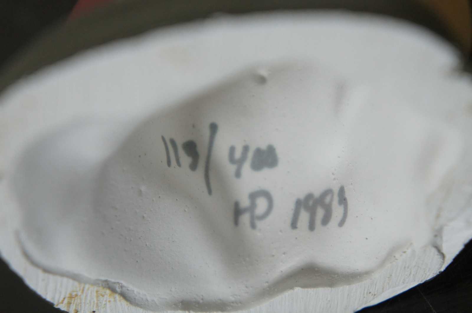 1983 porcelain Santa Claus figurine numbered 113/400, wearing a red robe and holding a large burlap sack and a small piece of evergreen.