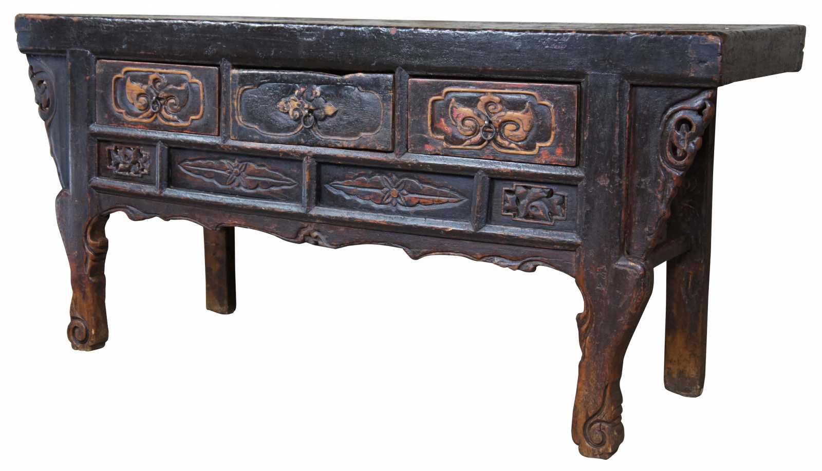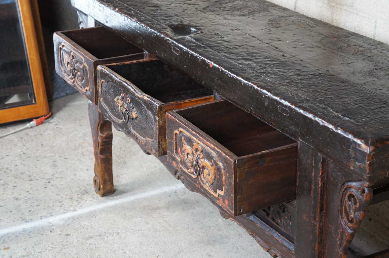 Circa 1850s Ming inspired Altar coffer or console table. Hand carved with a lacquered leather like upper surface. Features 3 drawers for storage and an open area underneath.
