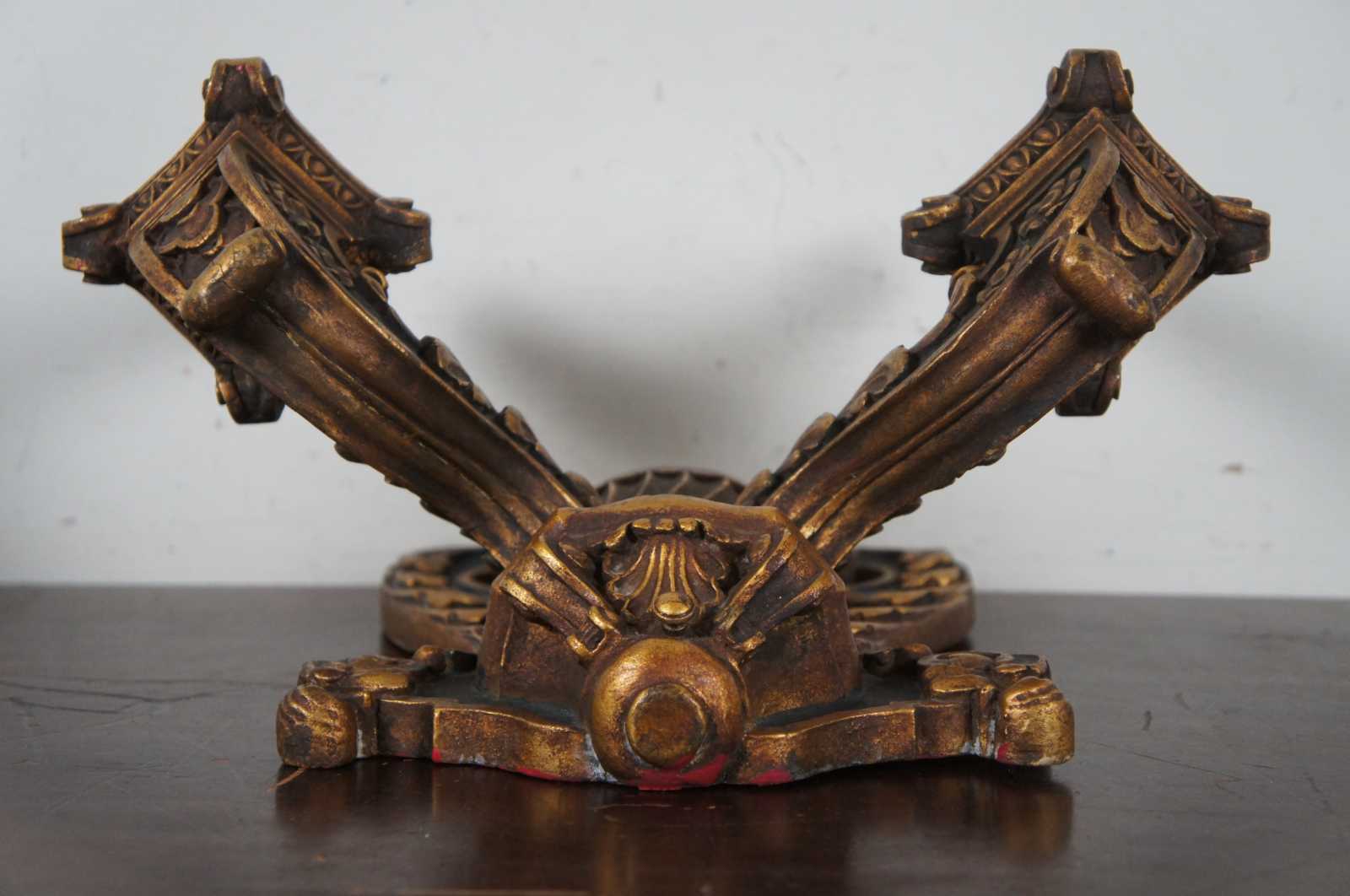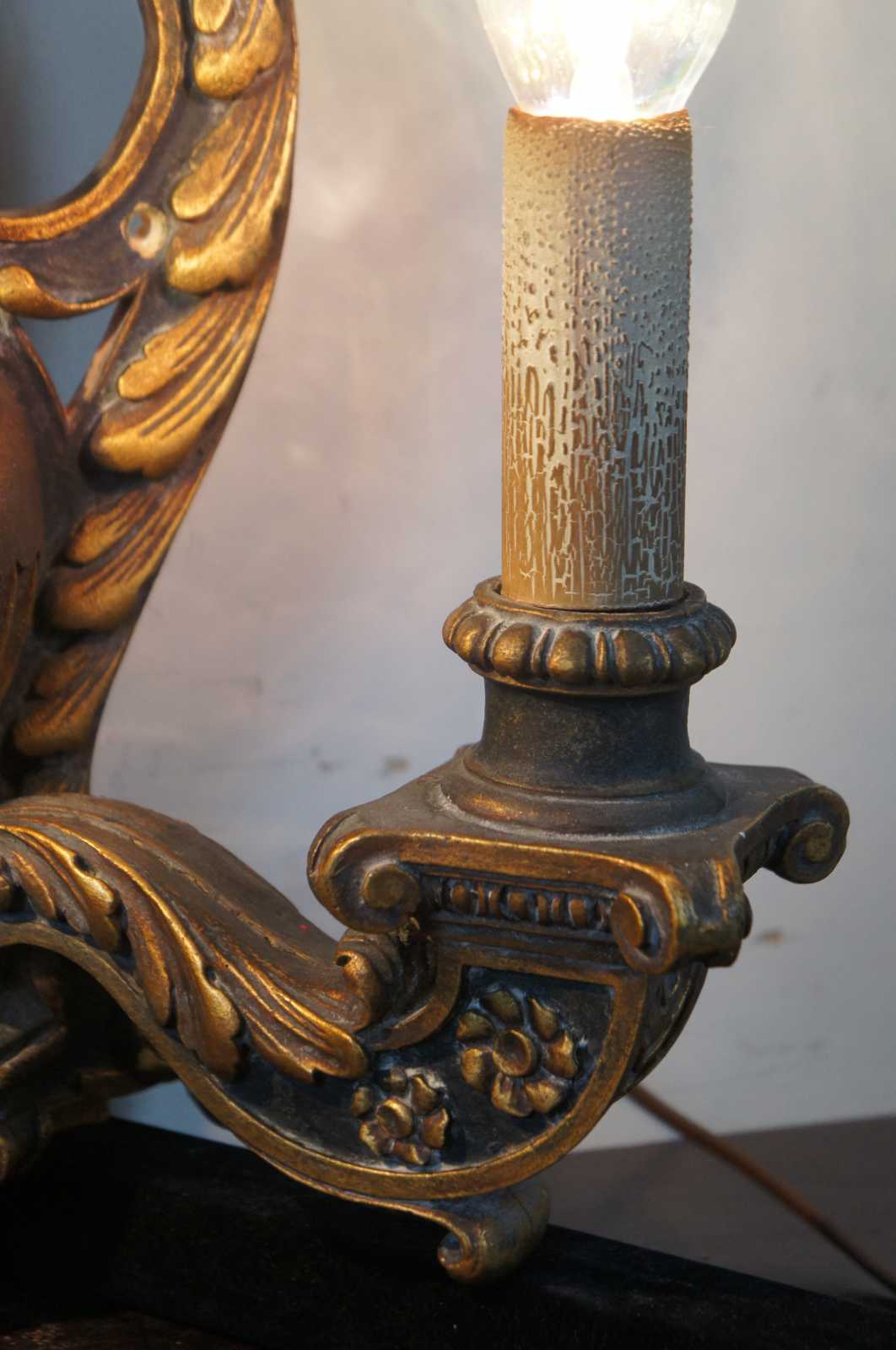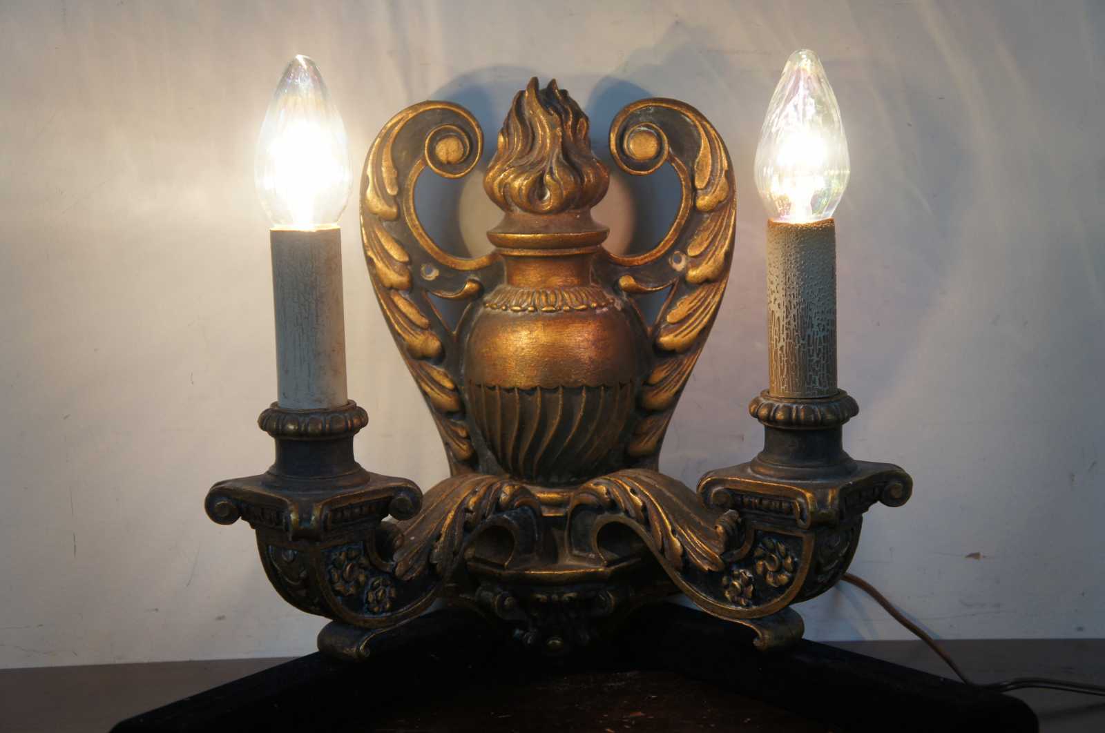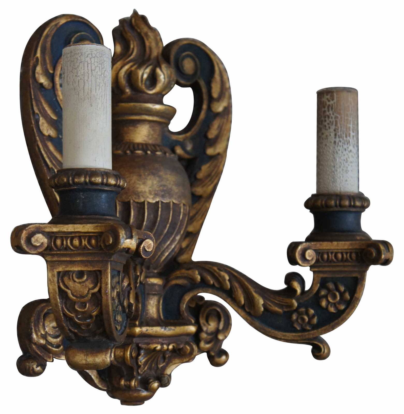 Circa 1910 baroque revival electric wall sconces in the shape of black and gold (Dore) wall mounted candlesticks decorated with leaves, flowers and a flaming urn.