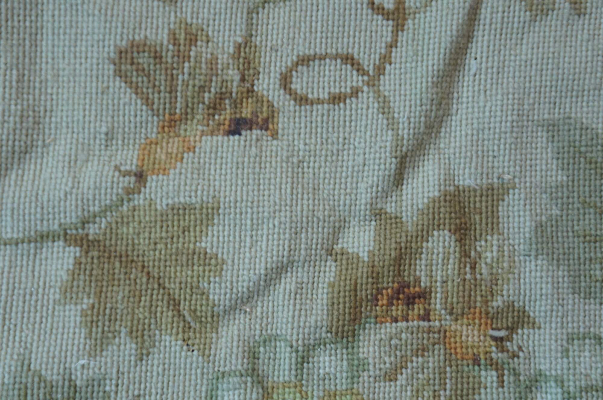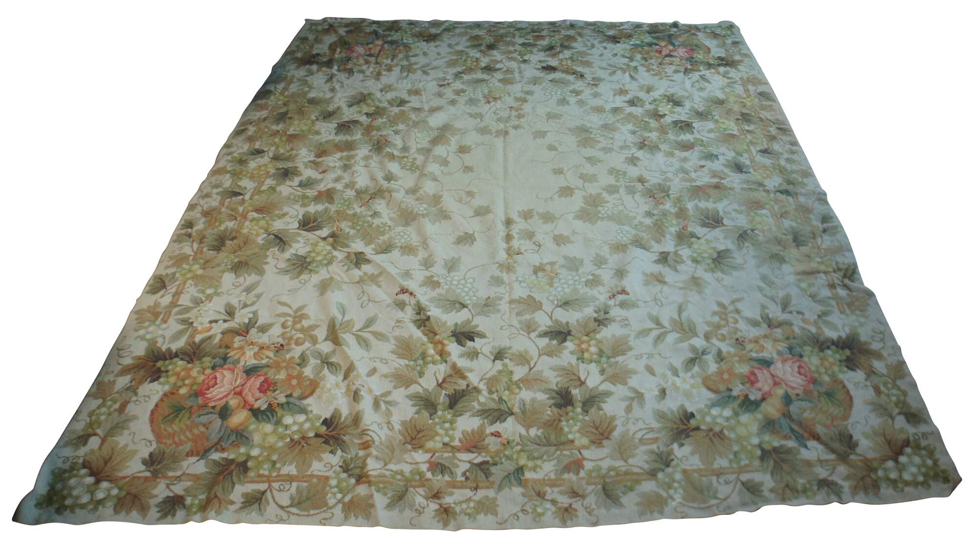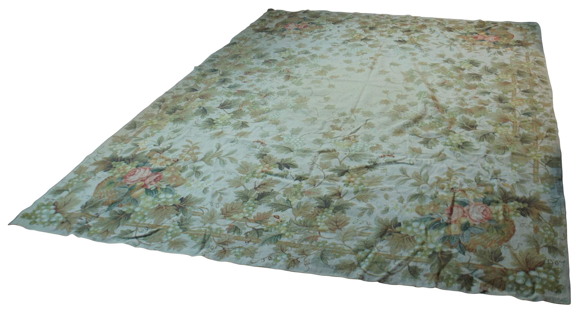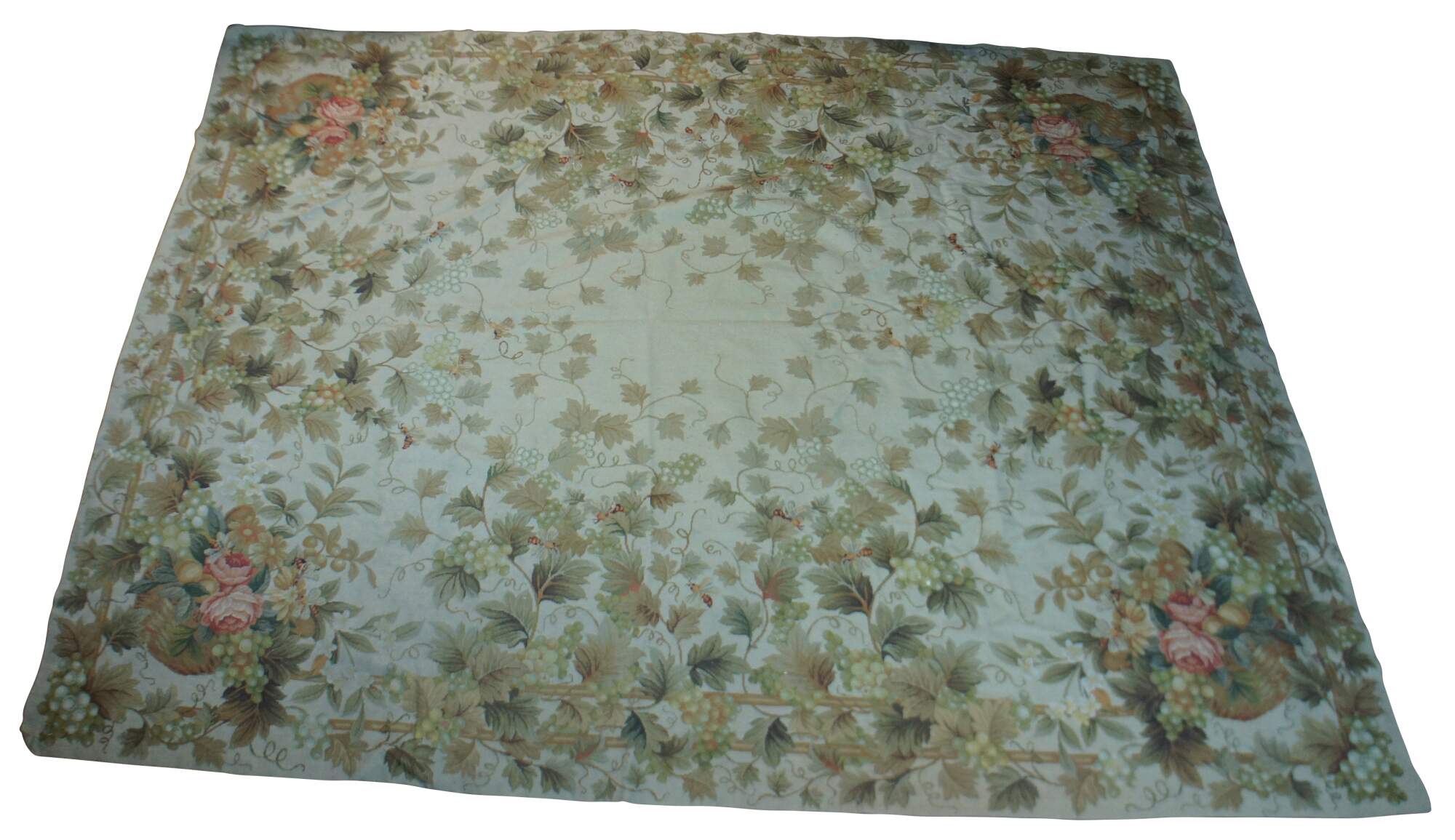 Large antique French aubusson needlepoint tapestry featuring a design of grape vines and leaves, with bees buzzing among the foliage and baskets of roses at the corners.