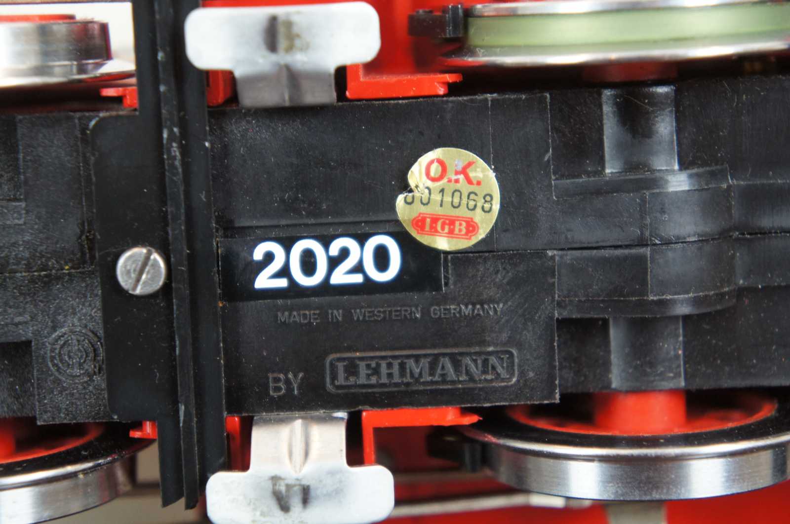 1980’s Lehmann-Gross-Bahn 2020 Stainz 2 steam locomotive for the G scale 21988 Circus Train. Letzte HU 22.6.64 chassis painted in red and white with conductor driving.