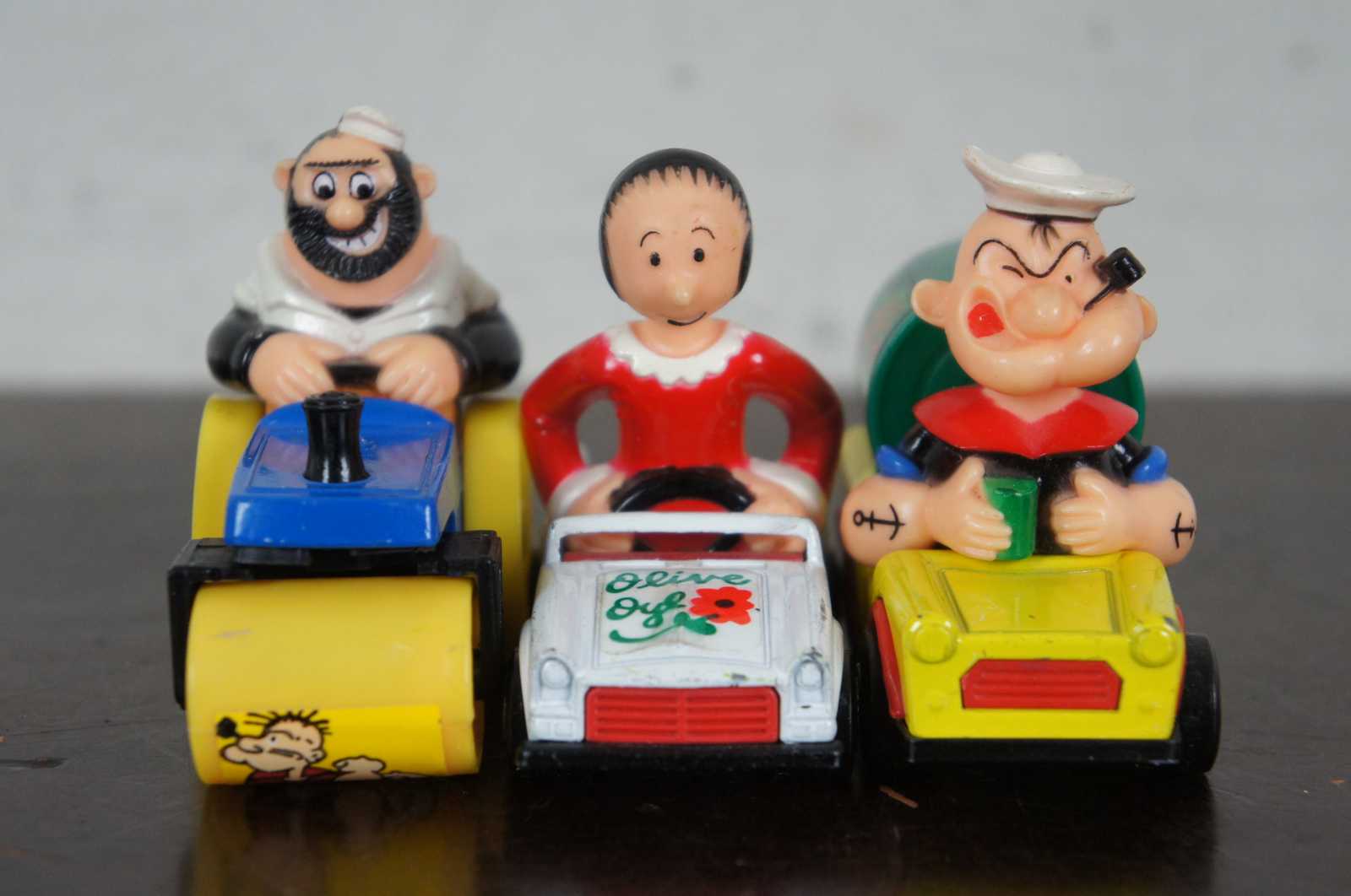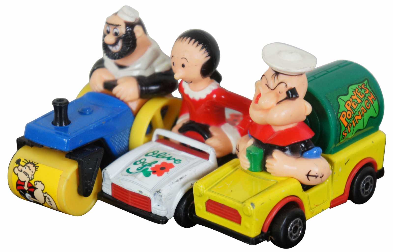 Vintage 1980 Matchbox character series die cast cars by Lesney, featuring No. 13 Popeye the Sailor Man and his spinach wagon, No. 14 Bluto and his road roller, and No. 15 Olive Oyl in her convertivle sports car.