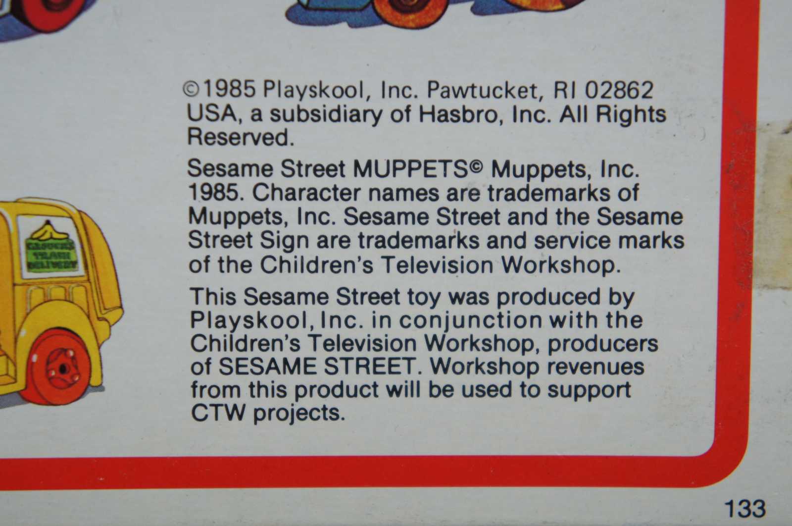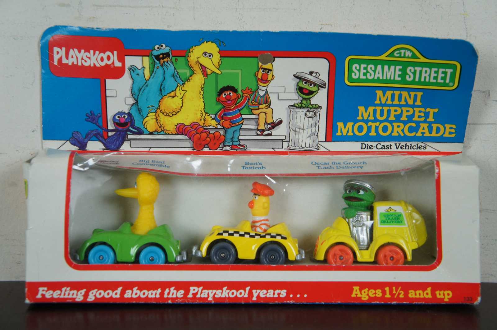 3 Playskool Sesame Street Mini Muppet Motorcade die cast vehicle sets from 1985; includes two sets with Big Bird Convertible, Bert’s Taxicab and Oscar the Grouch Trash Delivery and one set of Ernie’s Fire Engine, Cookie Monster Express and Big Bird’s Popcorn Machine.