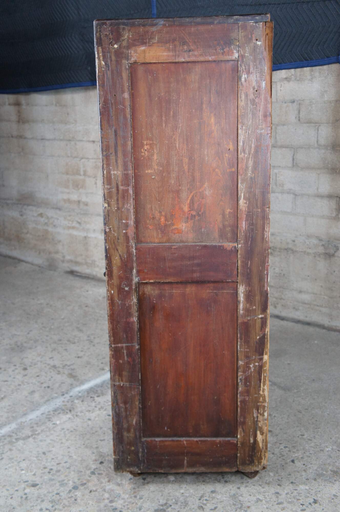 Wear and distressing commensurate age.  Some missing drawers that have been replaced.  Those that have been replaced were replaced with two traditional drawer along the lower left as well as longer wood panels to cover the missing drawer above.  Missing one drawer, no glides on the bottom left drawers.