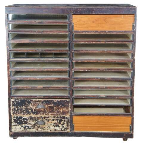 Wear and distressing commensurate age. Some missing drawers that have been replaced. Those that have been replaced were replaced with two traditional drawer along the lower left as well as longer wood panels to cover the missing drawer above. Missing one drawer, no glides on the bottom left drawers.