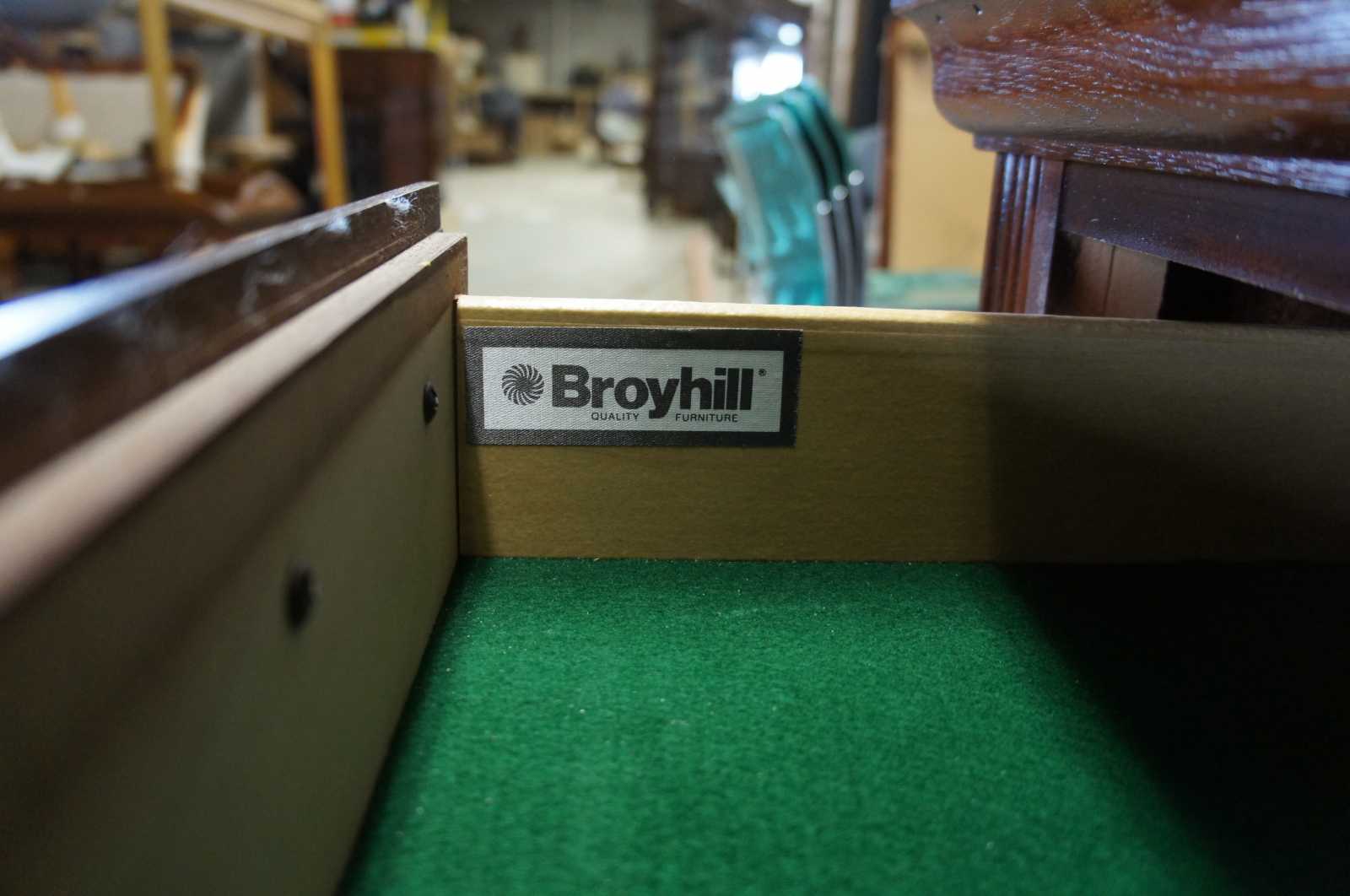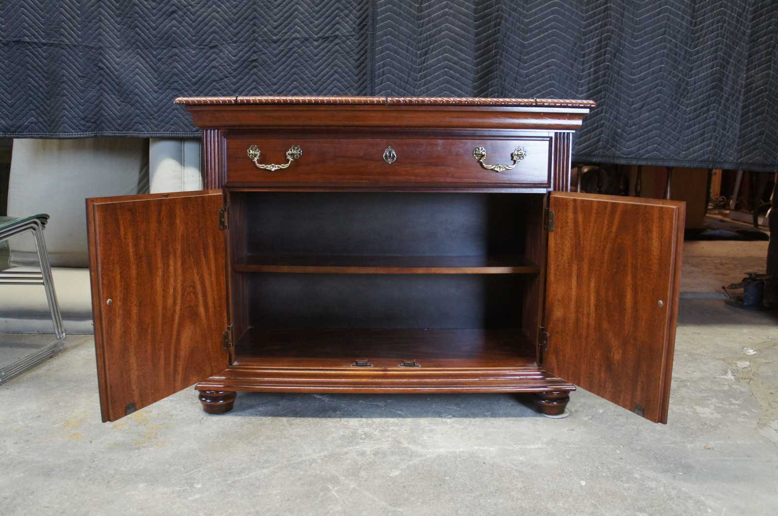 Chippendale style server by Broyhill Furniture, 512-5265-13. Made from mahogany with flame mahogany cabinet doors. Features a flip top with laminant surface, gadrooning, reeded siding and bun feet. Opens to a lower shelf. Upper drawer is felt lined.