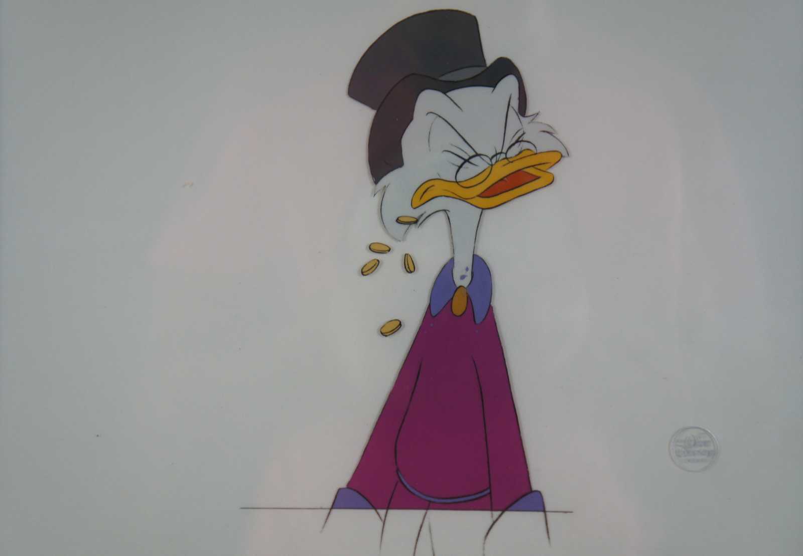 Walt Disney 1987 original production animation cel from the film Sport Goofy featuring Scrooge McDuck of DuckTales fame being hit in the face with a handful of coins. Includes certificate of authenticity.