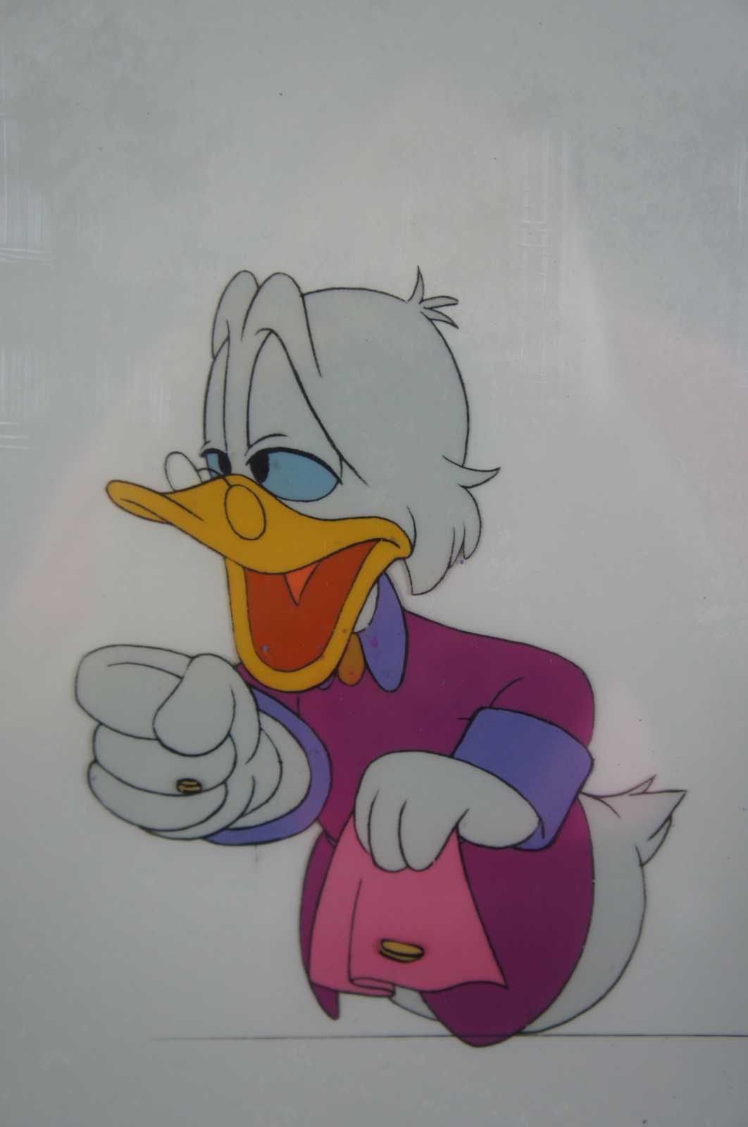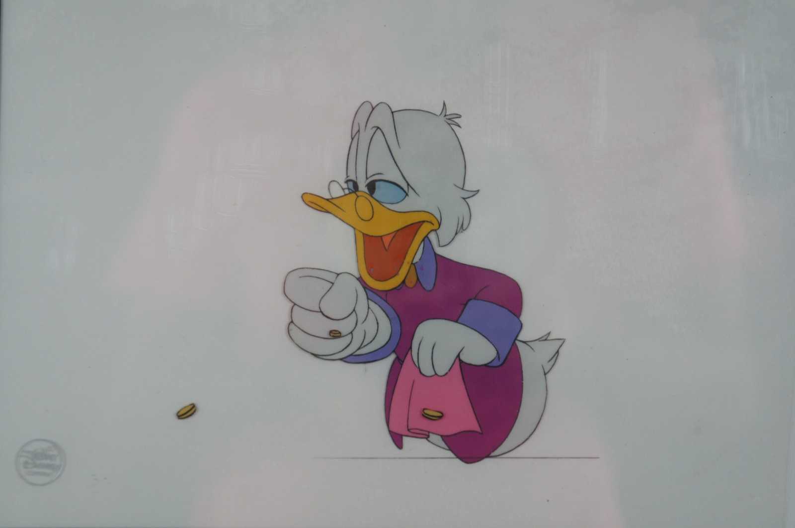 Walt Disney 1987 original animation cel “Sport Goofy Soccer Mania” from the television special “An All-New Adventure of Disney’s Sport Goofy” featuring Scrooge McDuck of Ducktales fame holding a pink handkerchief.