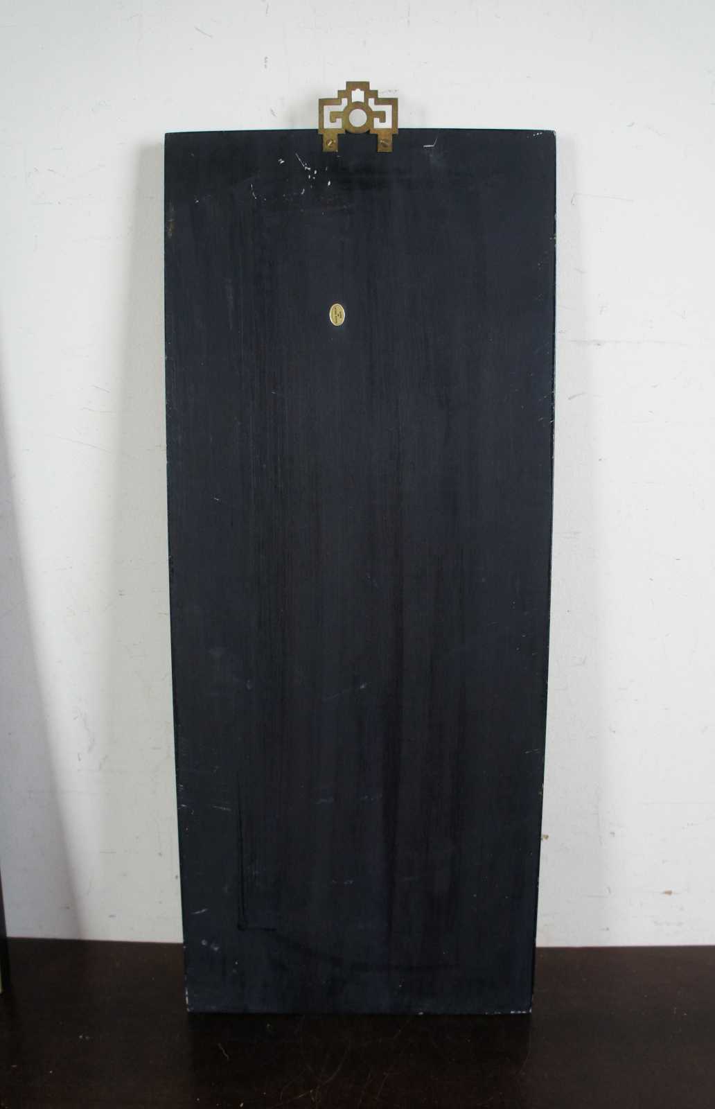 Set of two vintage black lacquer wall hanging panels featuring Chinese female figures in soapstone with gold painted borders and white lined backgrounds.