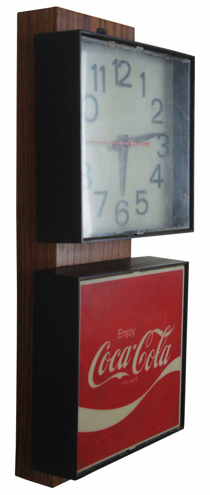 Vintage 1970’s Coca-Cola wall clock with light up clock face and brand logo mounted on a wood block; manufactured by Ingress-Plastene Division, Model G017.