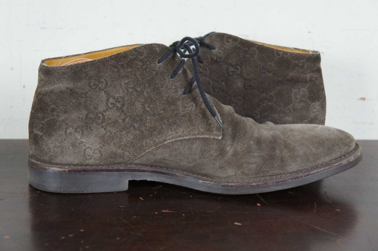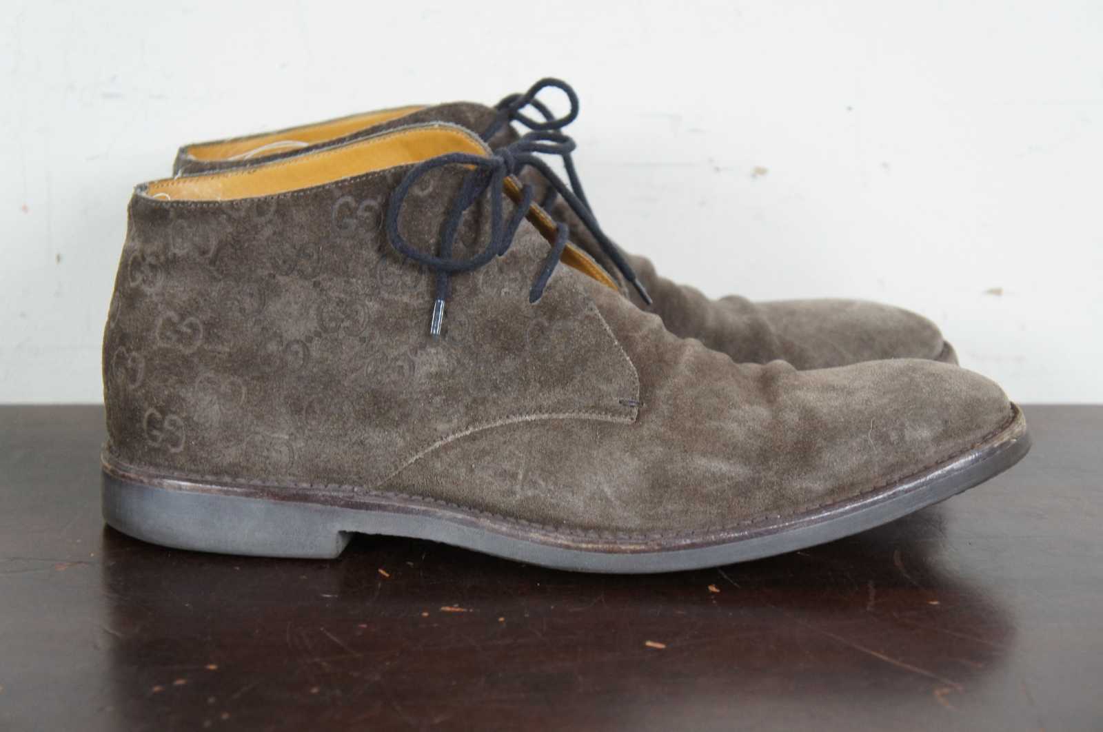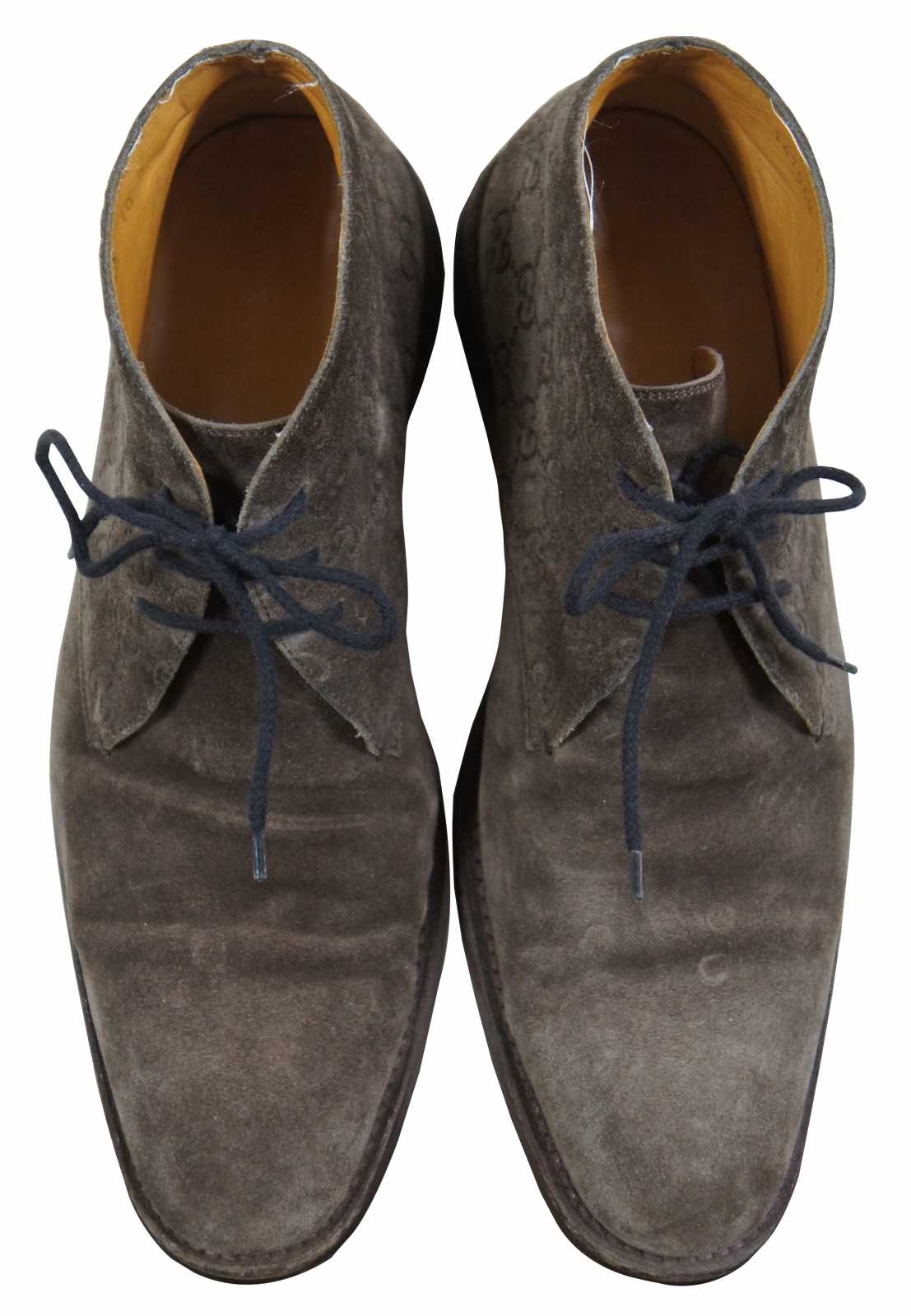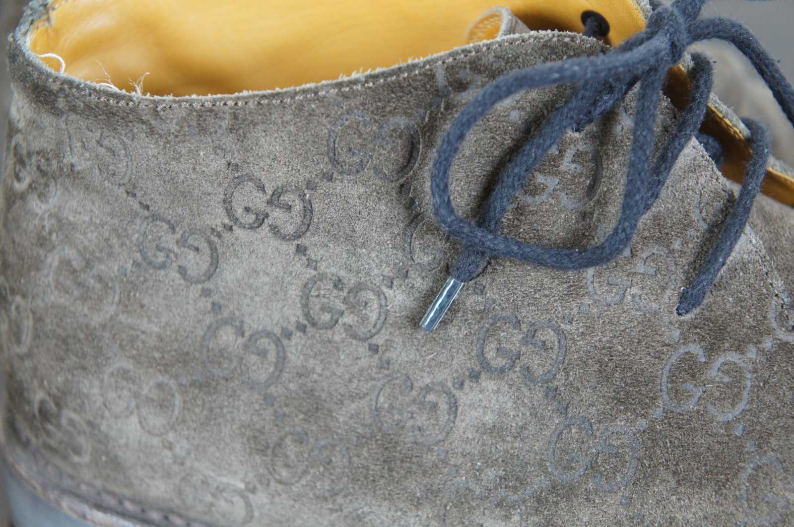 Gucci men’s lace up ankle boot 147548 in Antiqua Suede monogrammed leather, color Smoke (beige).