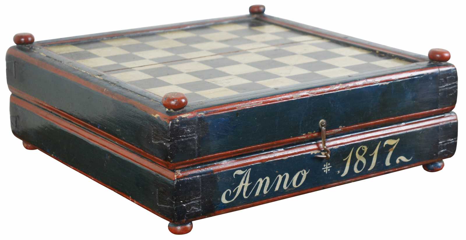 Primitive 19th Century antique game board featuring chess, checkers, backgammon and nine man morris. The board is hand painted and detailed anno 1817, footed on both sides with bun feet and opens to backgammon playing surface.