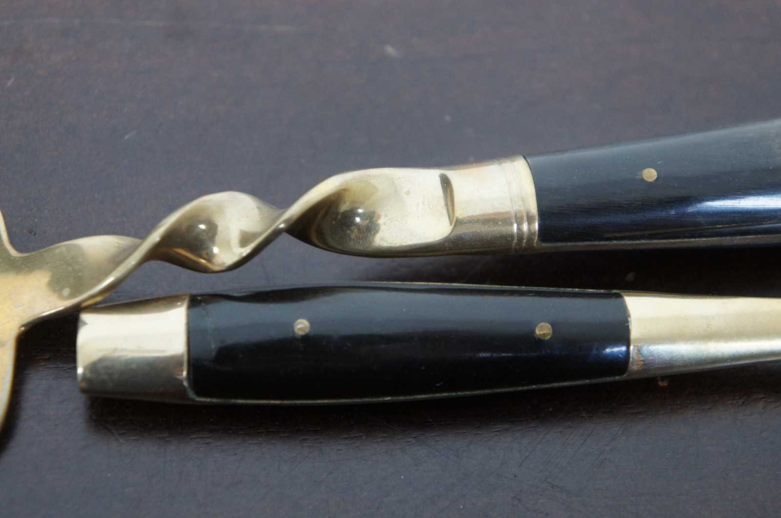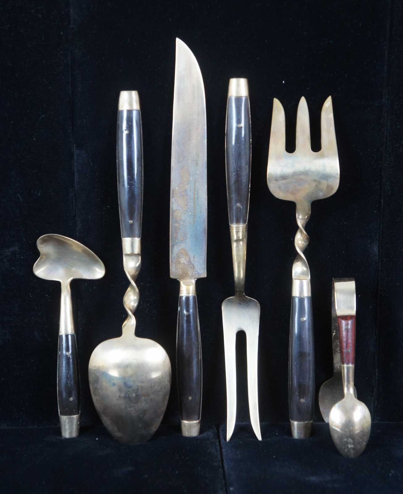 Vintage mid century 30 piece set of bronzeware cutlery and serving pieces with dark rosewood handles and velvet lined storage case.