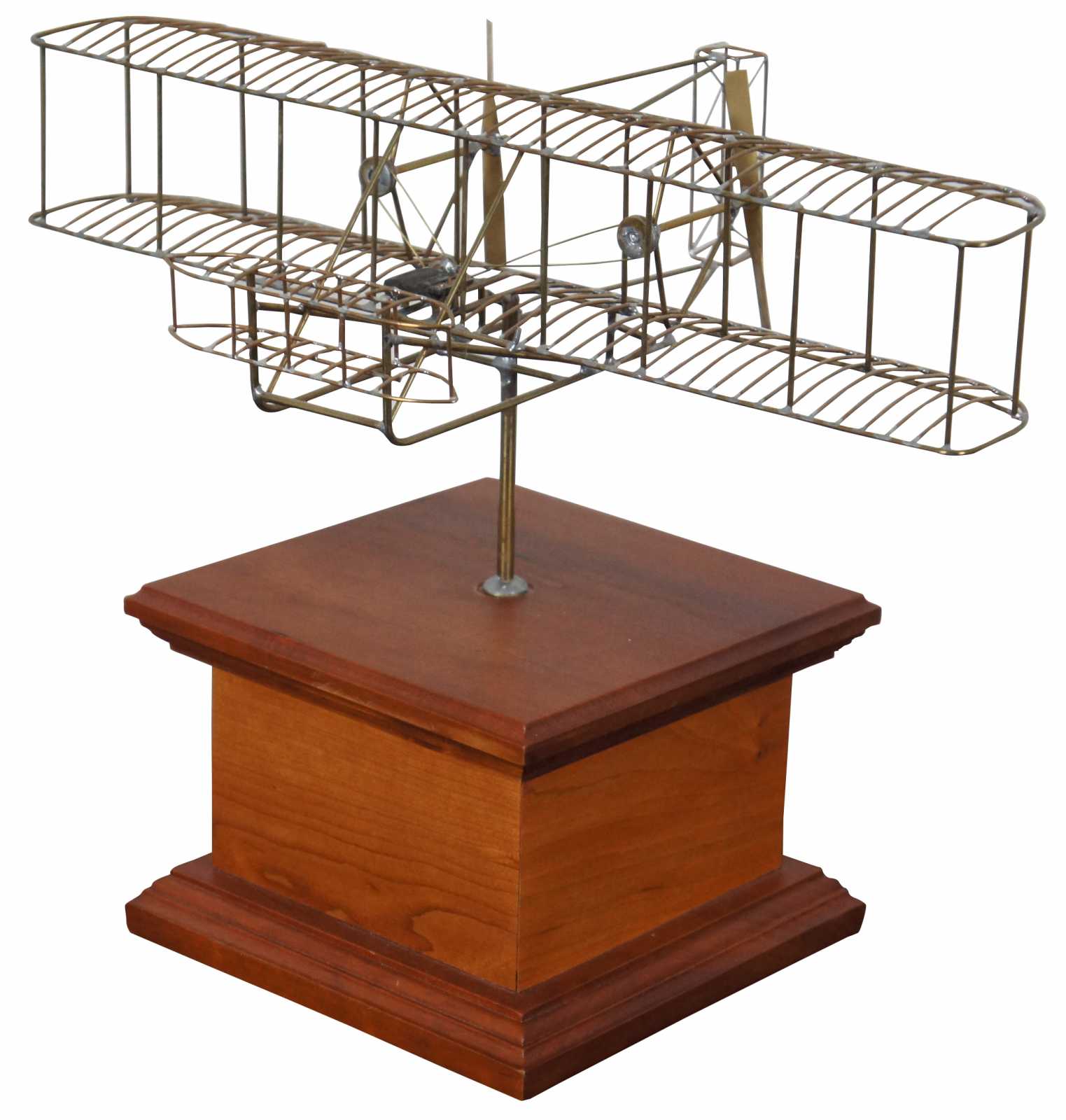 Vintage desktop sculpture in brass wire of the Wright Flyer airplane suspended above a wood base. This plane was originally made famous by the Wright Brothers of Dayton Ohio, which made first flight in Kitty Hawk North Carolina.