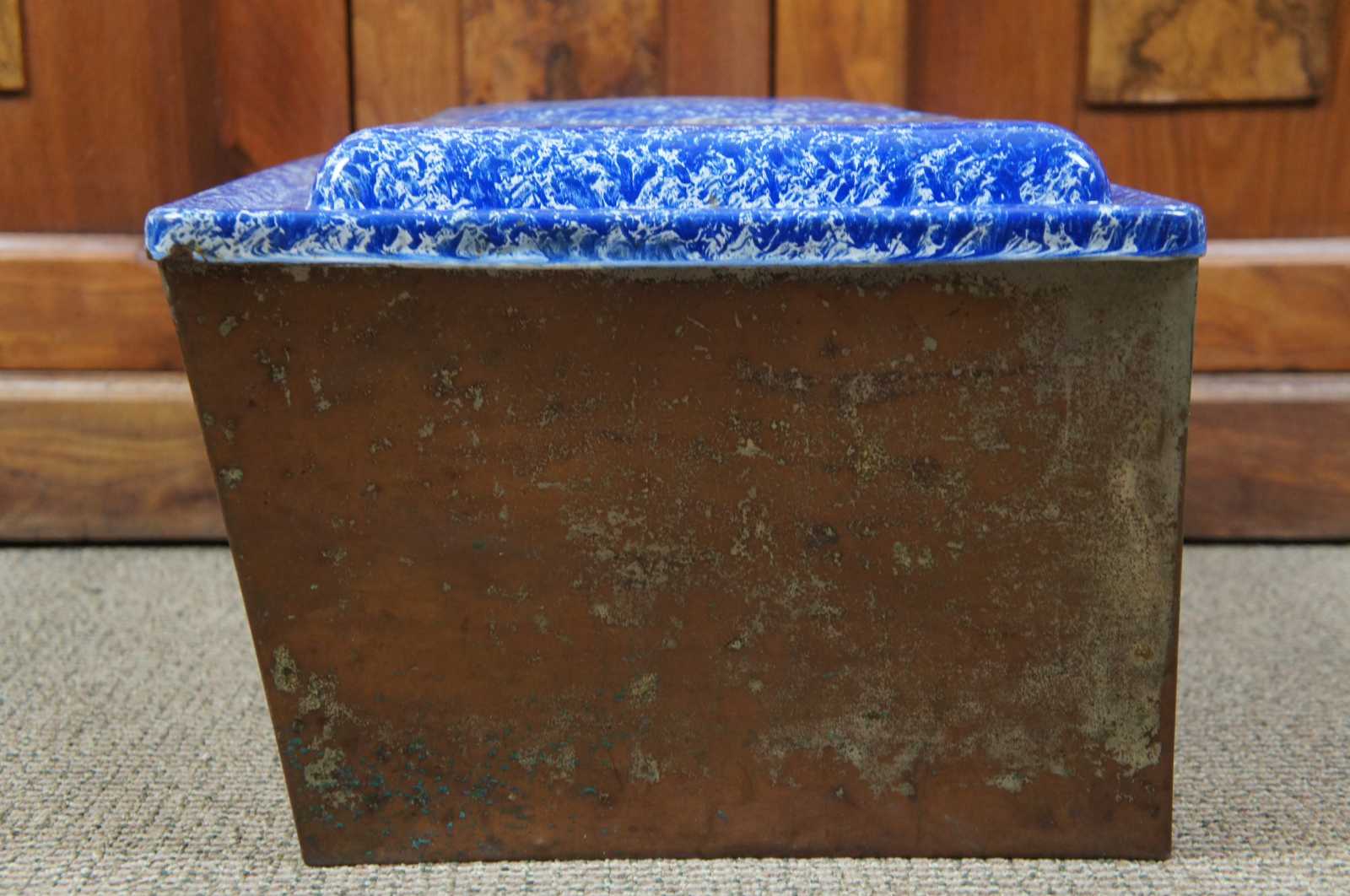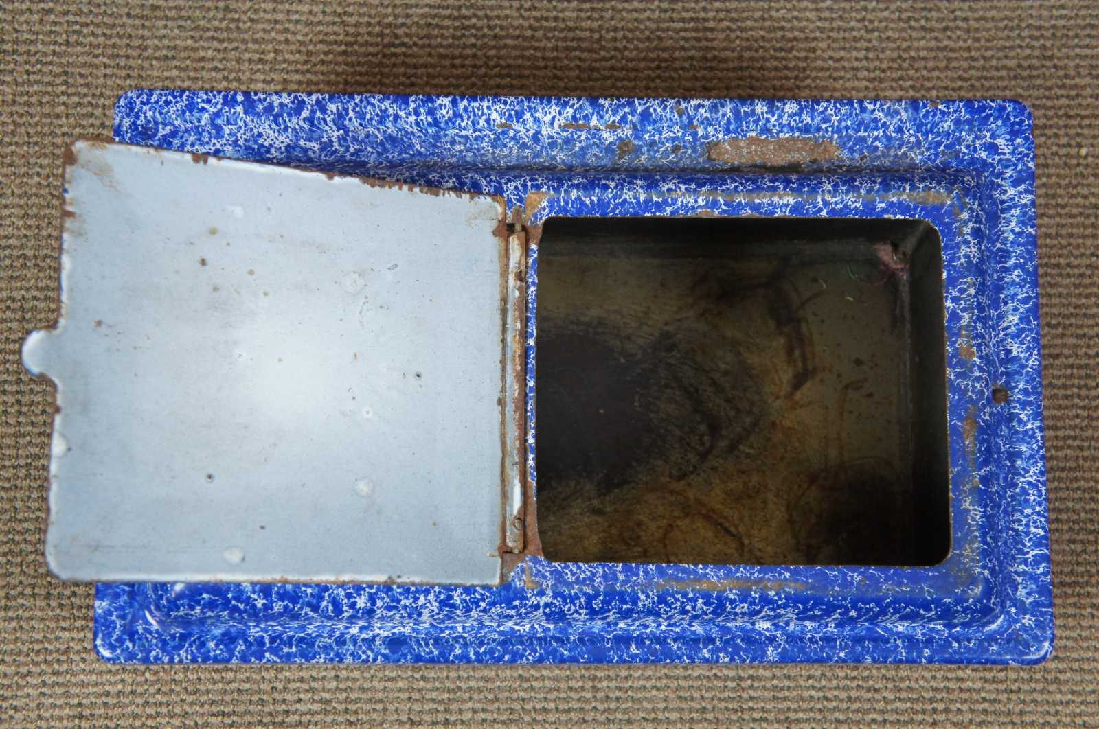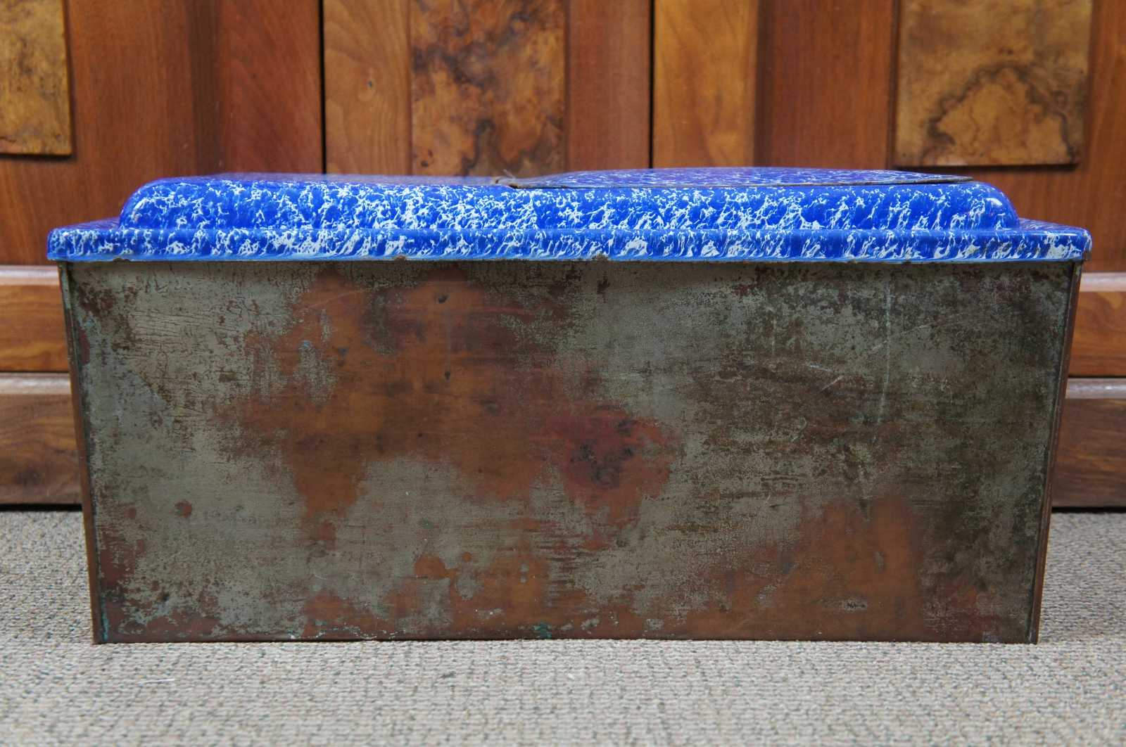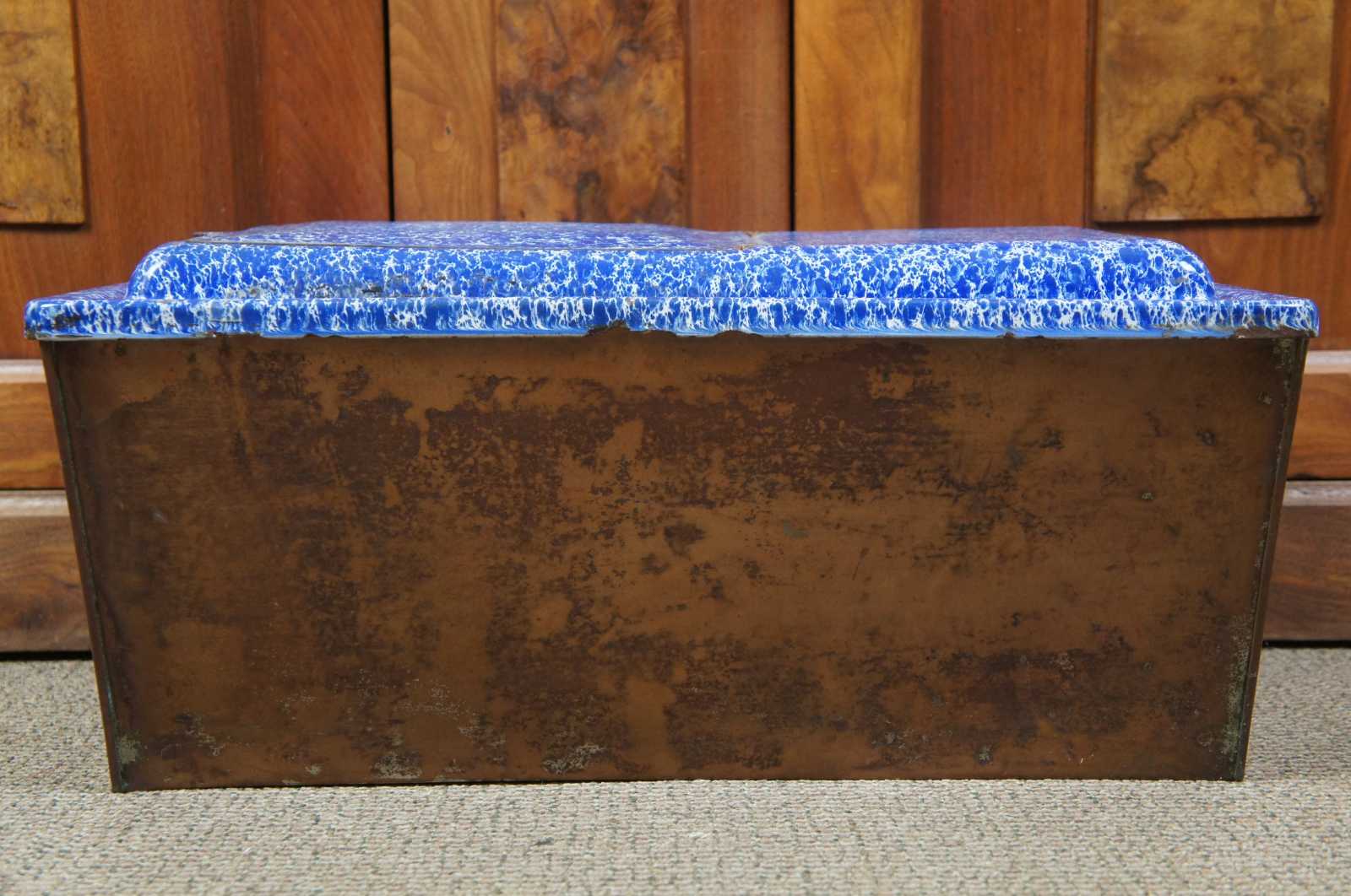 Antique graniteware / spatterware field oven cookware pot or bin. Features a blue and white marbled enamel lid with flip top hatch. Made of tin.