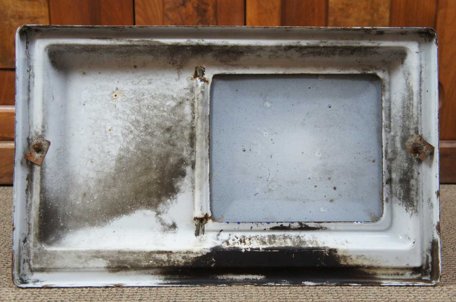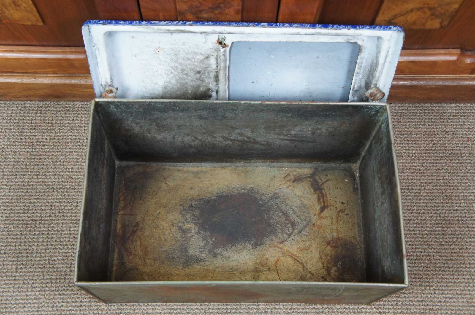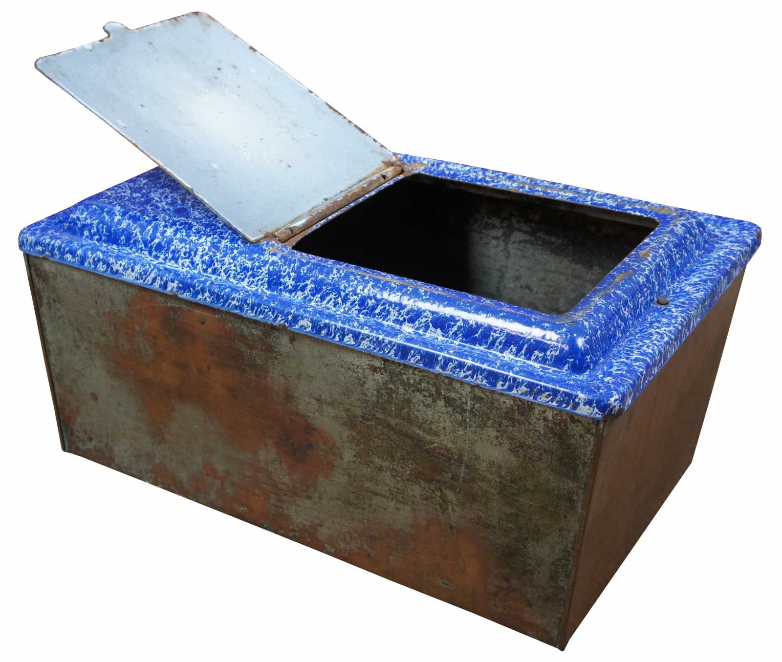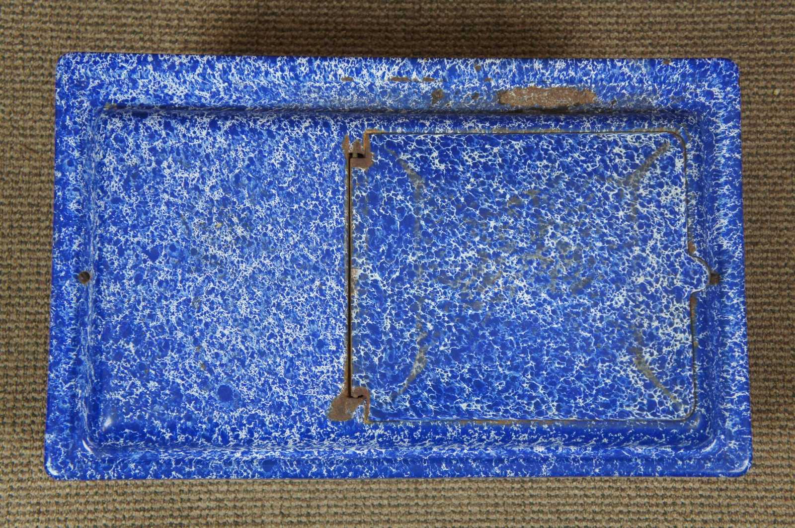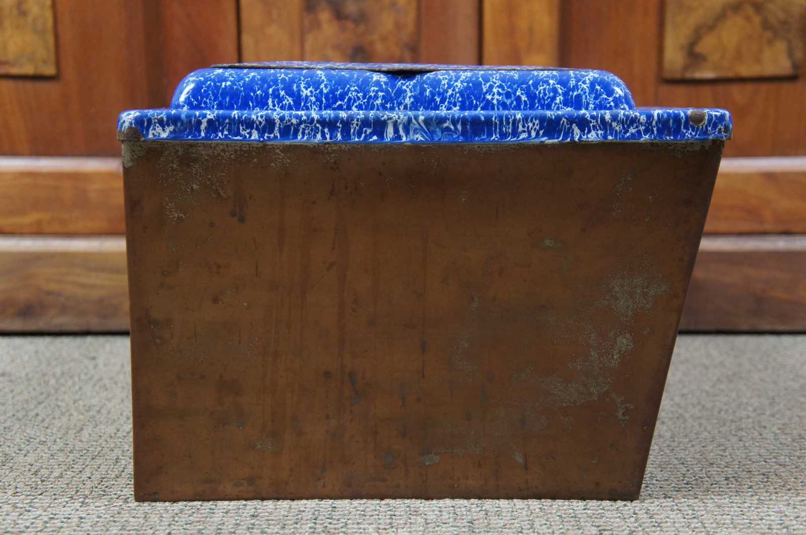 Antique graniteware / spatterware field oven cookware pot or bin. Features a blue and white marbled enamel lid with flip top hatch. Made of tin.